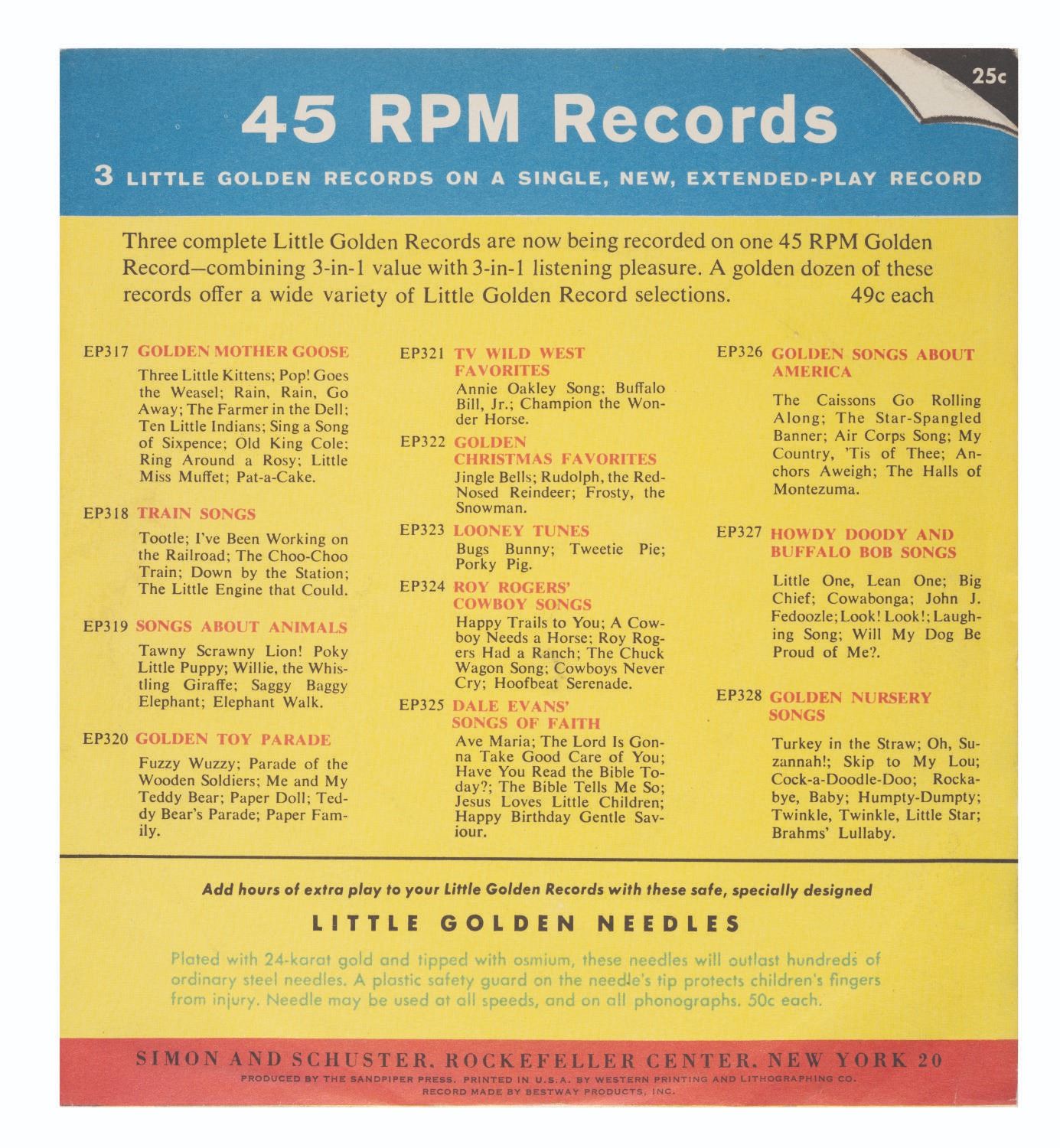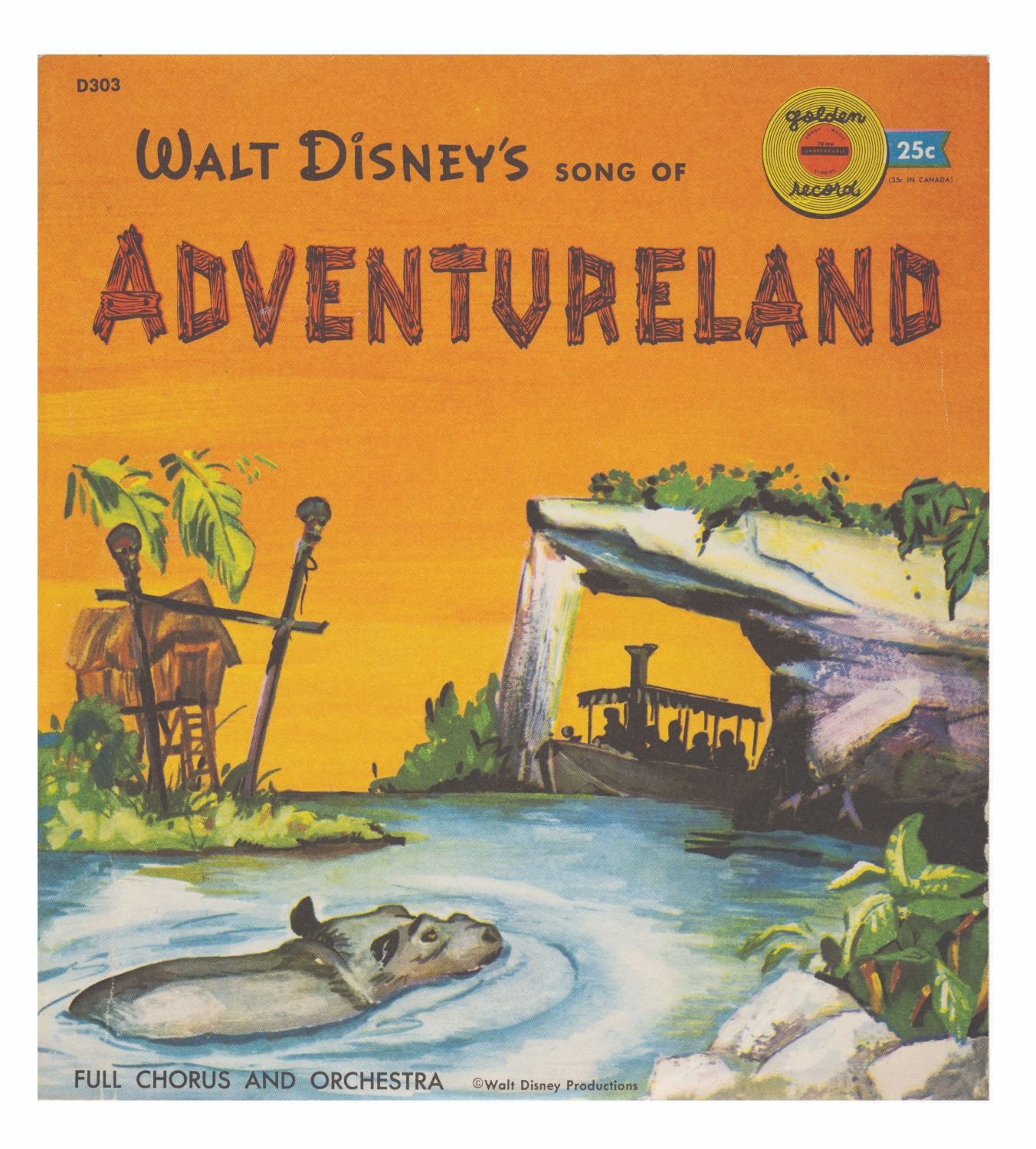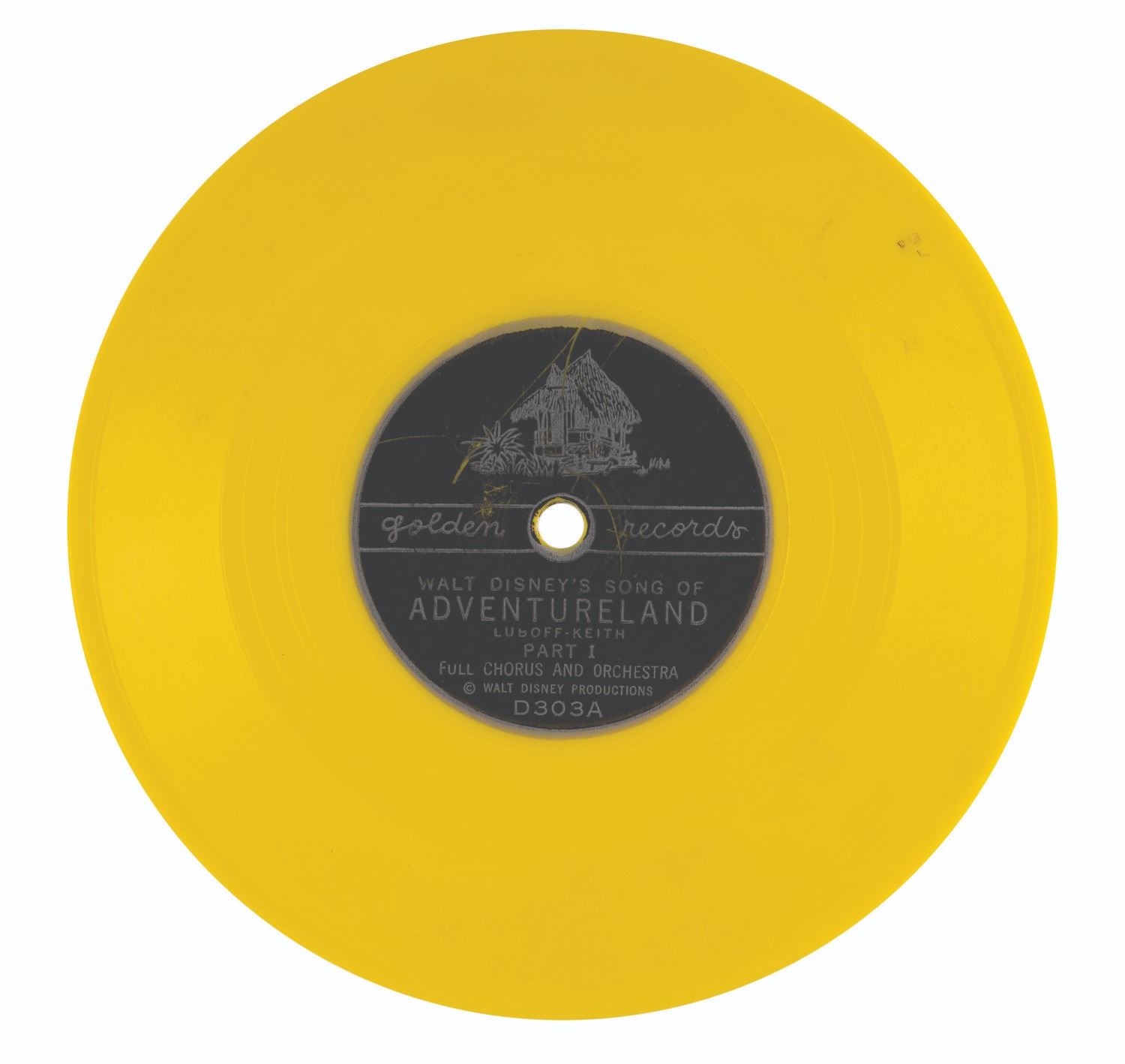 (Disneyland, 1956) A 45rpm "Walt Disney's Song of Adventureland" Little Golden Record. This double-sided record features Part I and II of the unique song (composed and arranged by Luboff-Keith) performed by a full chorus and orchestra. Measuring 6" in a 6.75"x7" sleeve, this record is in very good condition with a few scuffs and minor wear to the plastic record and sleeve.