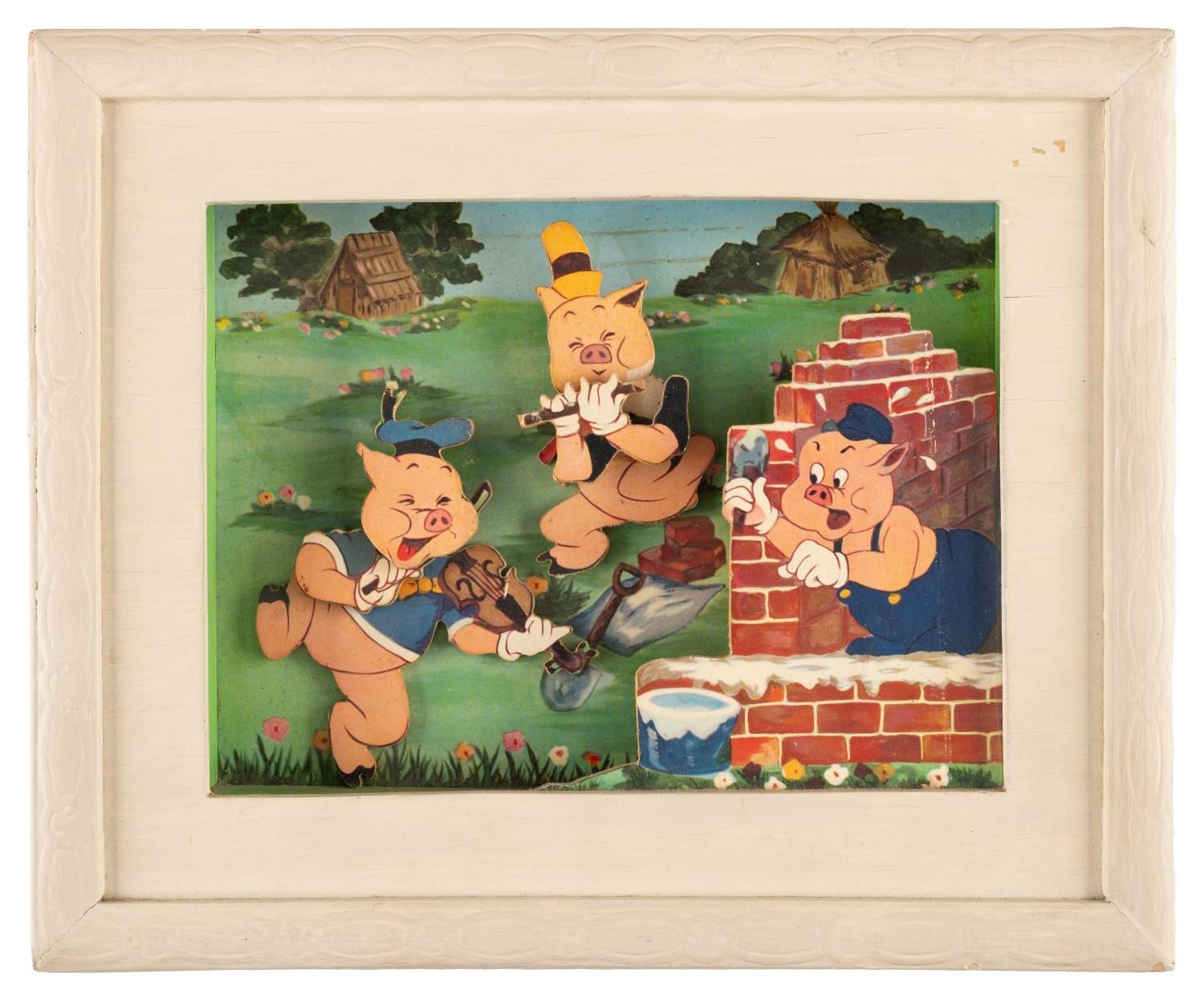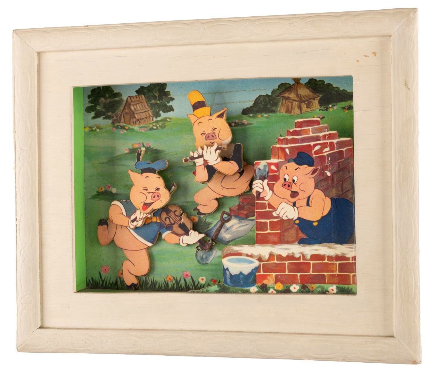(Jaymar, 1940s) A Three Pigs animated shadowbox by Jaymar Specialty Company featuring the stars of Walt Disney's Silly Symphony short film. Fifer and Fiddler Pig animate and play their instruments with the pull of the cord. The function of this piece has been tested and is functioning. Measuring 11.75"x9.75"x3", this wooden novelty decoration is in good condition exhibiting spots of discoloration, wear throughout, and a loose head to the Fifer figure.