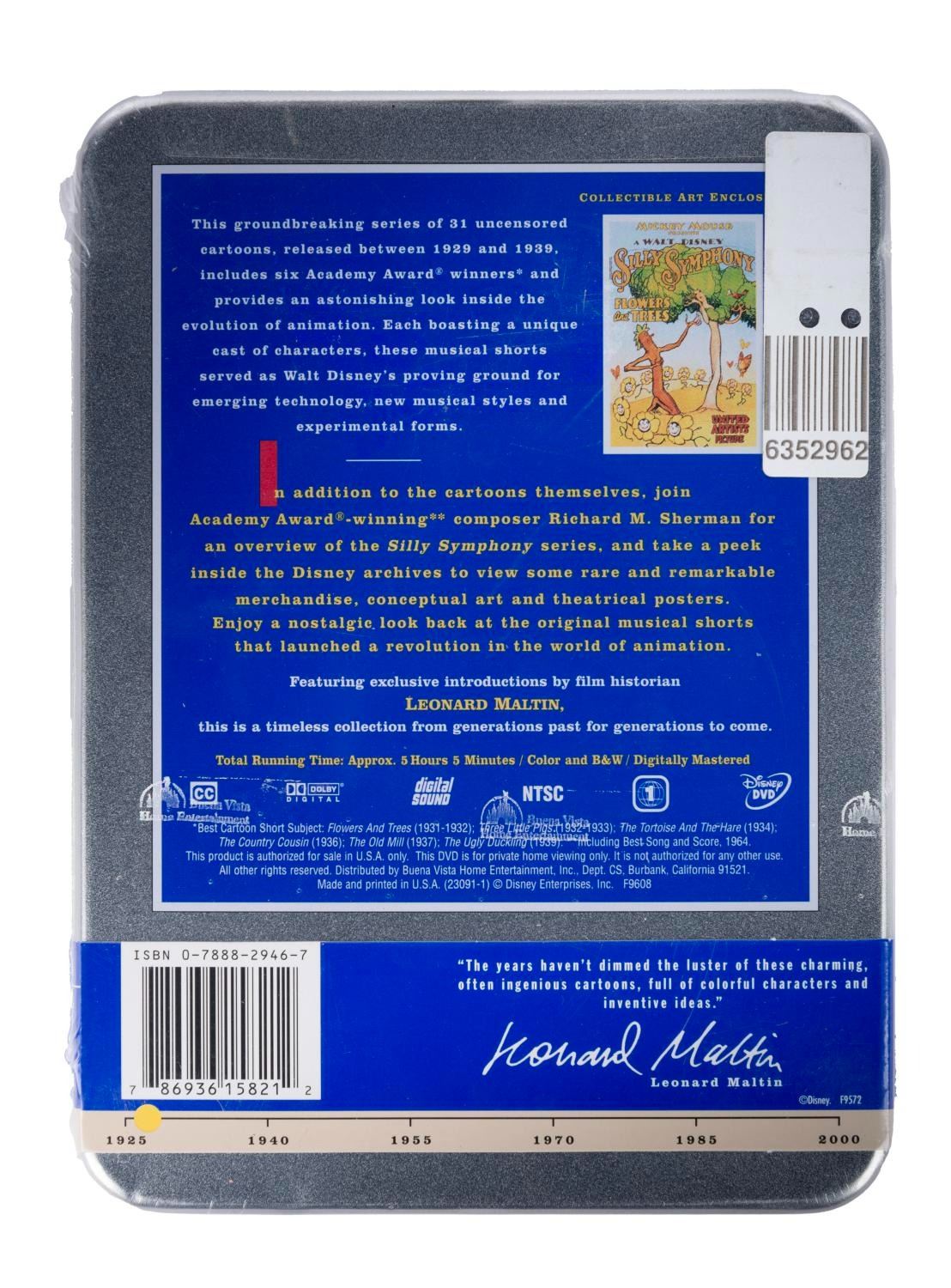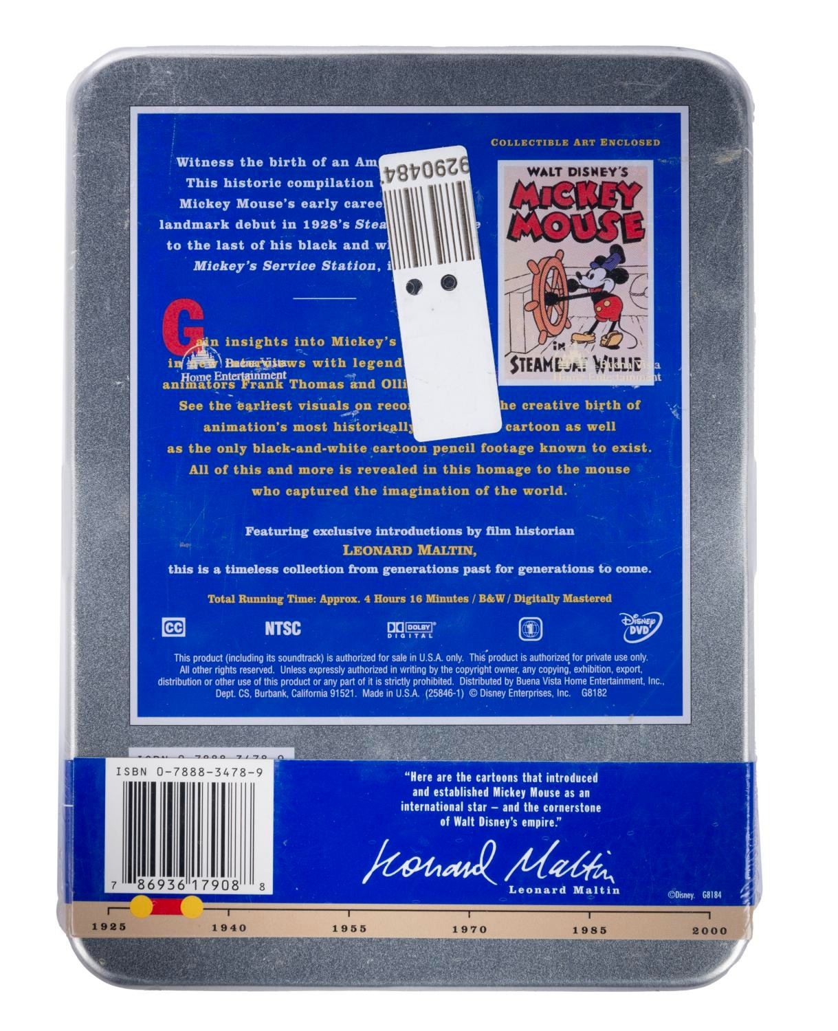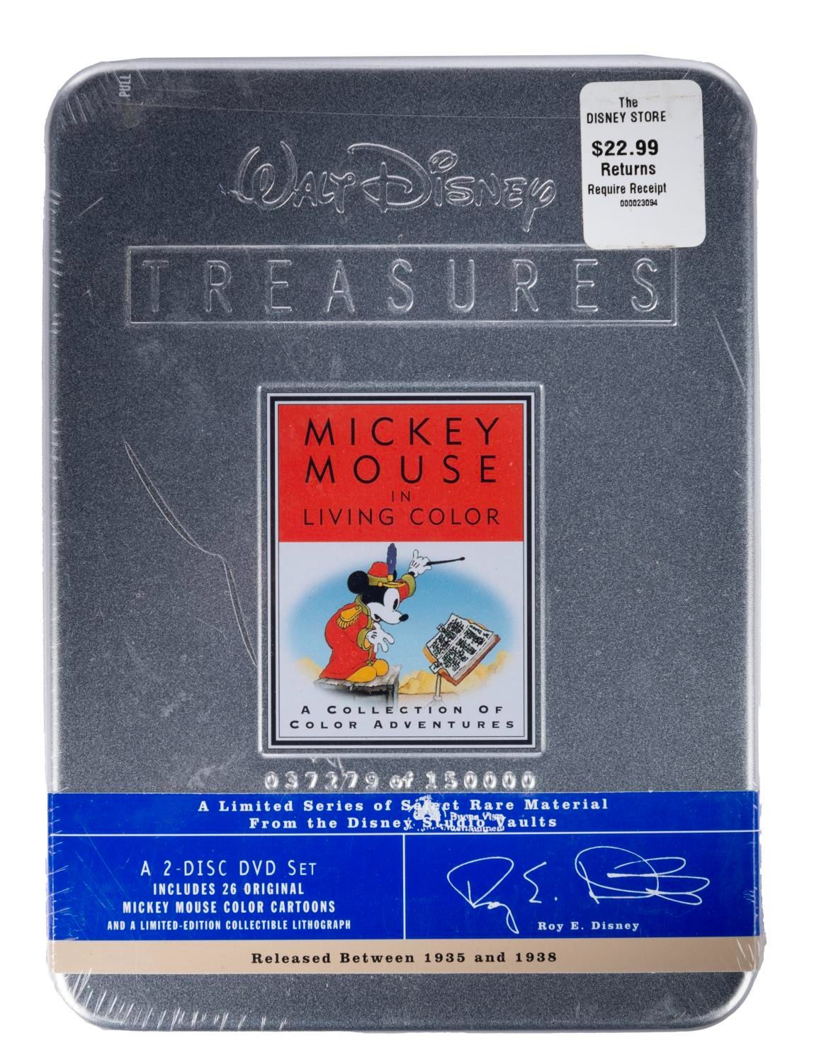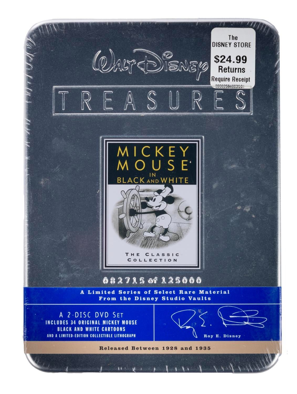 (Disney, 2001) A collection of nine Walt Disney's Treasures DVD sets. Included are Mickey Mouse in Black and White (Volume I and II), Mickey Mouse in Living Color (Volume I and II), Silly Symphonies, More Silly Symphonies, The Complete Goofy, The Chronological Donald Duck, and Walt Disney on the Front Lines. Measuring 6"x8"x1", each piece is in very good-to-fine condition, exhibiting minor scuffs and wear to the metal tins of two sets, and five sets sealed with their original wrapping.