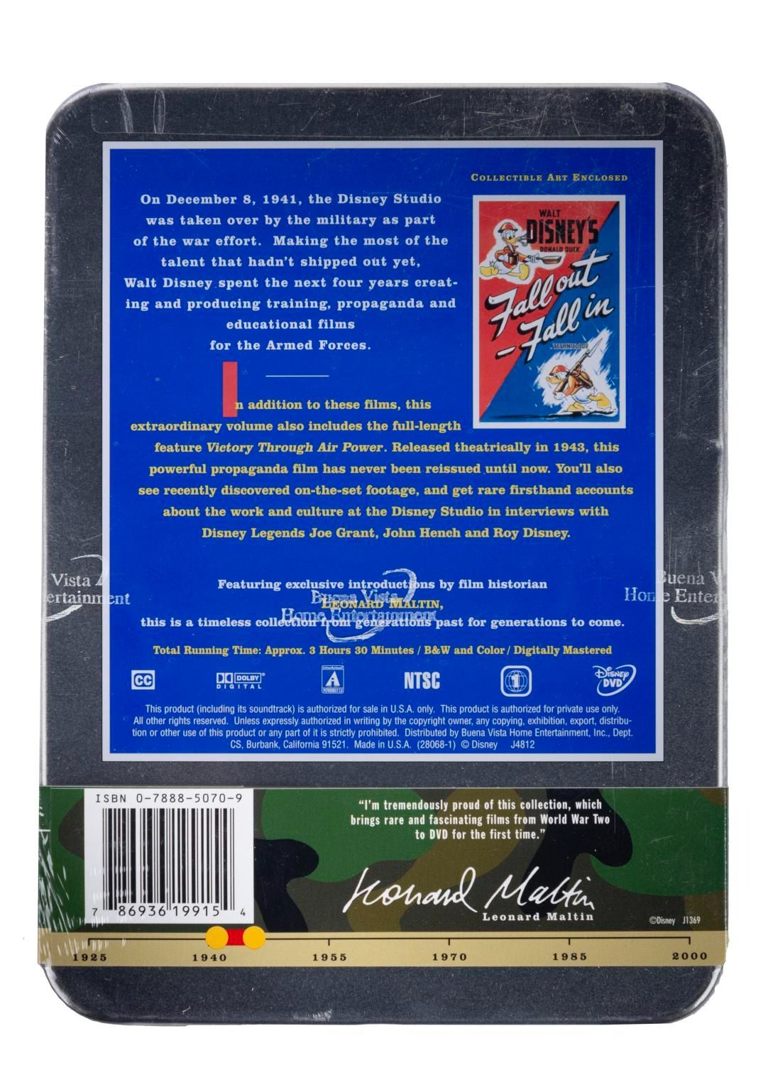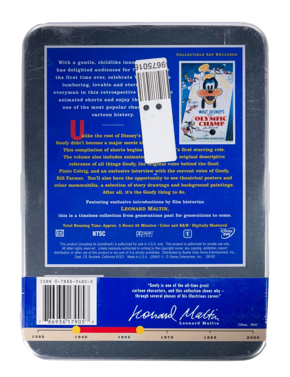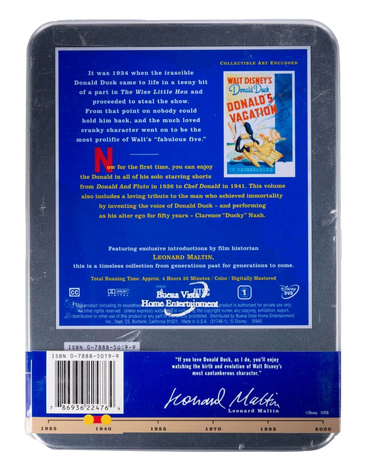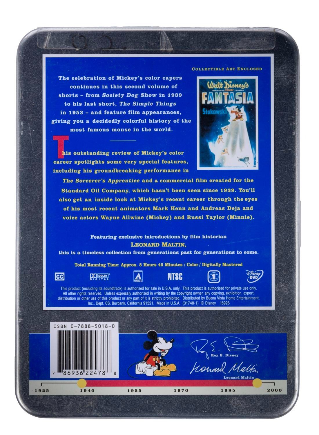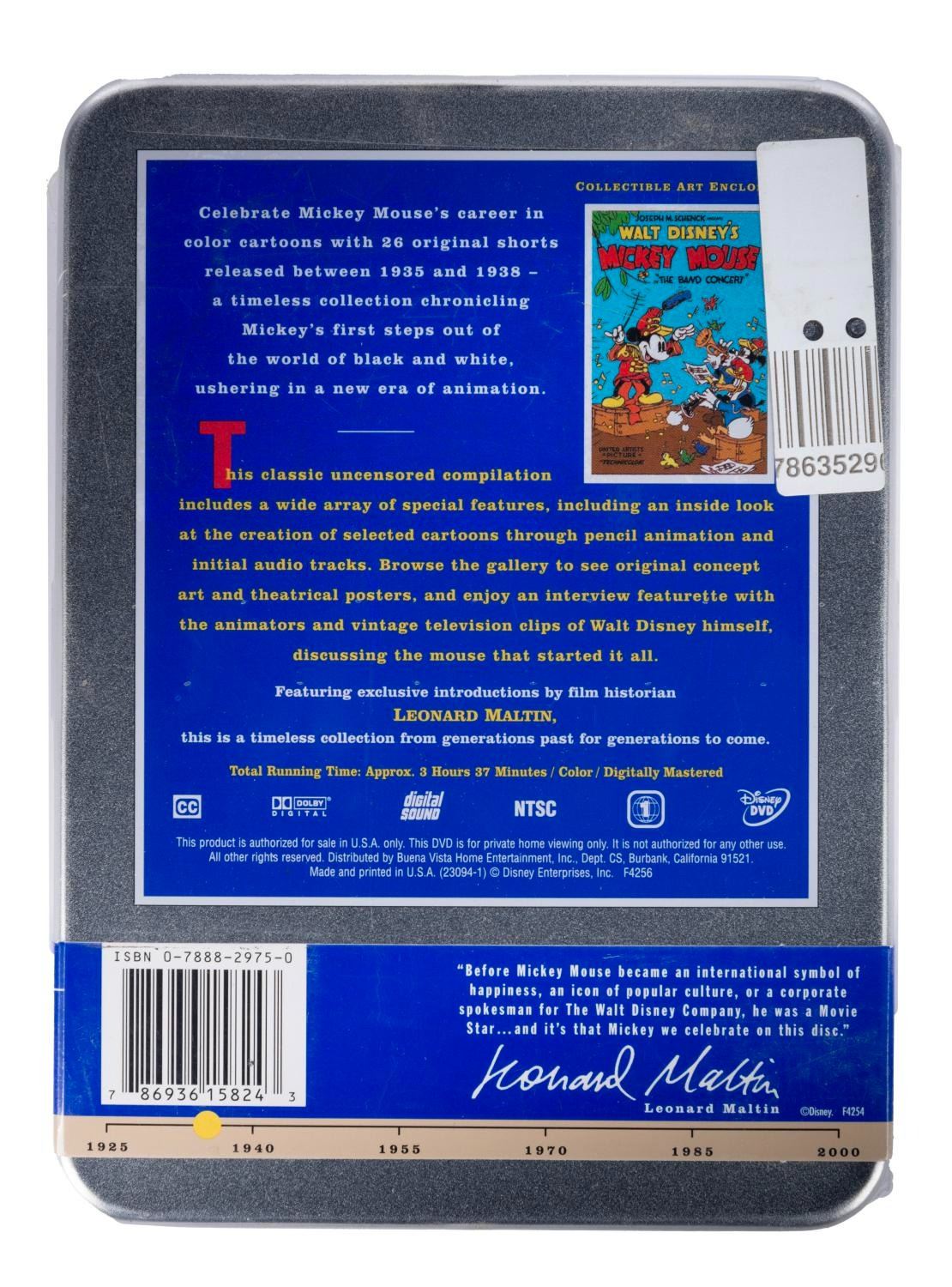 (Disney, 2001) A collection of nine Walt Disney's Treasures DVD sets. Included are Mickey Mouse in Black and White (Volume I and II), Mickey Mouse in Living Color (Volume I and II), Silly Symphonies, More Silly Symphonies, The Complete Goofy, The Chronological Donald Duck, and Walt Disney on the Front Lines. Measuring 6"x8"x1", each piece is in very good-to-fine condition, exhibiting minor scuffs and wear to the metal tins of two sets, and five sets sealed with their original wrapping.