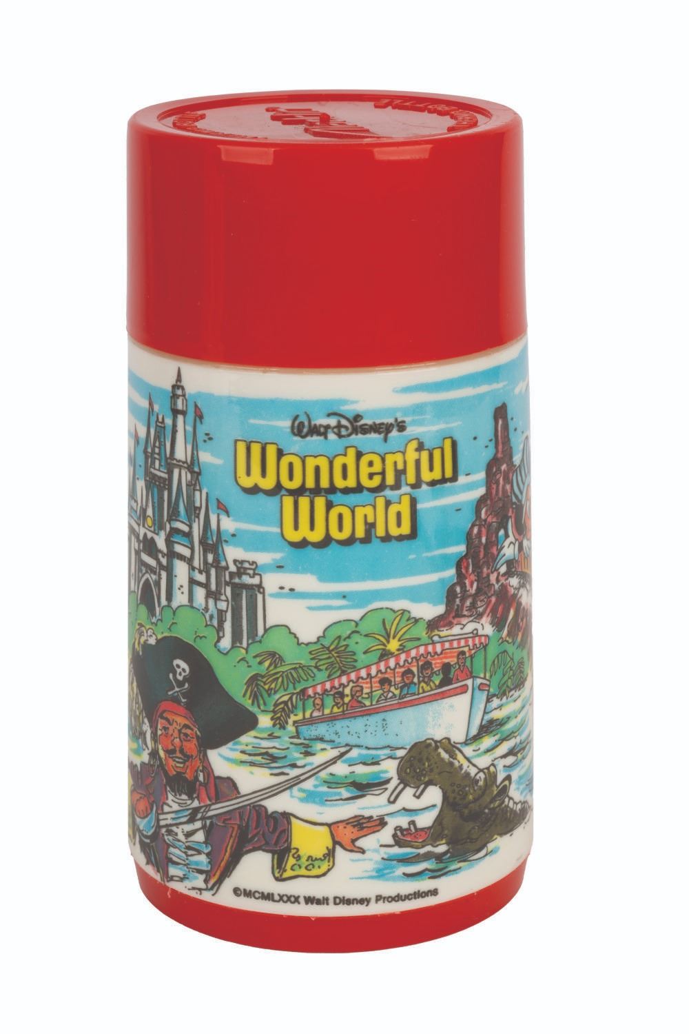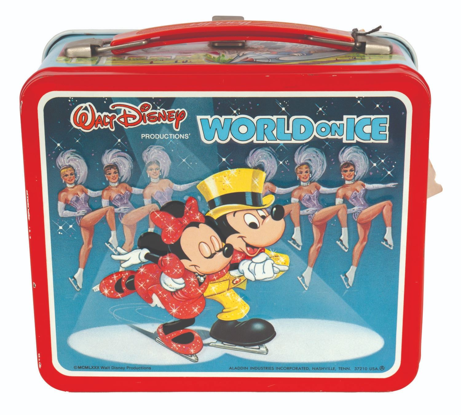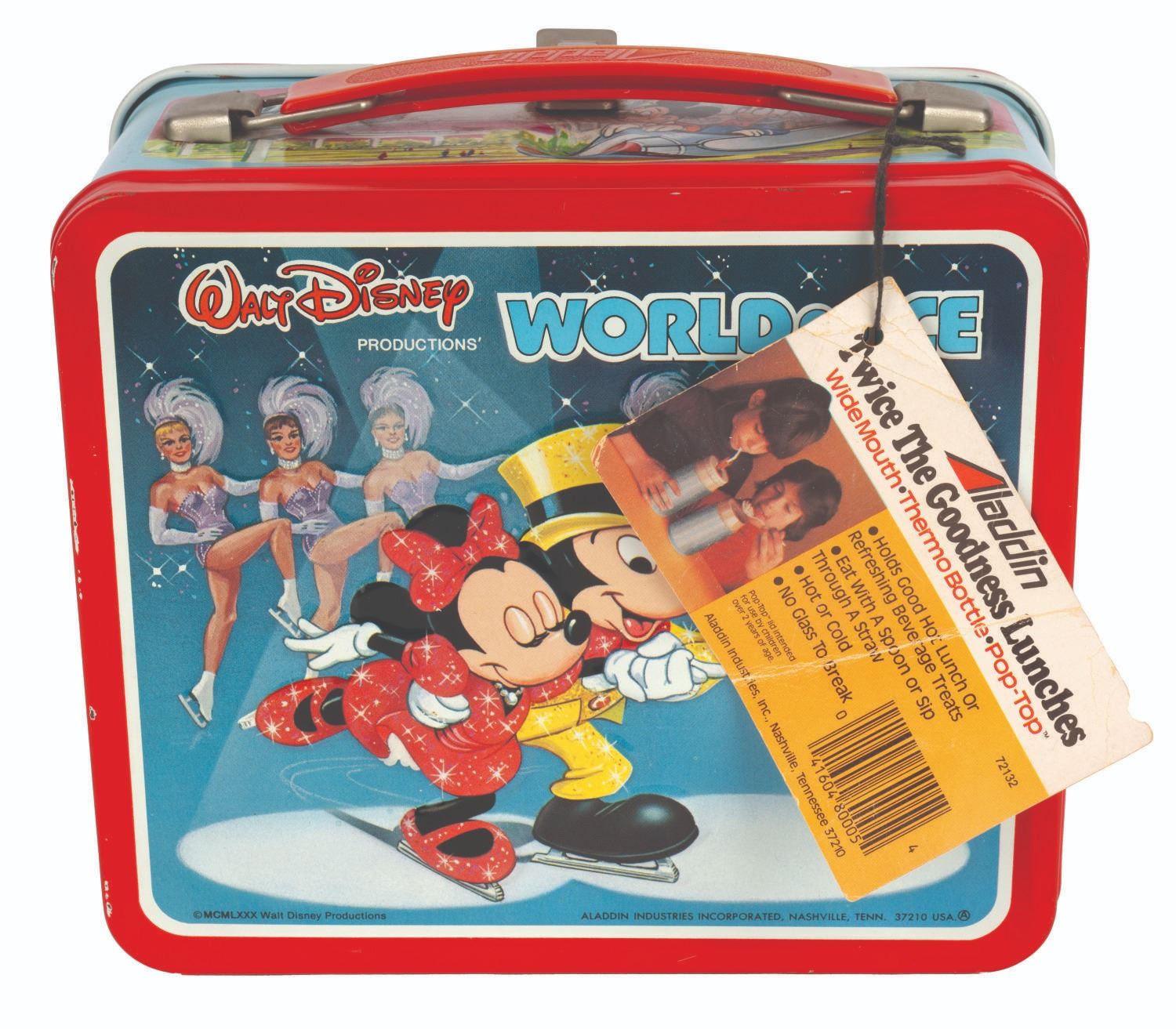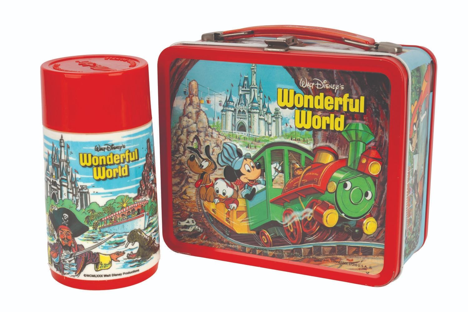 (Aladdin, 1980) A lunch box and matching thermos featuring Walt Disney’s Wonderful World and World on Ice. Measuring 8"x3.75"x7” high, the embossed tin lithographic lunch box is in very good condition with scuffs and minor paint wear and retains its Aladdin tag. The 6.5"x4" thermos is in fine as-new condition and is accompanied by its original literature.