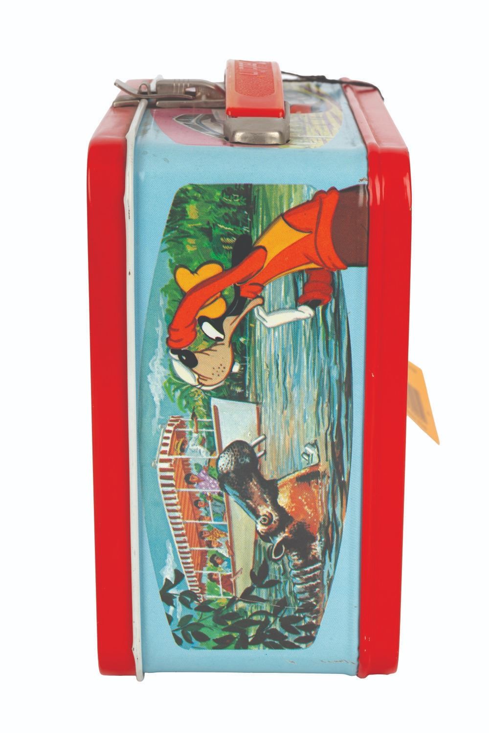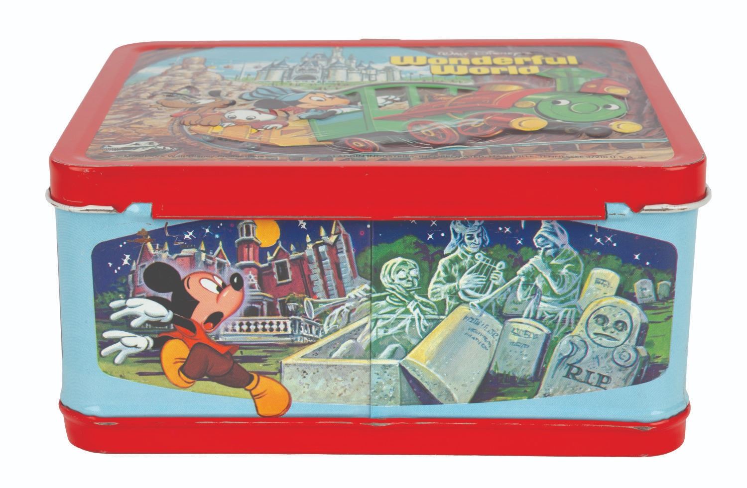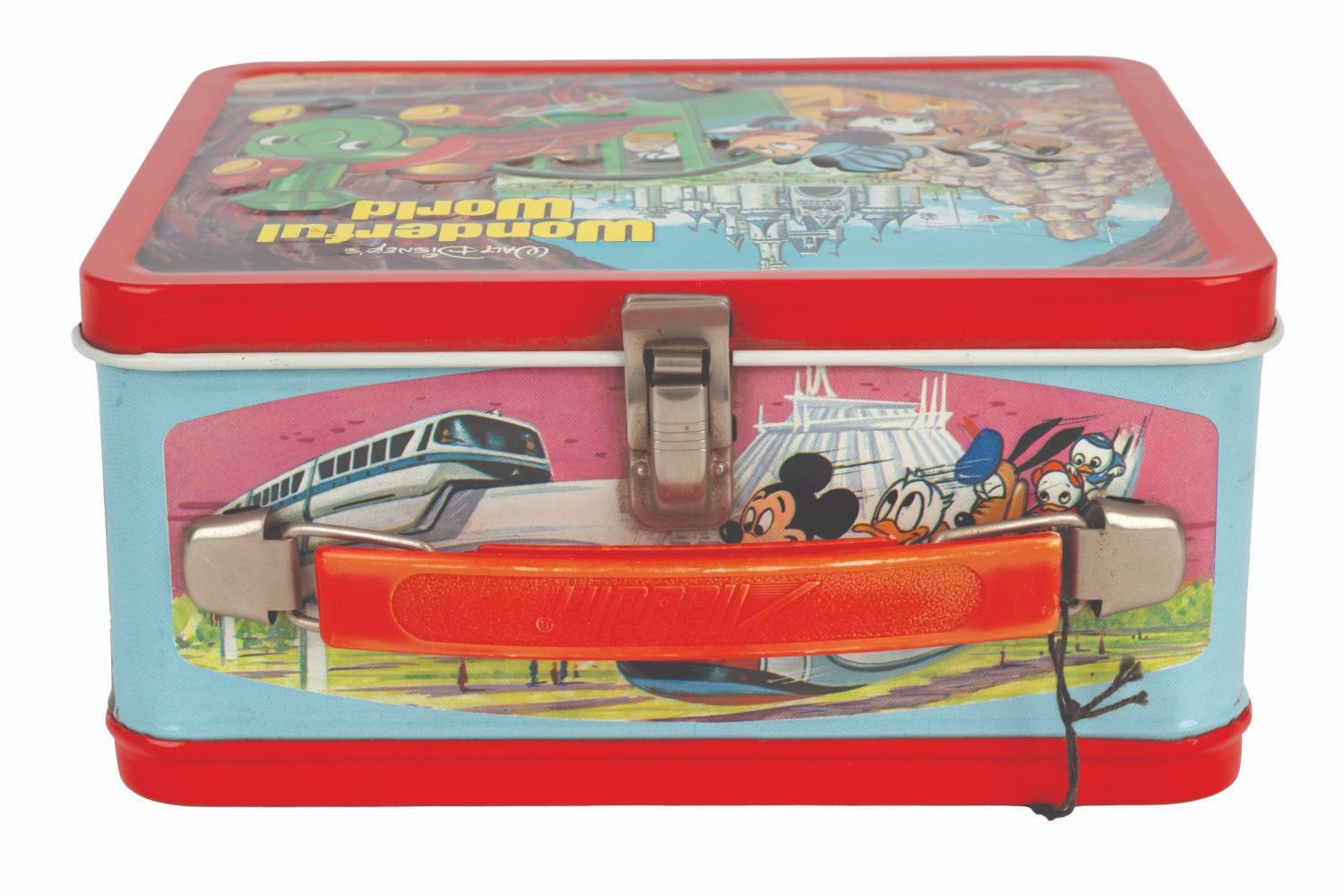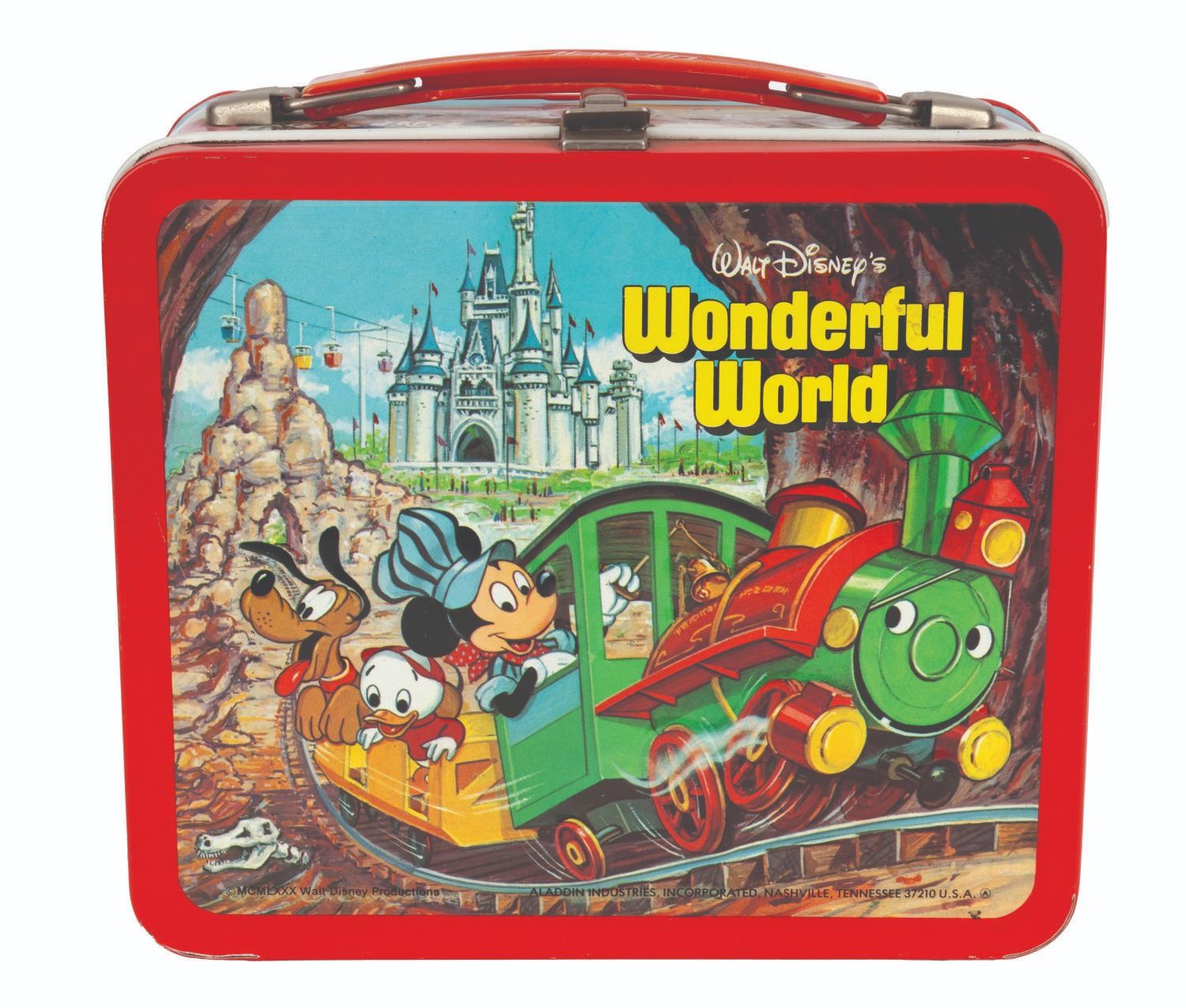 (Aladdin, 1980) A lunch box and matching thermos featuring Walt Disney’s Wonderful World and World on Ice. Measuring 8"x3.75"x7” high, the embossed tin lithographic lunch box is in very good condition with scuffs and minor paint wear and retains its Aladdin tag. The 6.5"x4" thermos is in fine as-new condition and is accompanied by its original literature.