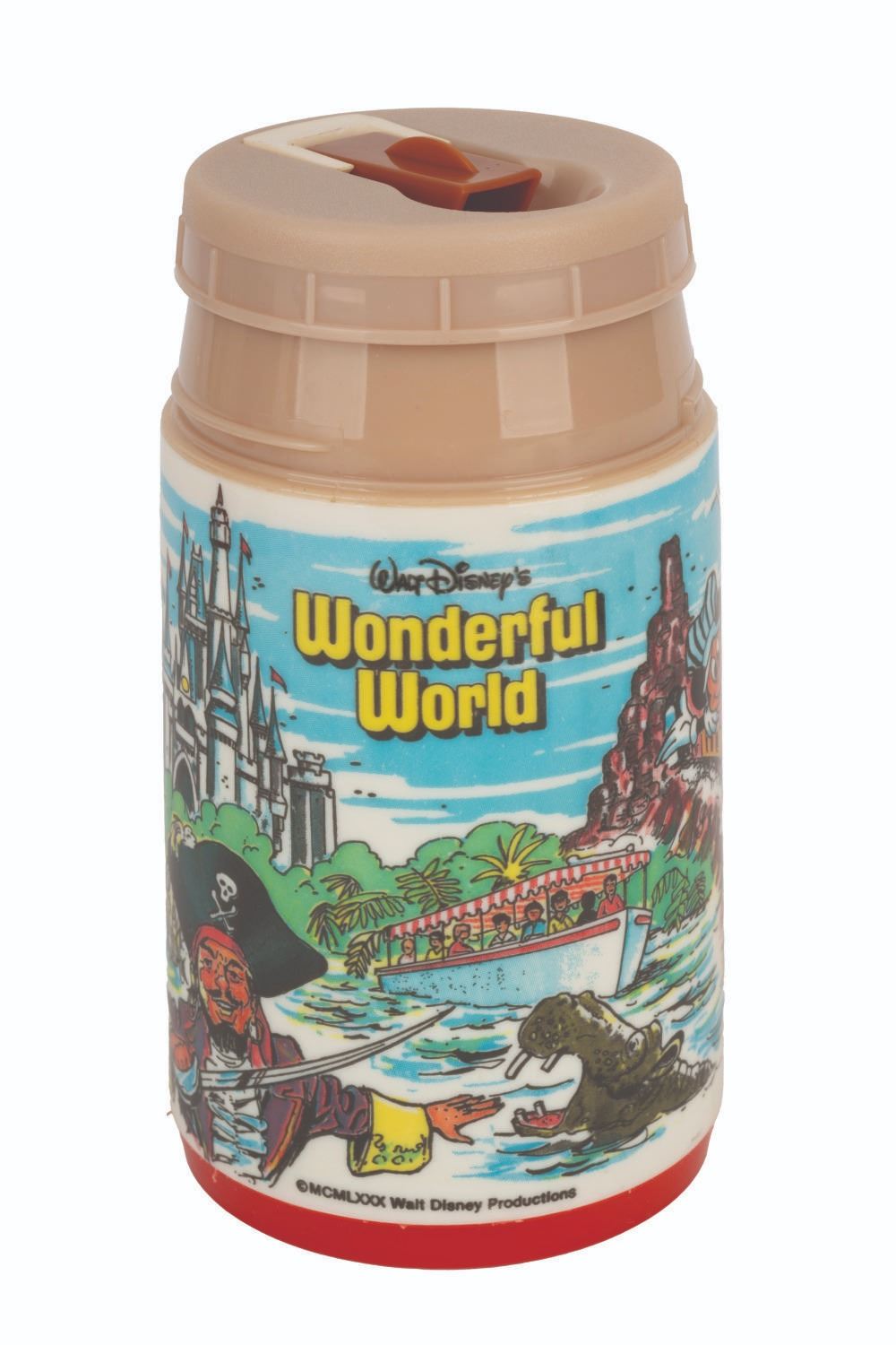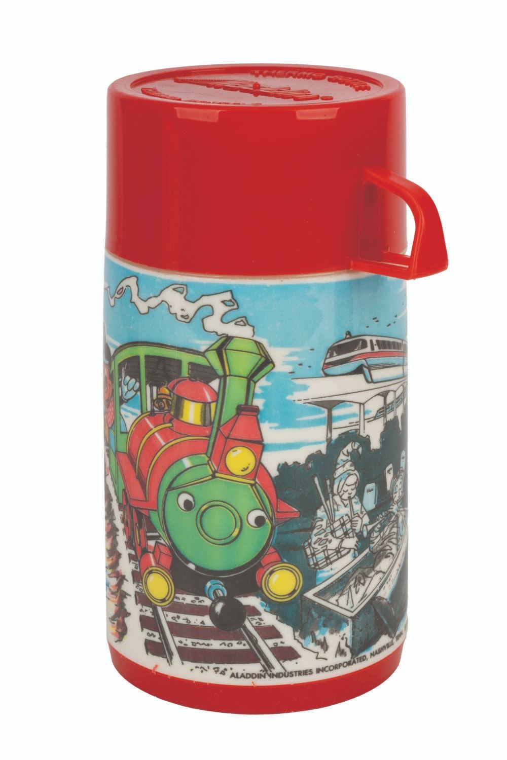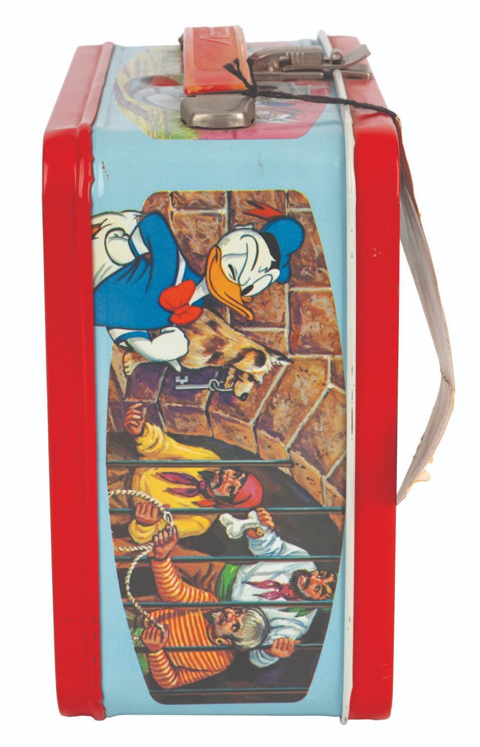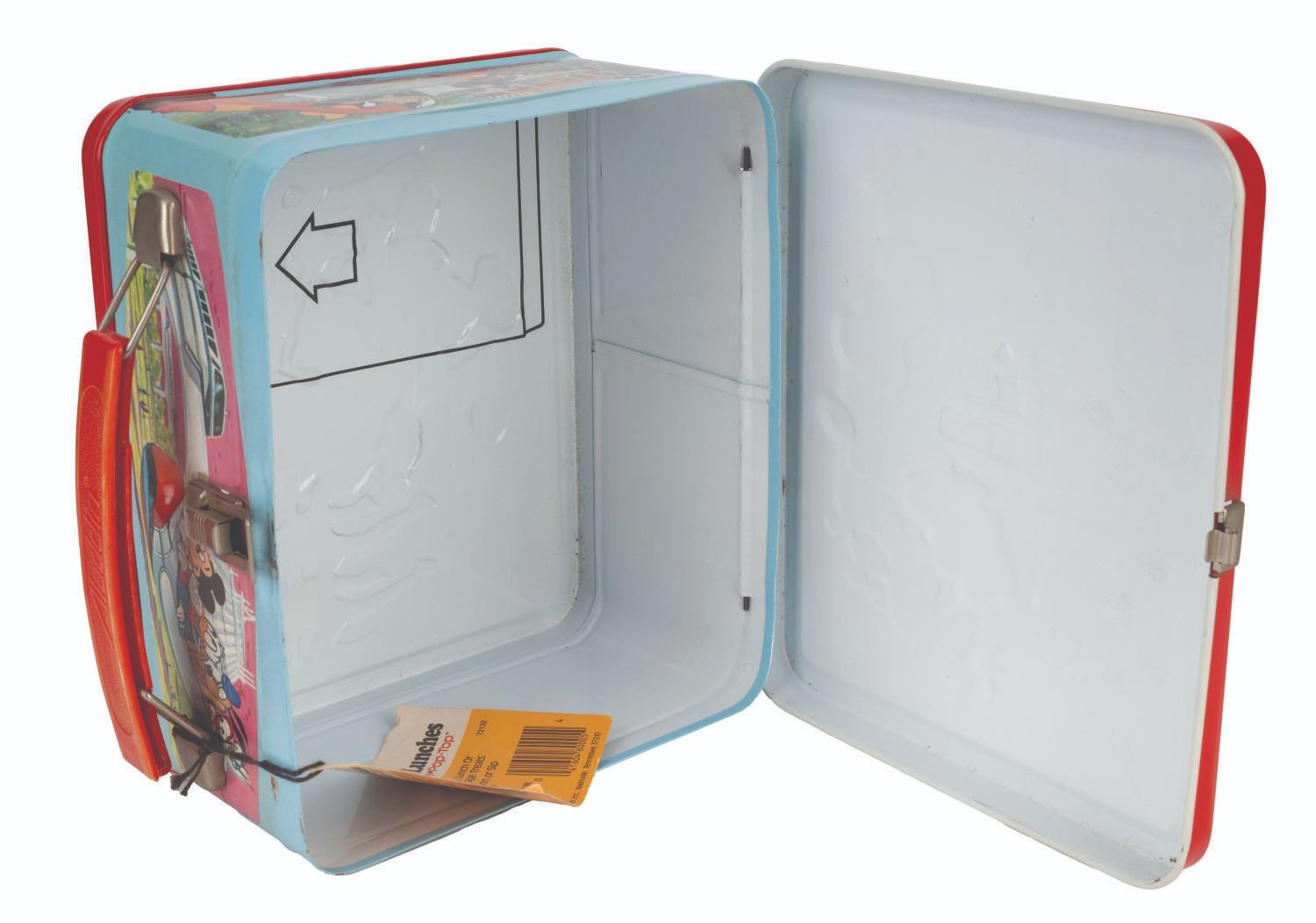 (Aladdin, 1980) A lunch box and matching thermos featuring Walt Disney’s Wonderful World and World on Ice. Measuring 8"x3.75"x7” high, the embossed tin lithographic lunch box is in very good condition with scuffs and minor paint wear and retains its Aladdin tag. The 6.5"x4" thermos is in fine as-new condition and is accompanied by its original literature.