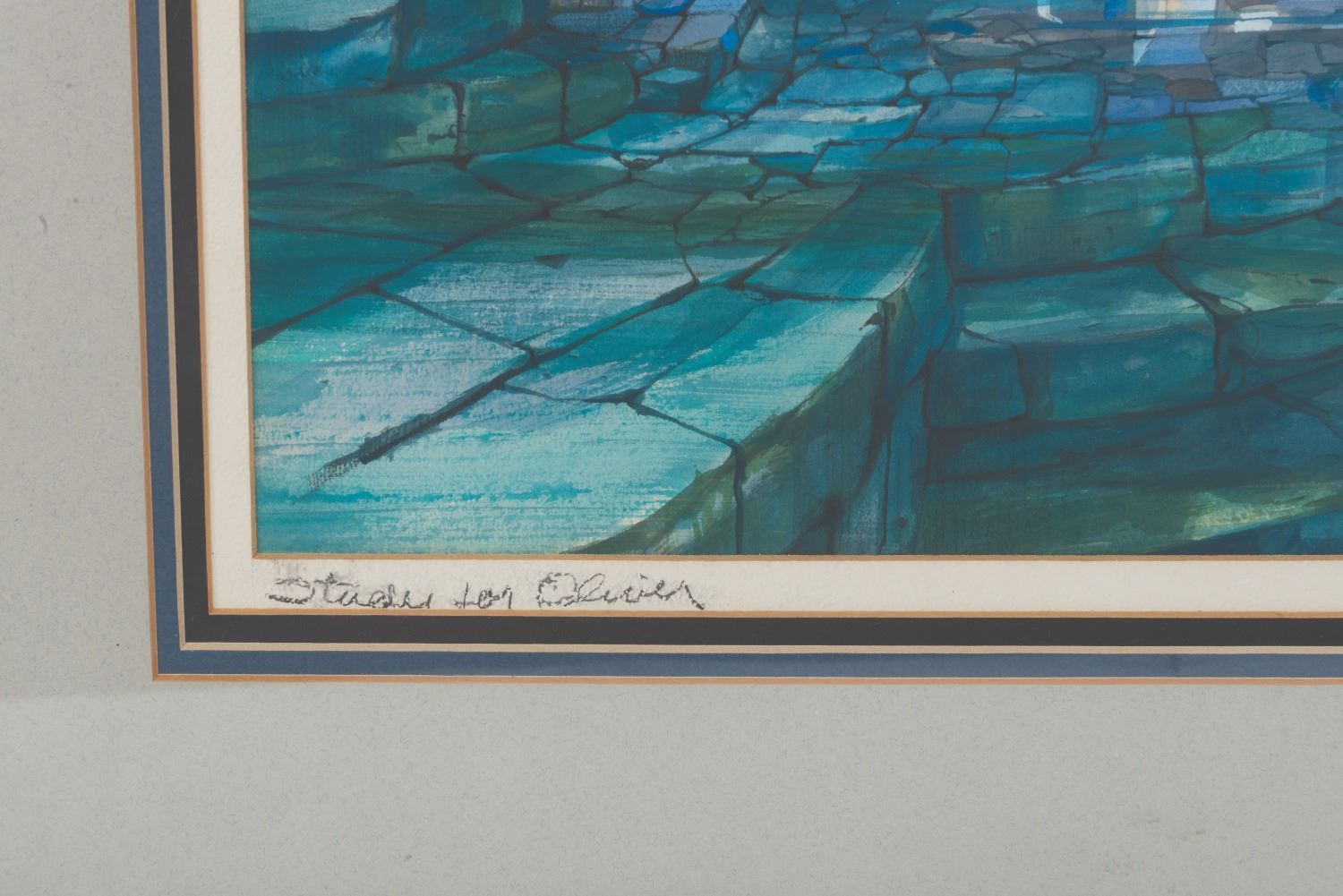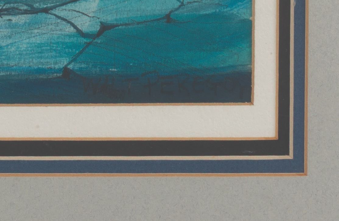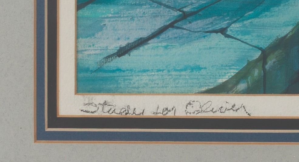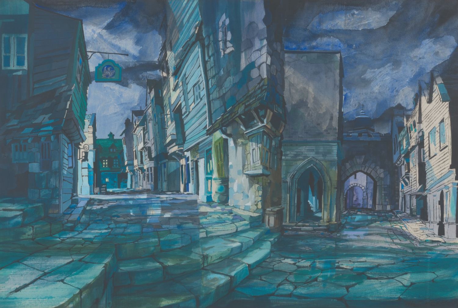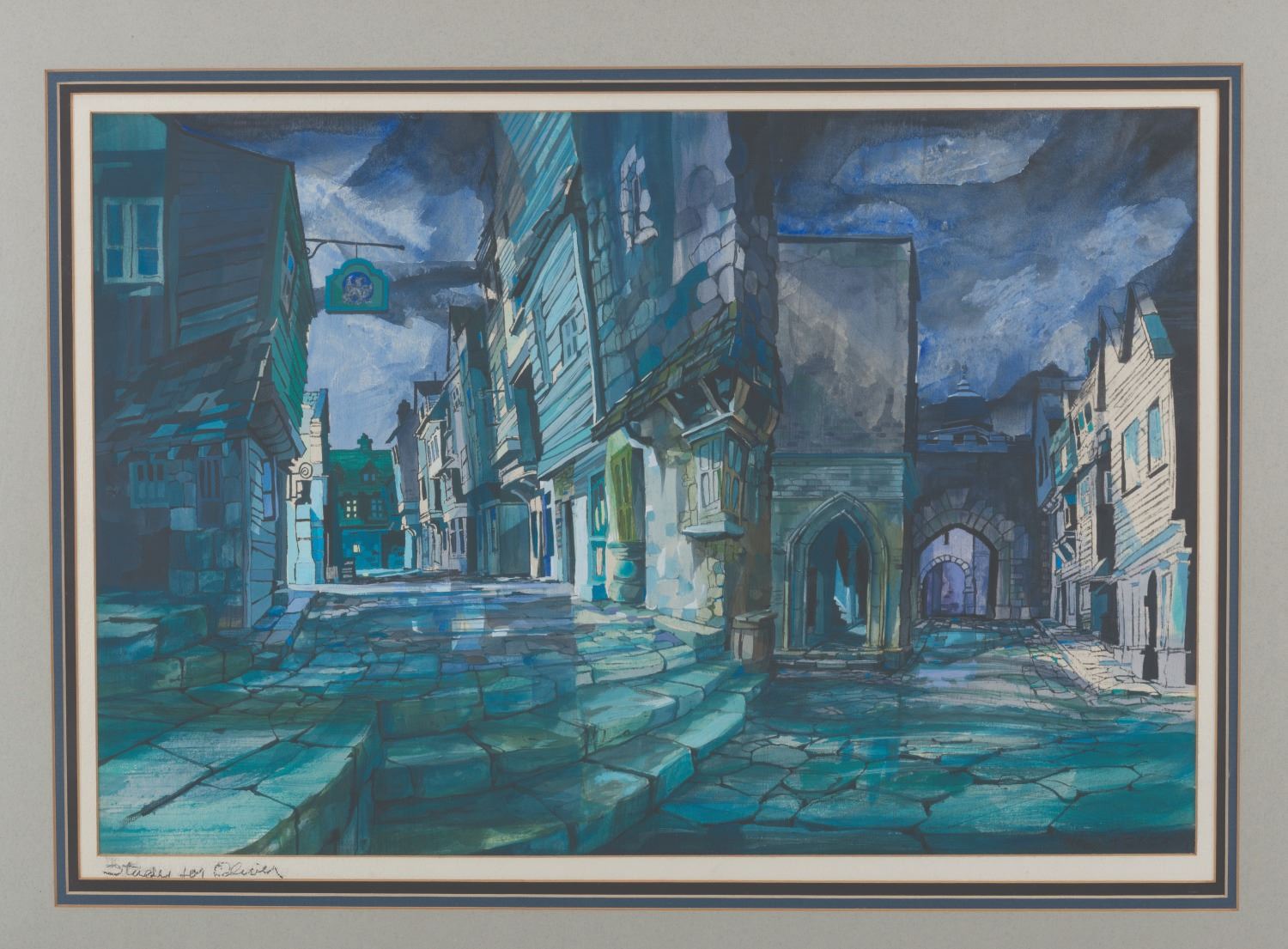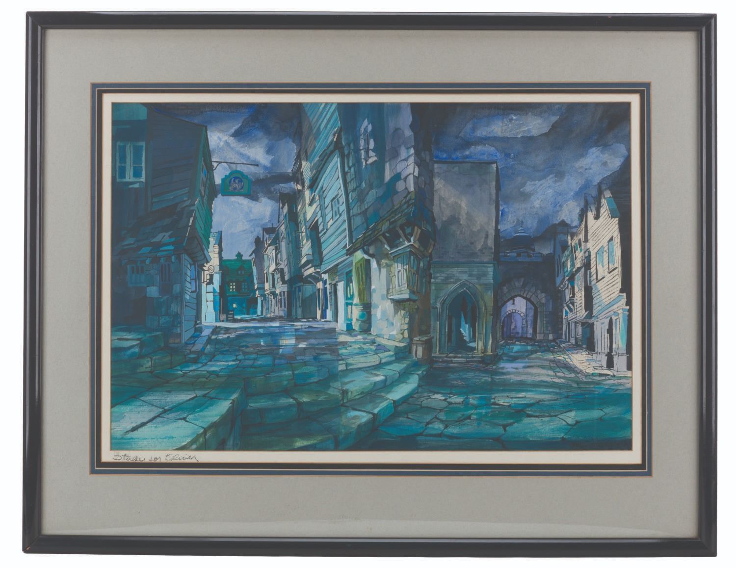 (Disney, 1980s) An original color study by Disney Legend Walt Peregoy for"Oliver & Company." Initially, the film was meant to be set in 19th-century London, but it was later changed to modern New York. This color study, signed by Peregoy, reflects that early concept. The painting measures 14.5" x 21.5", and the entire framed and matted piece measures 22.75" x 29". The mixed-media art is in fine condition, while the frame is in good condition with scratches, scuffs, stains, and chips.