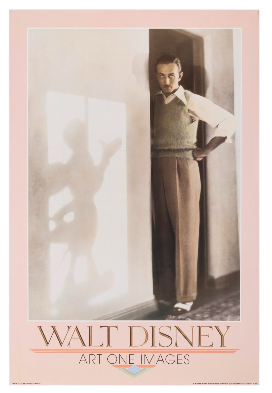 (Art One Images, 1986) A poster of the famous image of Walt Disney with Mickey's shadow. Measuring 24" x 36", the poster is in very good condition with light edge wear, including a few small creases along the right edge.