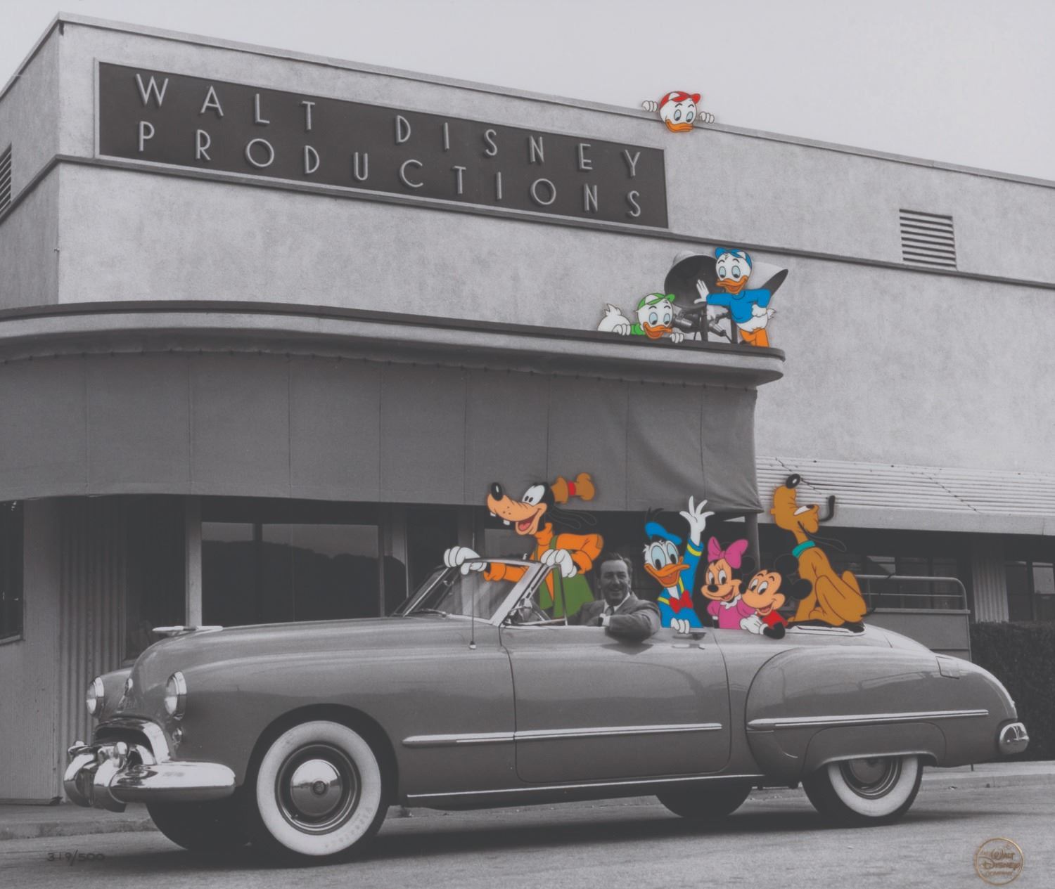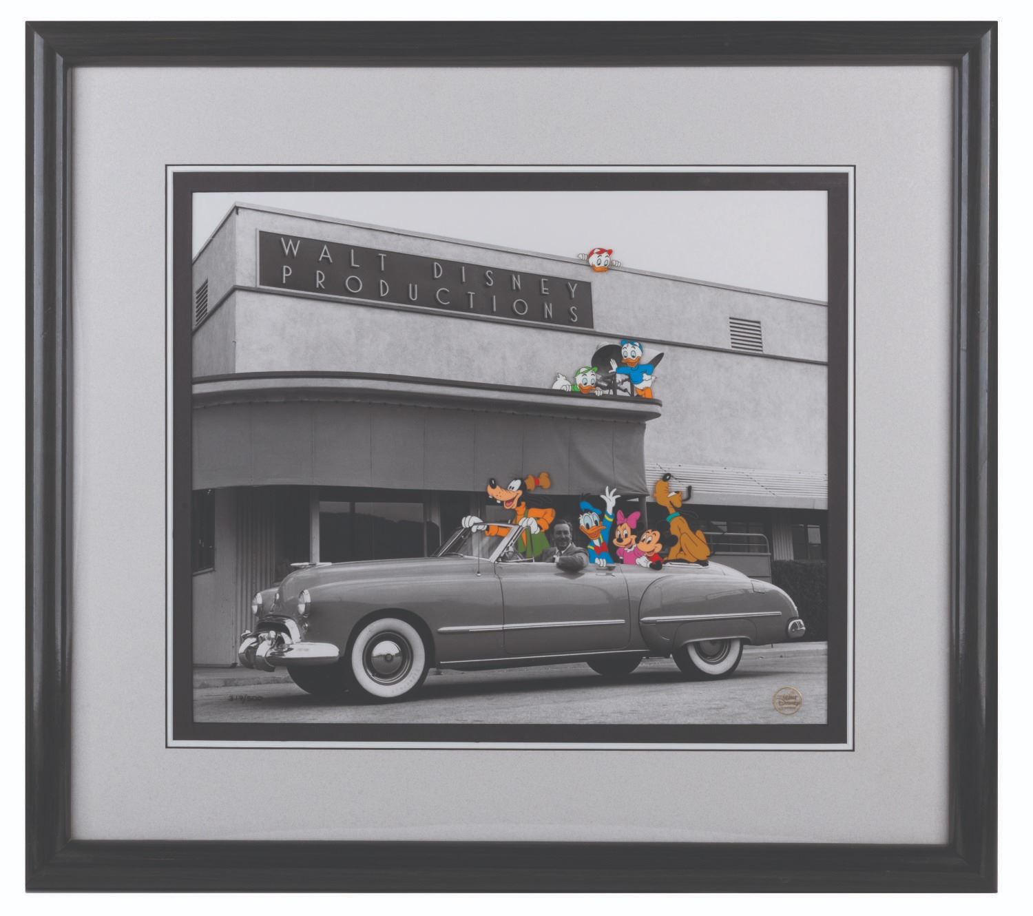 (Disney, 1992) A limited edition cel and photo print titled “Walt’s Convertible.” The photo of Walt in his 1948 Buick at the Studio is paired with a cel of Mickey and Friends, and numbered 319/500. The 12.75” x 15.25”image is matted and framed to a total size of 21” x 23.5”. The artwork is in fine condition with light scuffs to the frame.