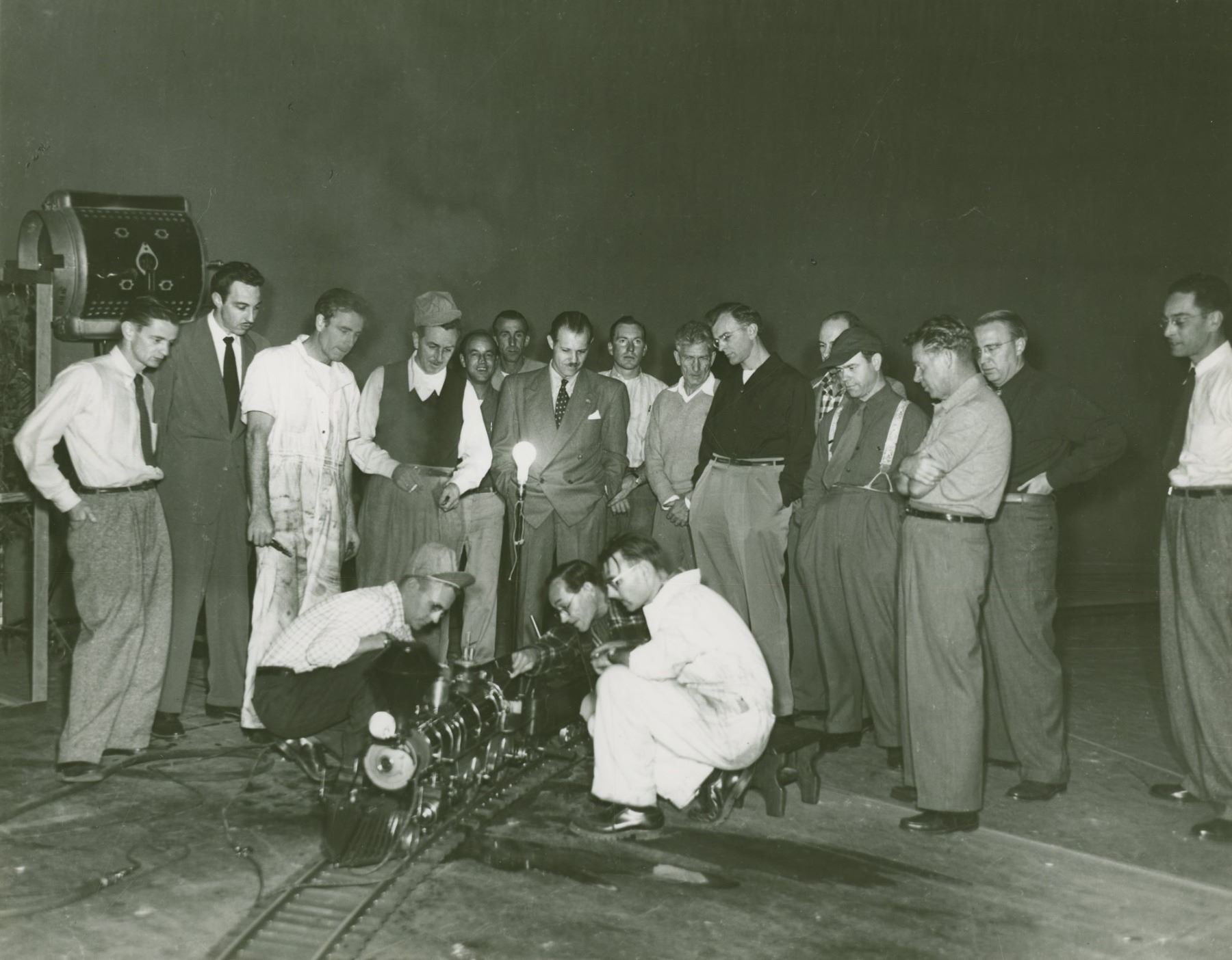 (Disney, 1949) An original print of Walt Disney showing off the 1:8 scale Lilly Belle locomotive he built by hand to his fellow train enthusiasts at the Walt Disney Studio. The photo was taken in December of 1949, with this print possibly made later. In the group are Ward Kimball, Ollie Johnston, John Lounsberry, Eric Larson, and several more. Measuring 8" x 10", the photo print is in very good condition.