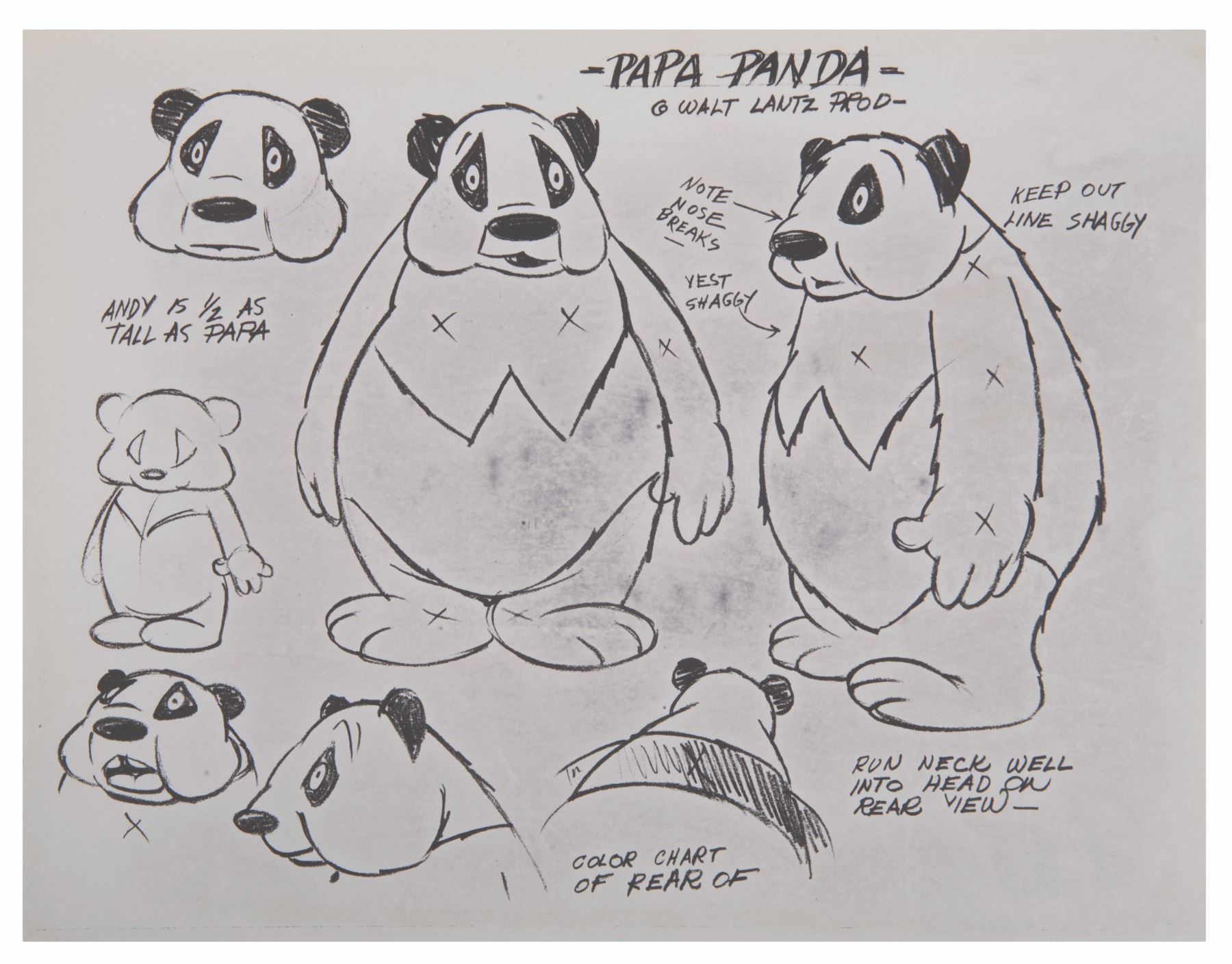 (Walter Lantz, 1939) A printed model sheet for Papa Panda, first introduced in Andy Panda's debut cartoon "Life Begins for Andy Panda." Measuring 8.5"x11", this sheet is in very good condition with light paper tanning in the center.