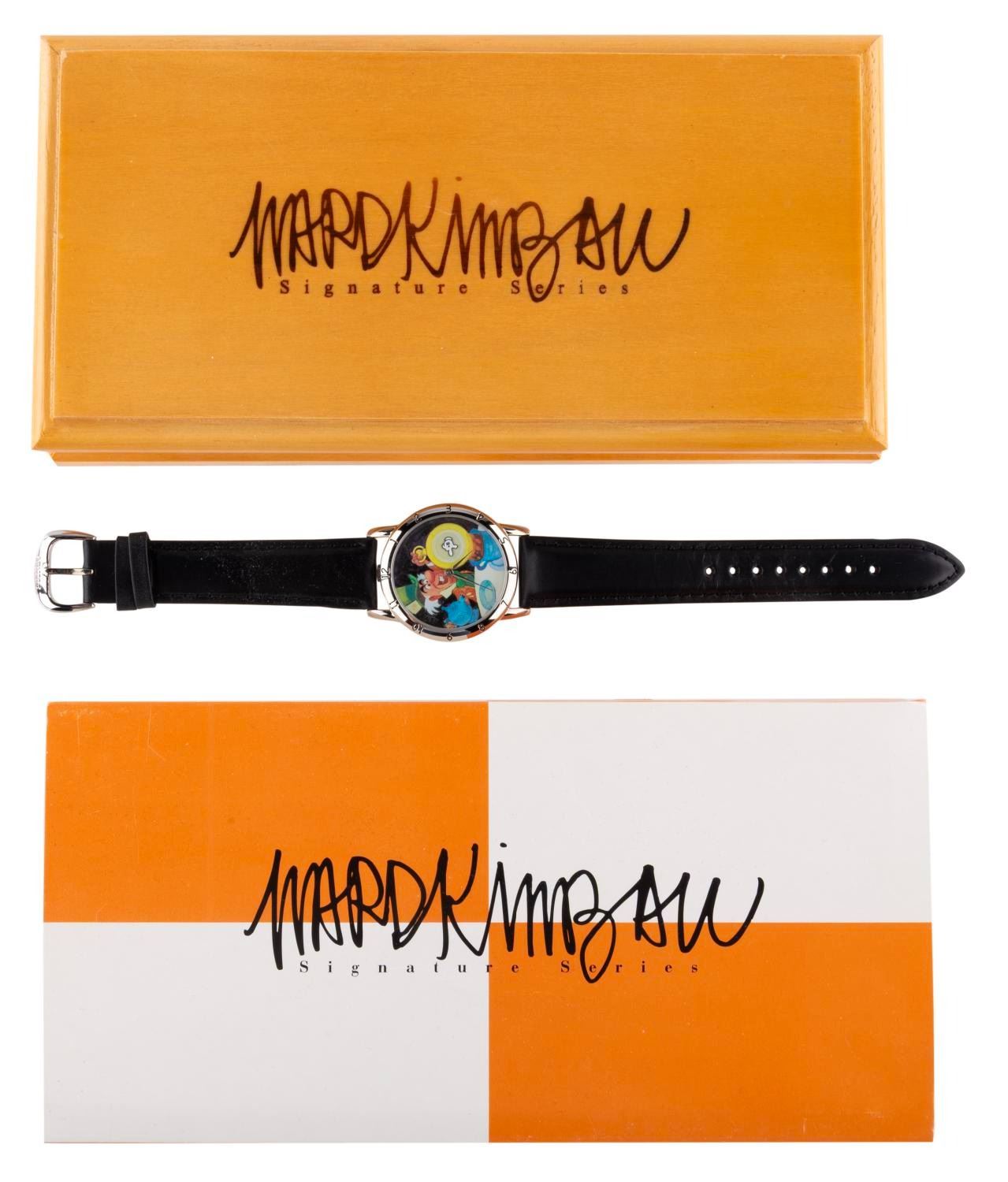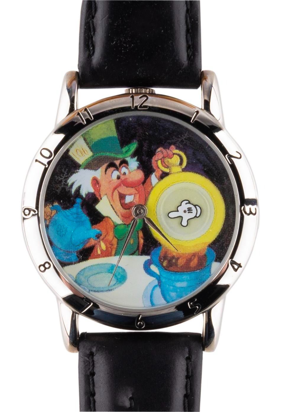 (Fantasma, 1990s) A Disney-Ward Kimball Signature Series Mad Hatter watch, with a rotating hand as the second function. The watch is in fine condition, requiring a battery and possibly service to function. The wooden presentation box is in very good condition with a scuff to one corner.