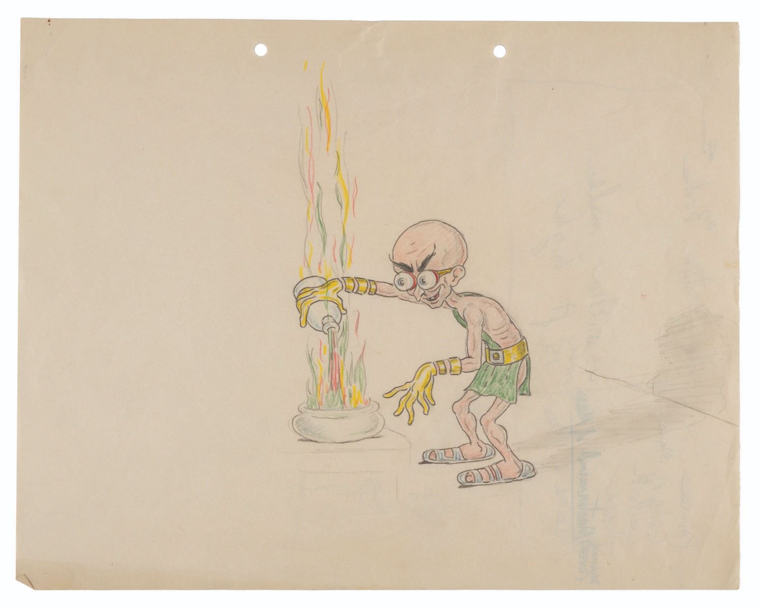 (Clampett, 1934-35) An original concept drawing of a mad scientist from “Warlord of Mars.” On the reverse, Clampett wrote a list of books in Edgar Rice Burroughs' Barsoom series. He emphasized in blue marker that this drawing is of Ras Thavas from "The Master Mind of Mars," and based on storyboards, this character was intended to be in Clampett's film. With an image size of 4” x 7” on 9.5” x 12” paper, the graphite and colored pencil drawing is in good condition with creases, spots of discoloration from age, and edge wear.