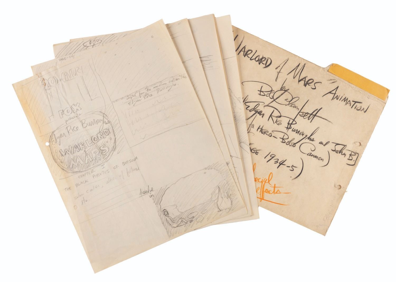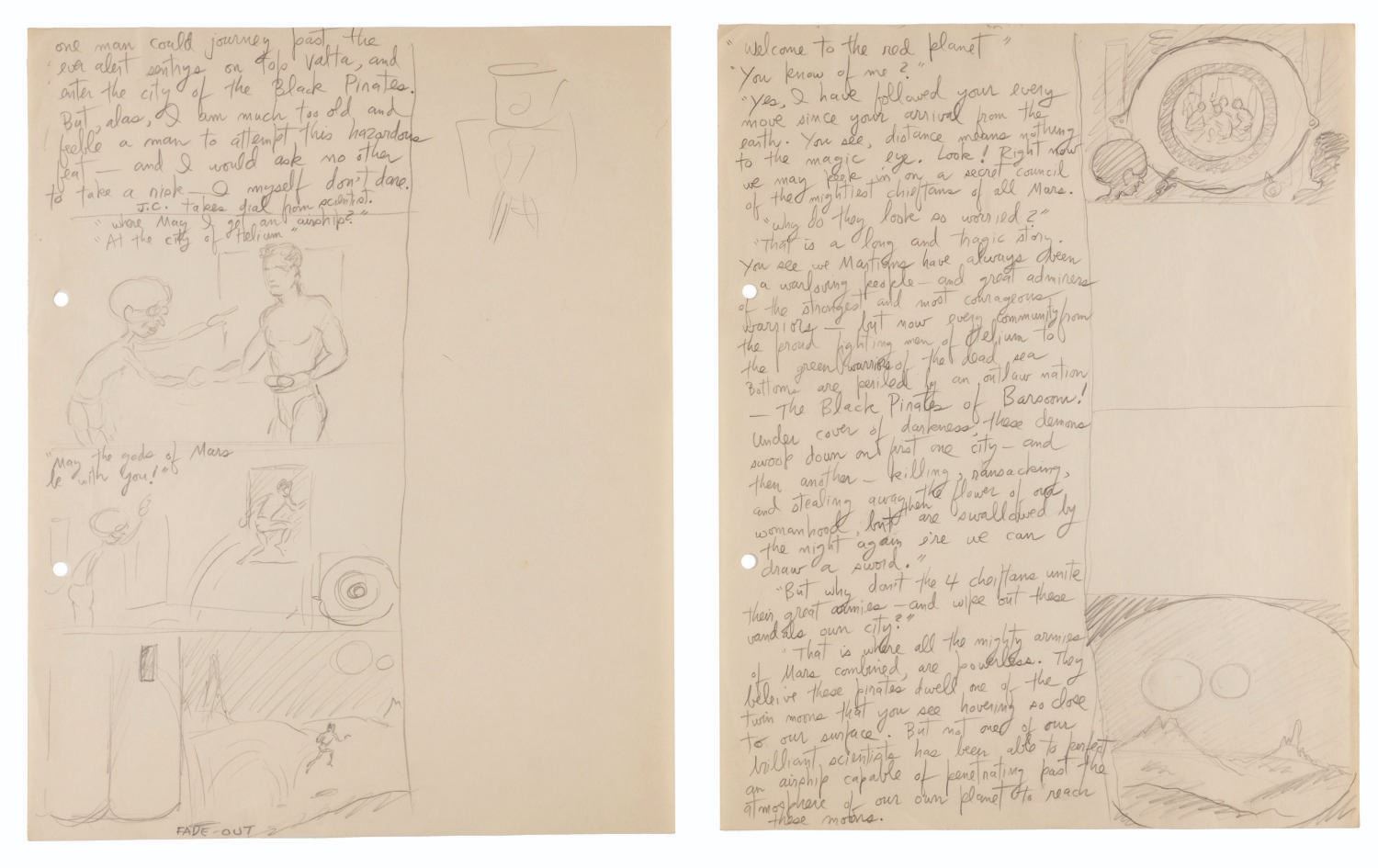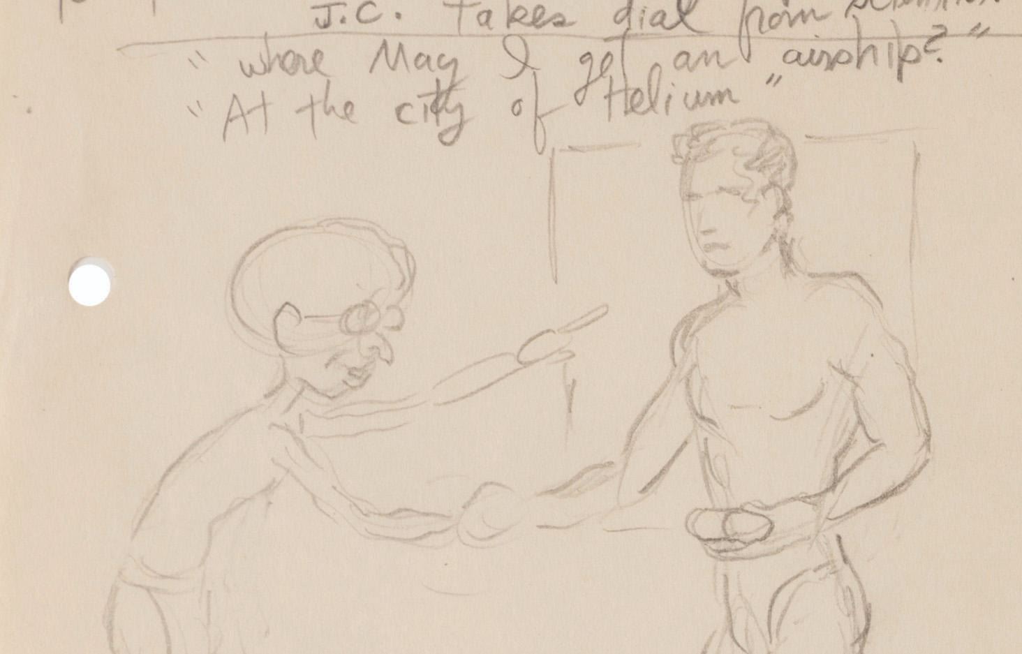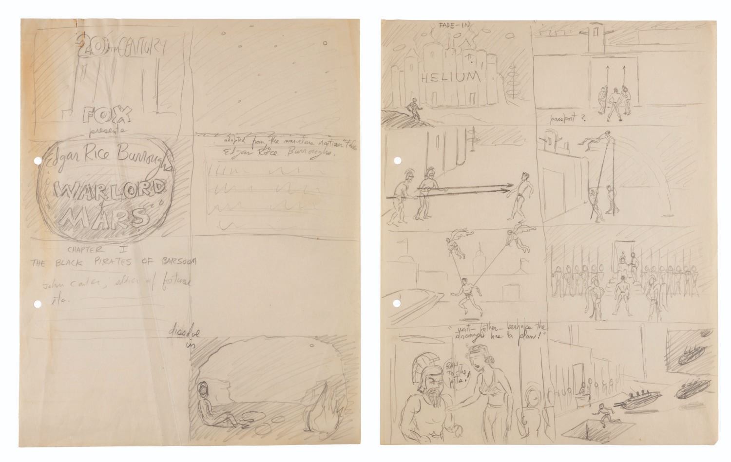 (Clampett, 1934-35) A collection of nine pages of graphite storyboard drawings and dialogue for “Warlord of Mars” Chapter I, The Black Pirates of Barsoom. The pages include sequences where John Carter is captured, encounters a mad scientist, and learns about the warring factions of Barsoom. Measuring 9.5” x 12” each, the pages are in good to very good condition with creases, discoloration from age, stains, and edge wear from production use.