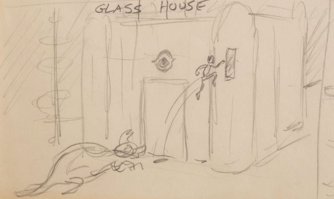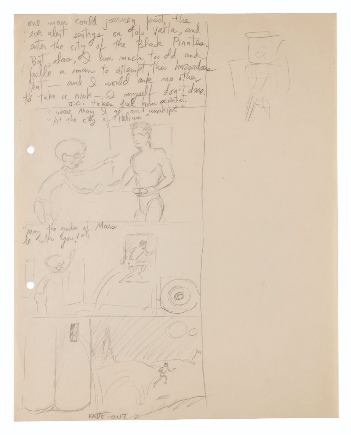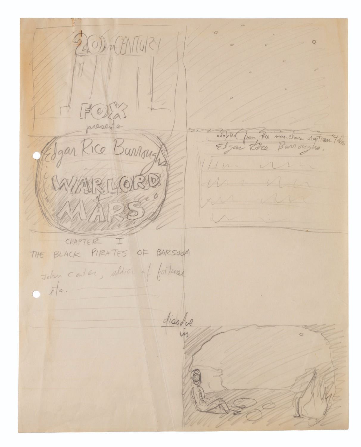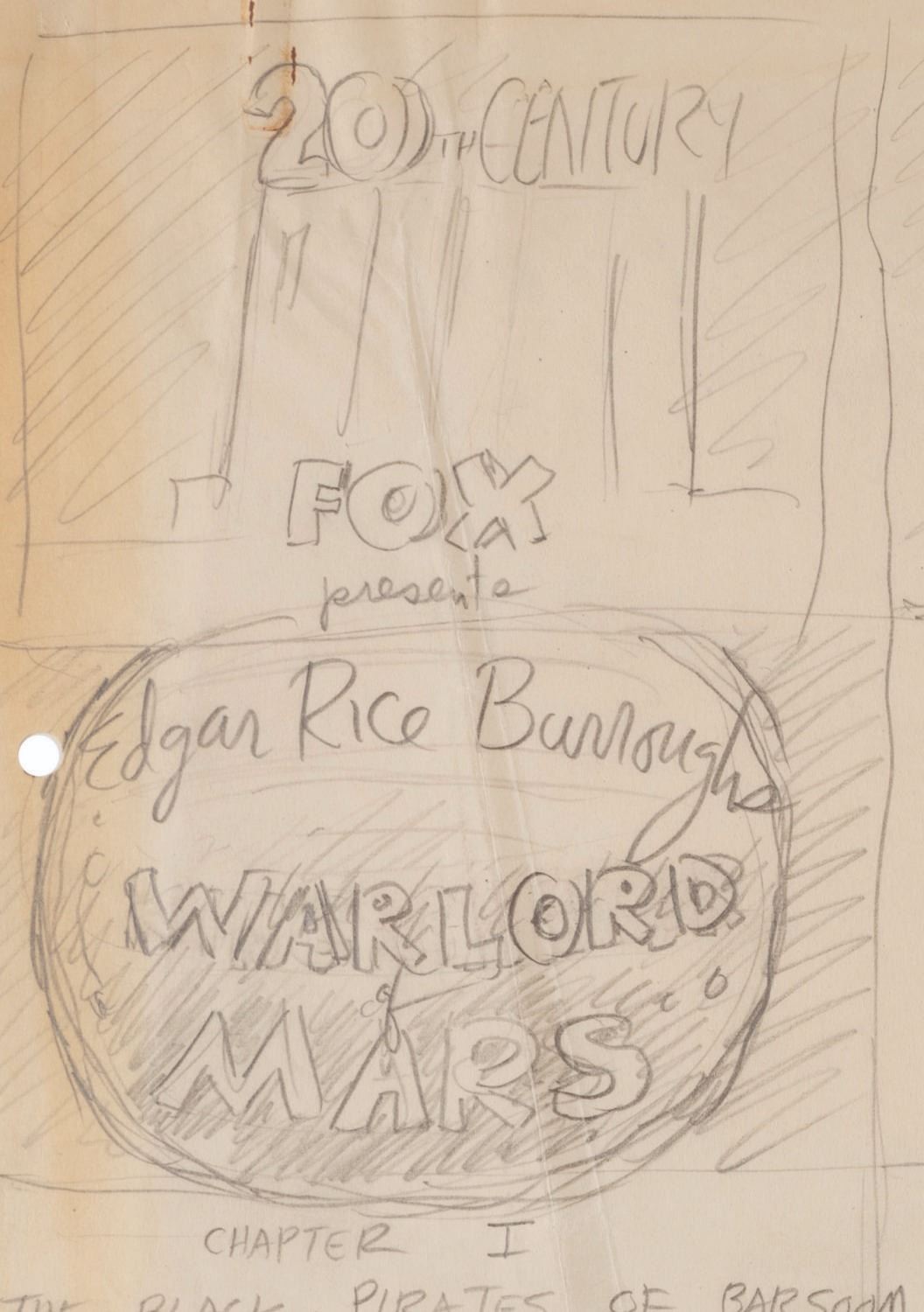 (Clampett, 1934-35) A collection of nine pages of graphite storyboard drawings and dialogue for “Warlord of Mars” Chapter I, The Black Pirates of Barsoom. The pages include sequences where John Carter is captured, encounters a mad scientist, and learns about the warring factions of Barsoom. Measuring 9.5” x 12” each, the pages are in good to very good condition with creases, discoloration from age, stains, and edge wear from production use.