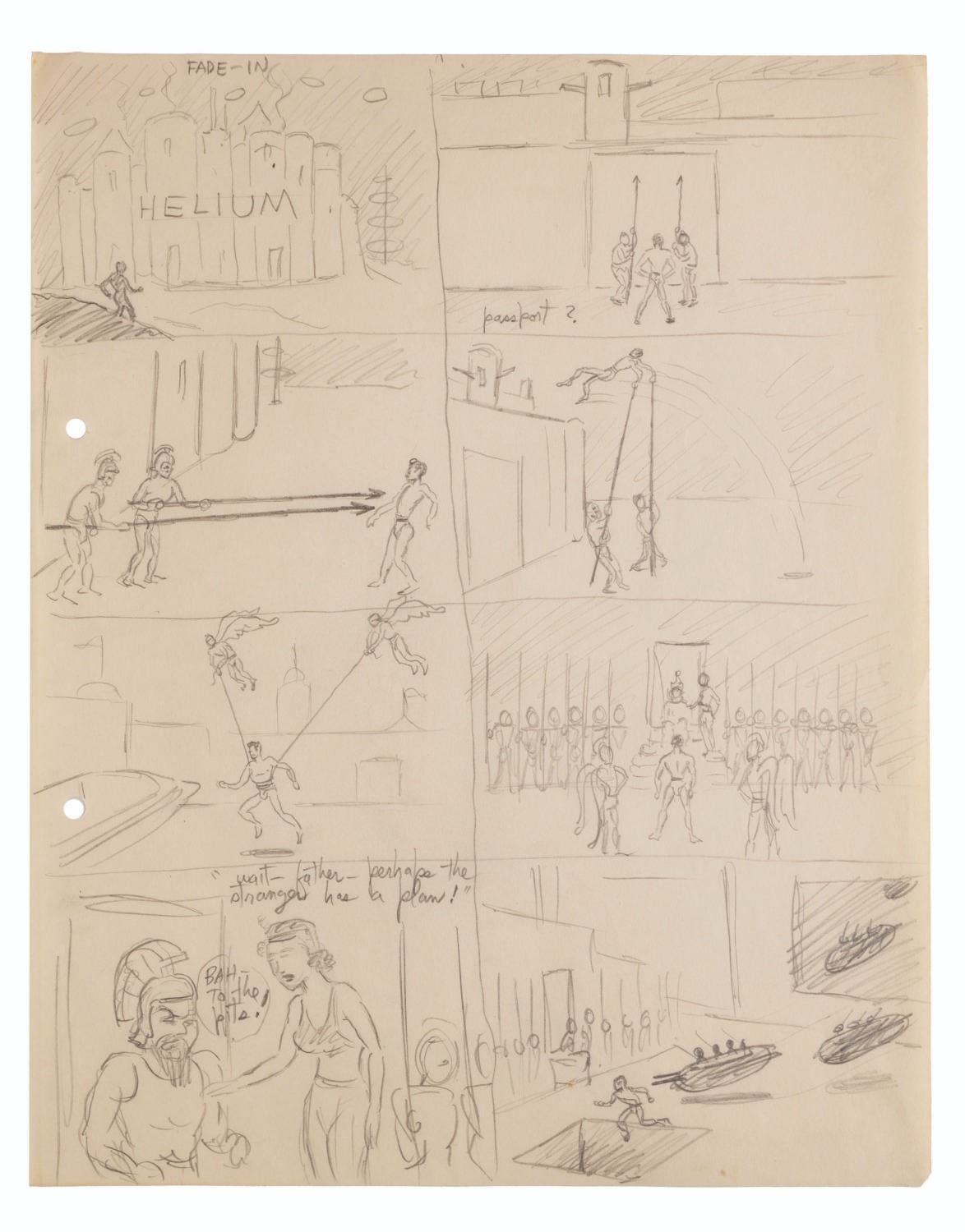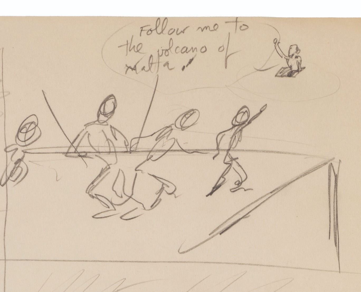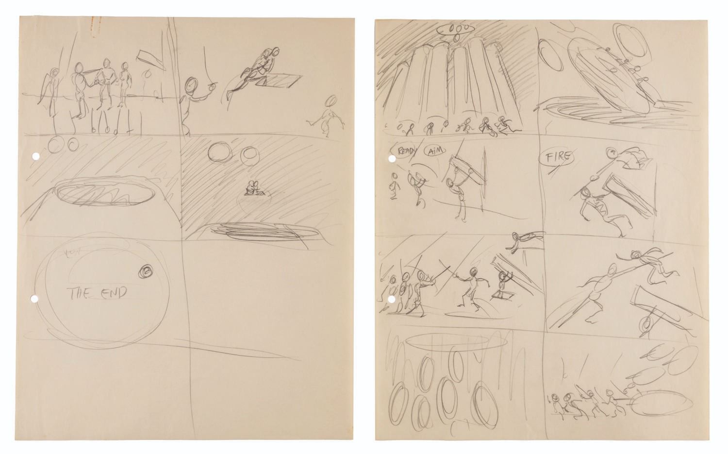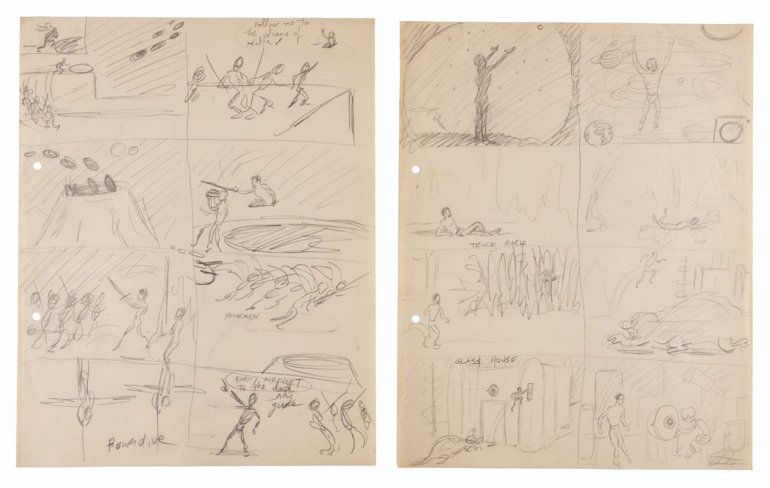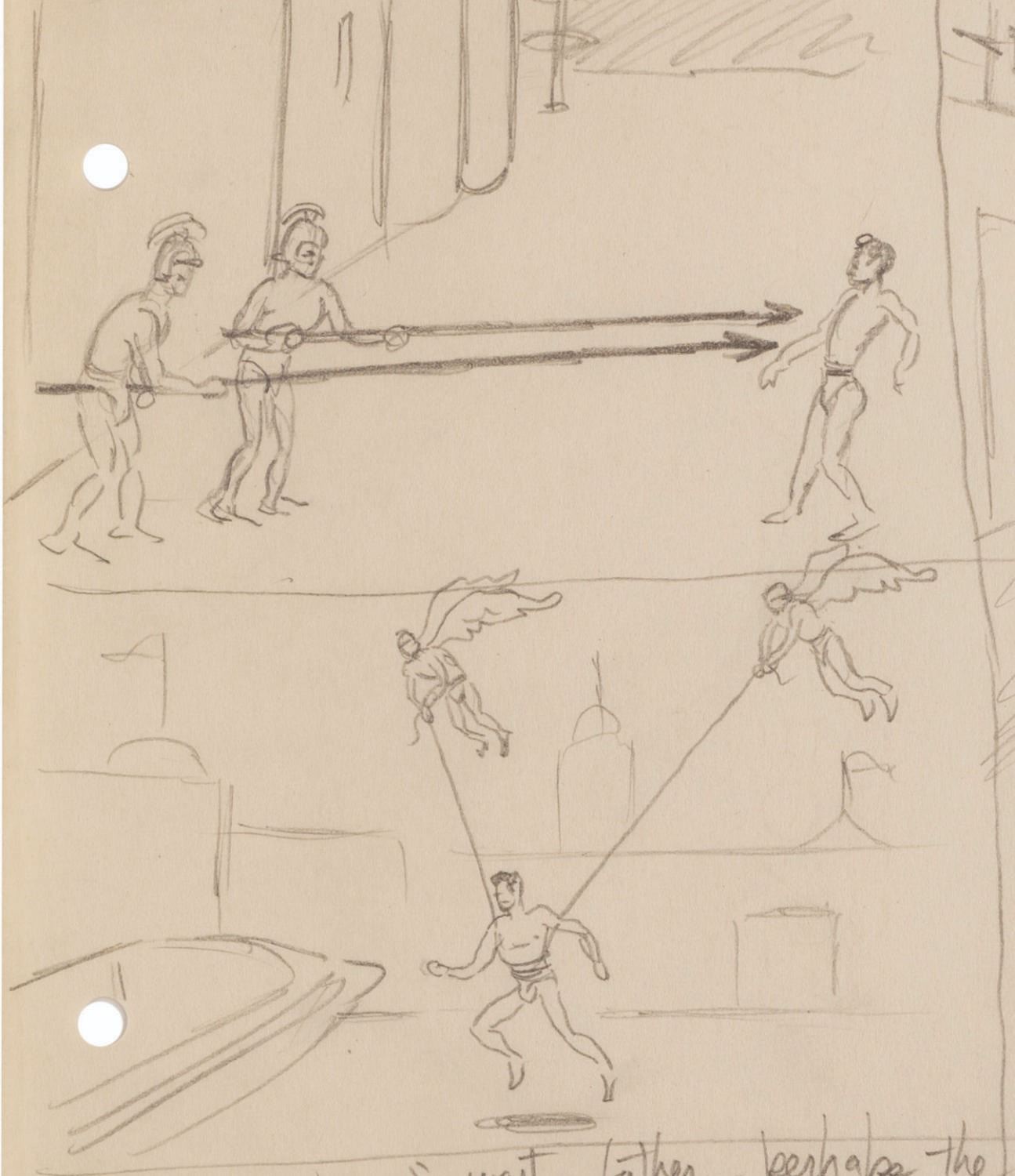(Clampett, 1934-35) A collection of nine pages of graphite storyboard drawings and dialogue for “Warlord of Mars” Chapter I, The Black Pirates of Barsoom. The pages include sequences where John Carter is captured, encounters a mad scientist, and learns about the warring factions of Barsoom. Measuring 9.5” x 12” each, the pages are in good to very good condition with creases, discoloration from age, stains, and edge wear from production use.