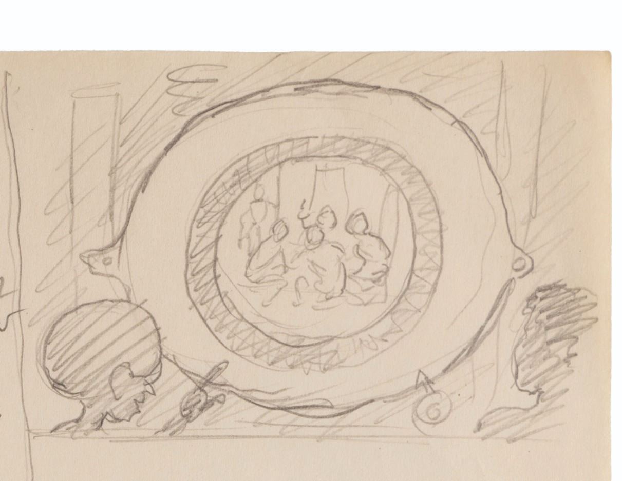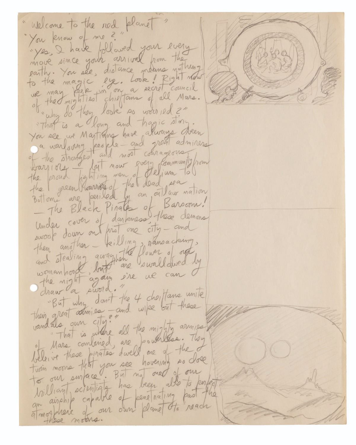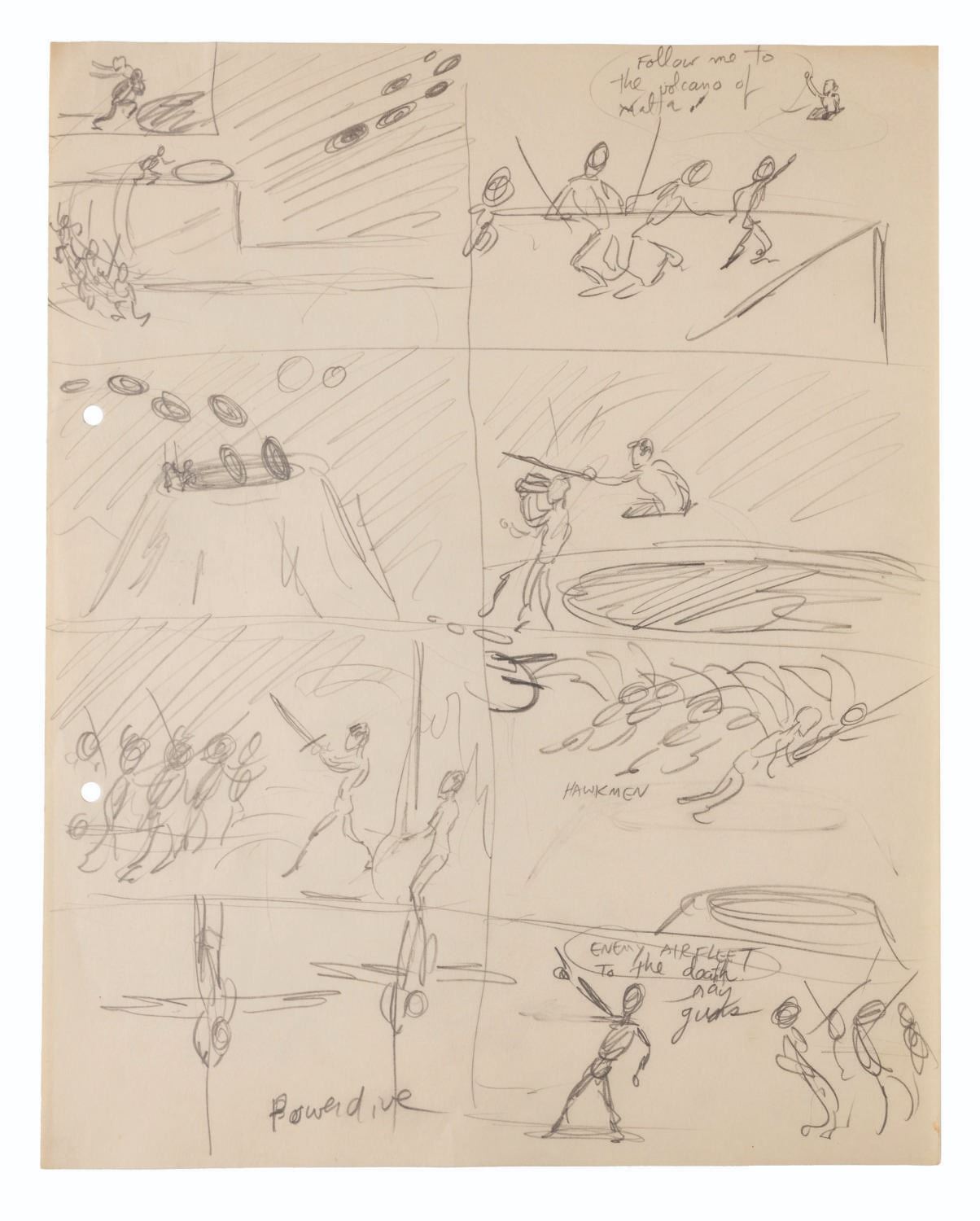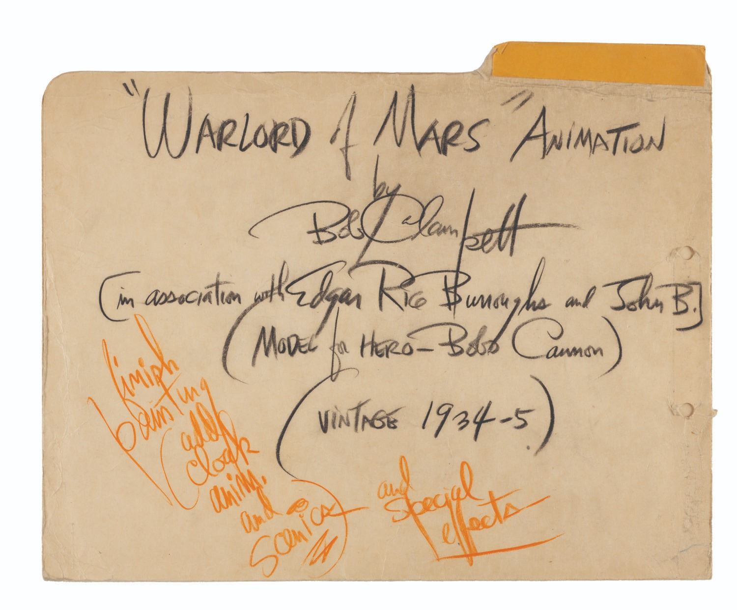 (Clampett, 1934-35) A collection of nine pages of graphite storyboard drawings and dialogue for “Warlord of Mars” Chapter I, The Black Pirates of Barsoom. The pages include sequences where John Carter is captured, encounters a mad scientist, and learns about the warring factions of Barsoom. Measuring 9.5” x 12” each, the pages are in good to very good condition with creases, discoloration from age, stains, and edge wear from production use.