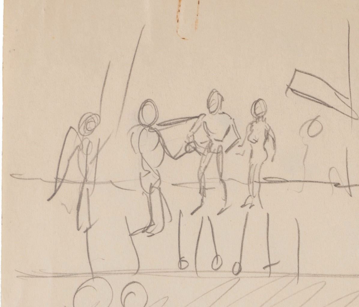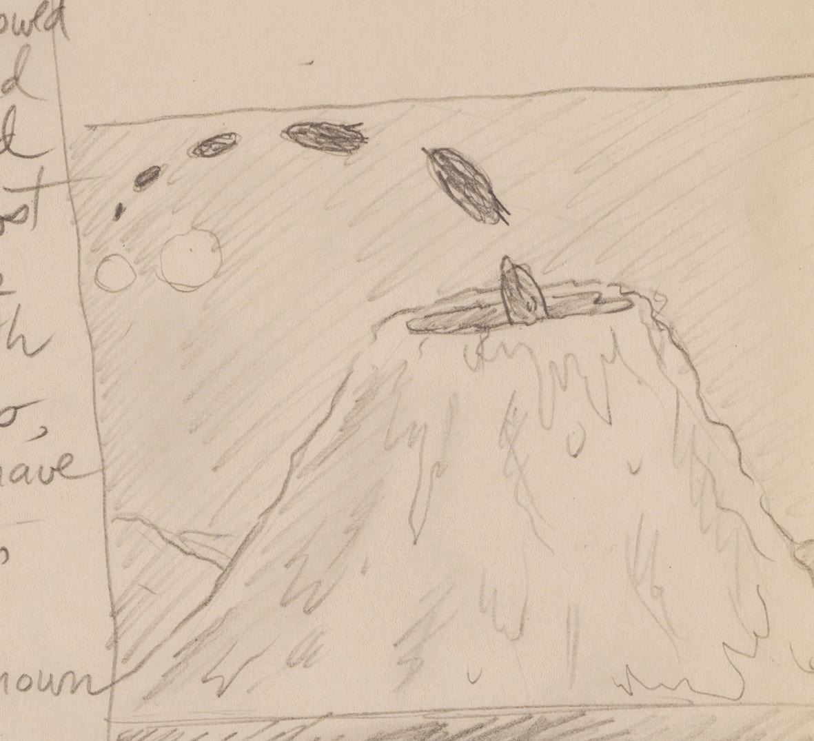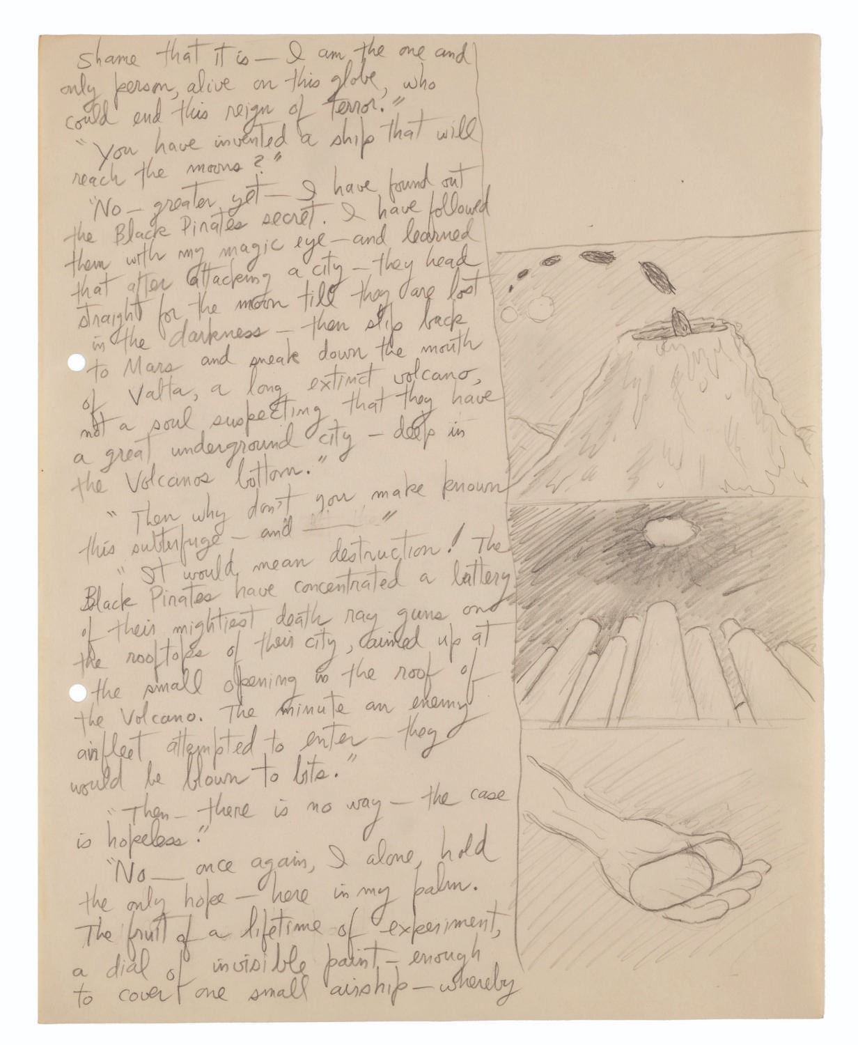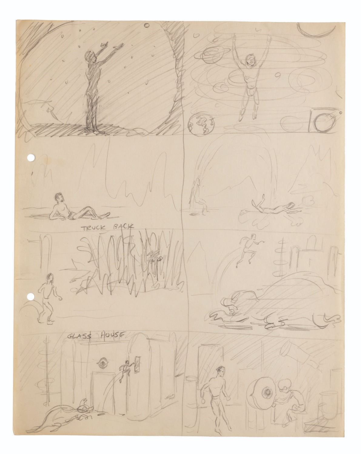 (Clampett, 1934-35) A collection of nine pages of graphite storyboard drawings and dialogue for “Warlord of Mars” Chapter I, The Black Pirates of Barsoom. The pages include sequences where John Carter is captured, encounters a mad scientist, and learns about the warring factions of Barsoom. Measuring 9.5” x 12” each, the pages are in good to very good condition with creases, discoloration from age, stains, and edge wear from production use.