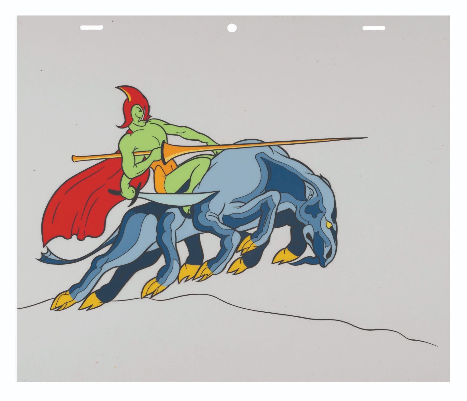 (Clampett, 1970s) A hand-painted “Warlord of Mars” cel of a green Thark, a four-armed native of Mars, riding into battle atop an eight-legged Thoat. This piece was created decades after the project was shelved, possibly for the 1976 Jim Steranko’s Mediascene magazine feature covering the history of the project. With an image size of 7.75” x 12” on a 10.5” x 12.5” cel, the piece is in very good condition with light wear, surface scratches, and spots of discoloration.