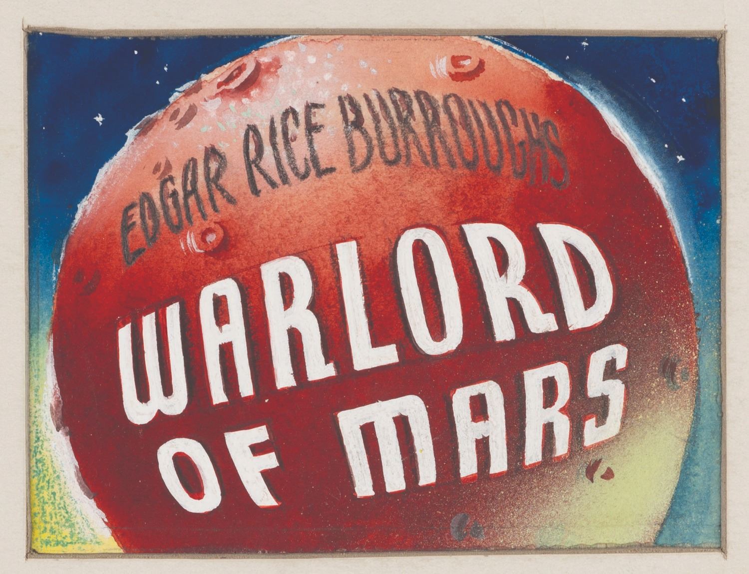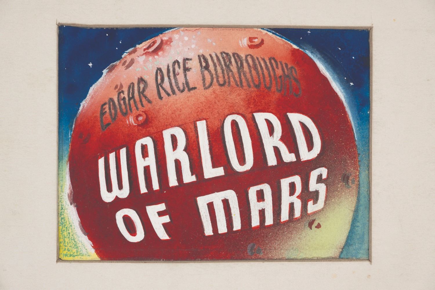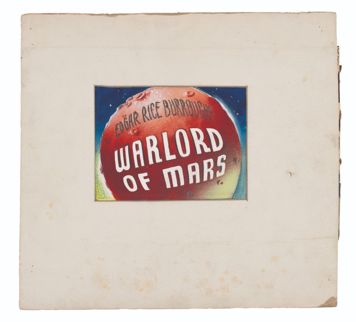 (Clampett, 1934-35) An original hand-painted concept title treatment for “Warlord of Mars,” based on Edgar Rice Burroughs's “Barsoom” series. Accomplished in gouache, with an image size of 4” x 5.25” on 6.75” x 10.75” artist board, and displayed in a 10.25” x 11” matte, the painting is in very good condition with scratches, while the matte displays in fair condition with pinholes, water damage, creases, folds, and discoloration from age.