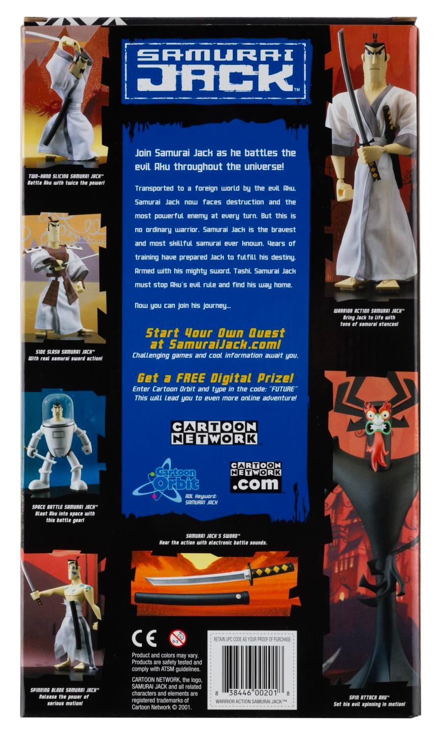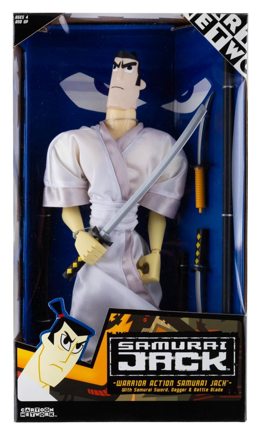 (Cartoon Network, 2001) A Warrior Action "Samurai Jack" figure with weapons. Measuring 12" tall in its 8" x 14" x 3" deep original box, the unopened figure is in fine condition, with the box in very good condition with light handling wear.