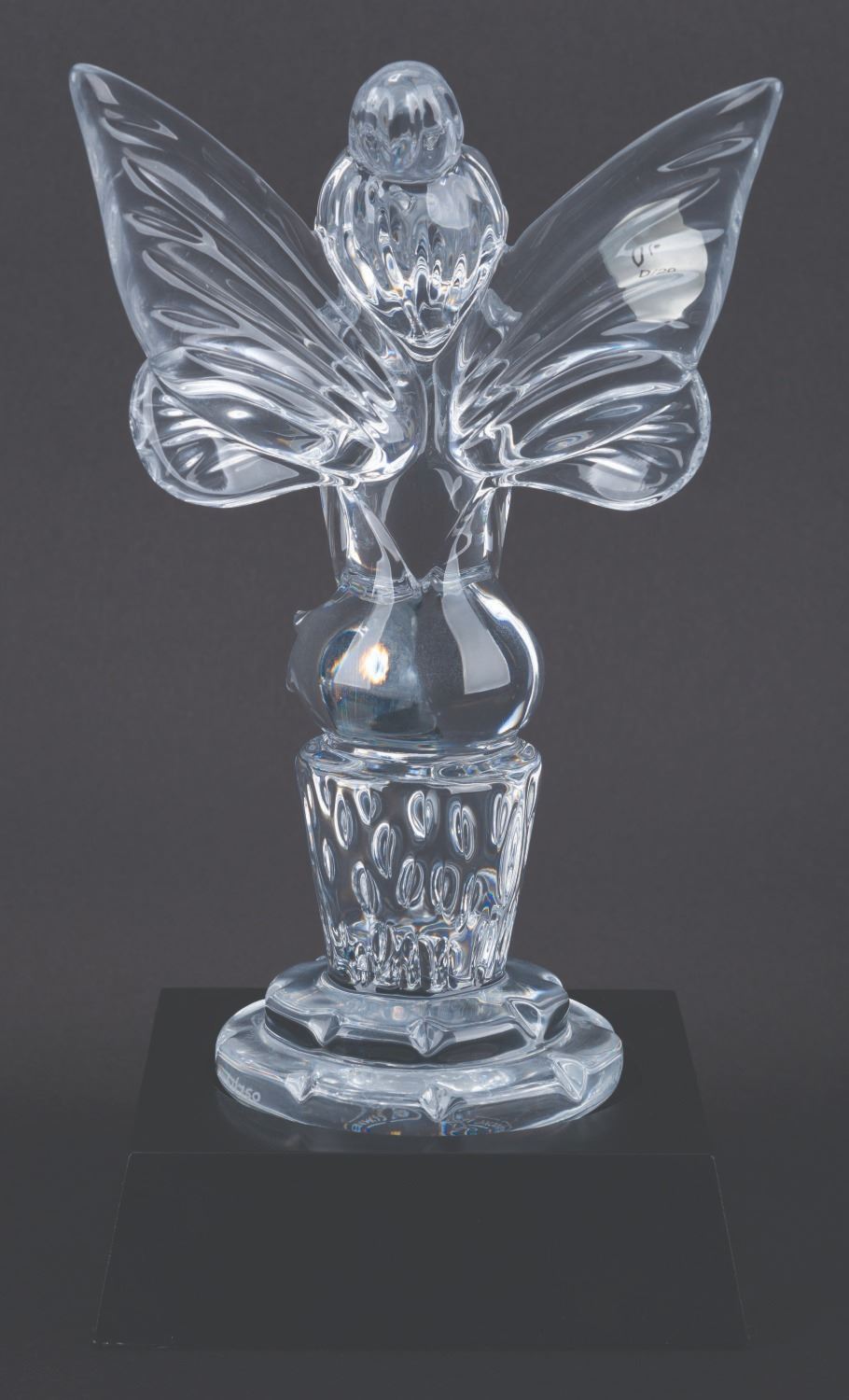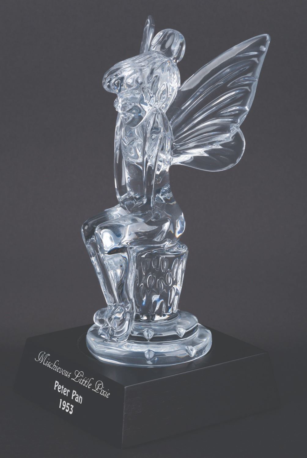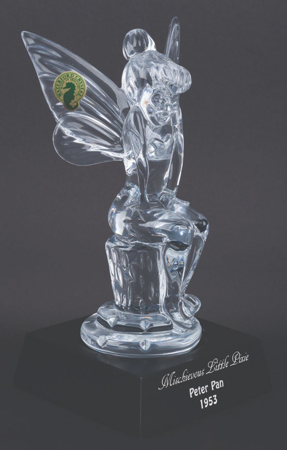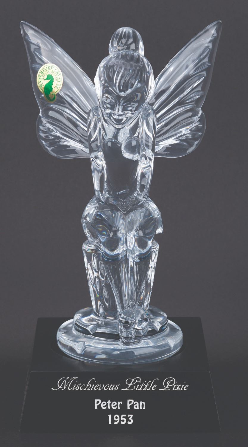 (Waterford, 1997) A limited edition Waterford crystal figure of Tinker Bell titled "Mischievous Little Pixie," released exclusively for the 1997 Disneyana Convention. Standing 8" tall atop the 4" x 4" base, the figure numbered 51/750 is in fine condition, with the original box and COA.