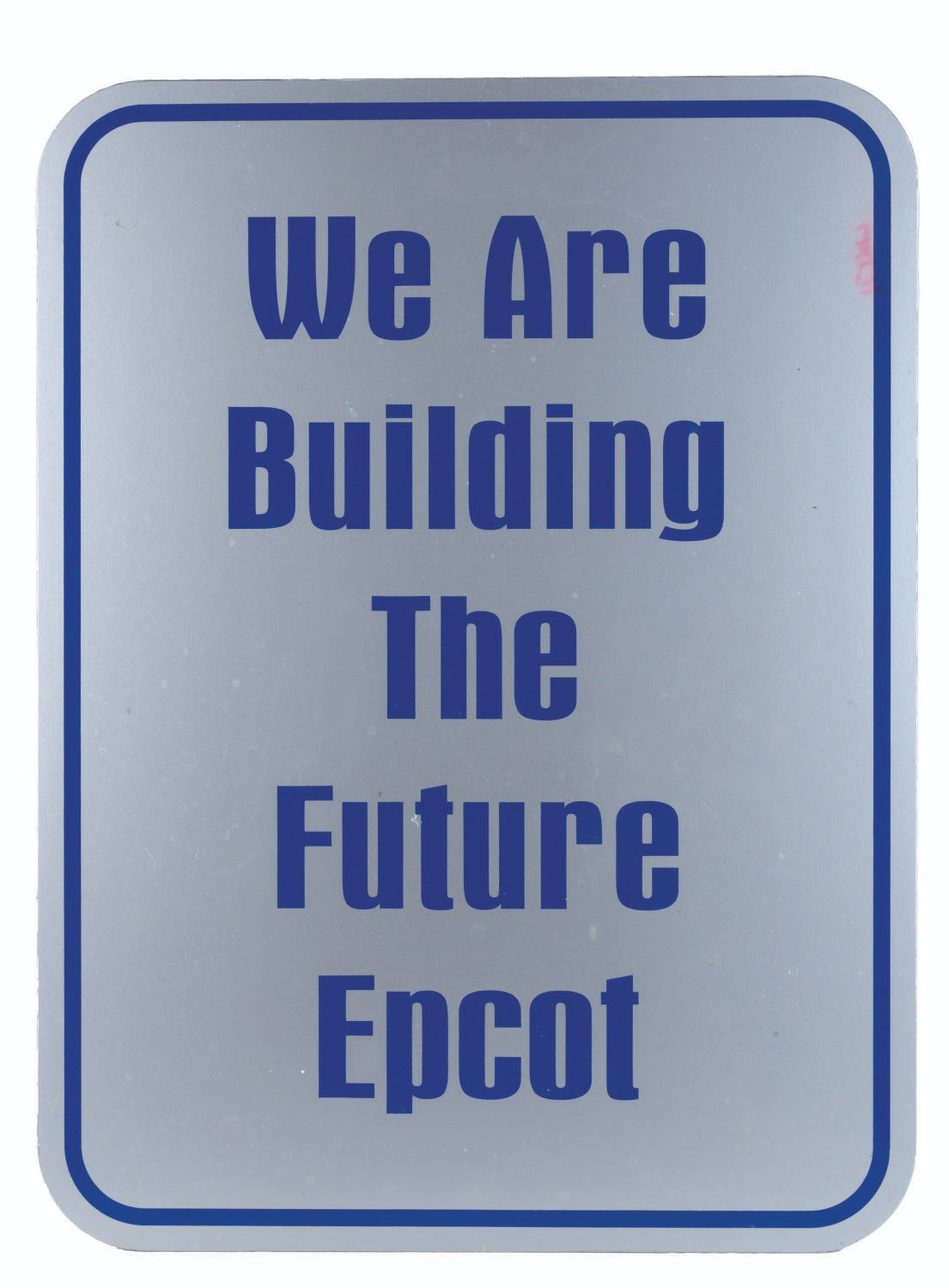 (Epcot, 2010s) A "We are Building the Future Epcot" sign used during a period of refurbishment at Epcot. The sign features vinyl decal lettering over a PVC board. Measuring 24" x 18", the sign displays in good, Park-used condition with edge wear, scratches, and soiling.