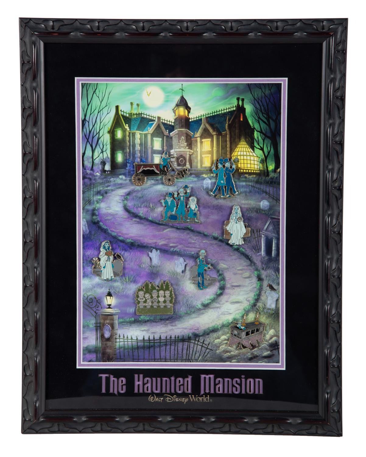 (Walt Disney World, 2008) A Haunted Mansion “Welcome Foolish Mortals” Framed (8) Pin Set. This set was designed by Disney Artist Garrett Webb and produced in an edition size of 100. The pins depict the Hatbox Ghost in the Hearse, Dueling Ghosts, Hitchhiking Ghosts, a Mortal Bride, The Bride with a raven, Ezra, Singing Busts, and a Coffin Ghost. Measuring 13.5”x17.5”, this framed piece is in fine condition with its Certificate of Verification on the reverse.
