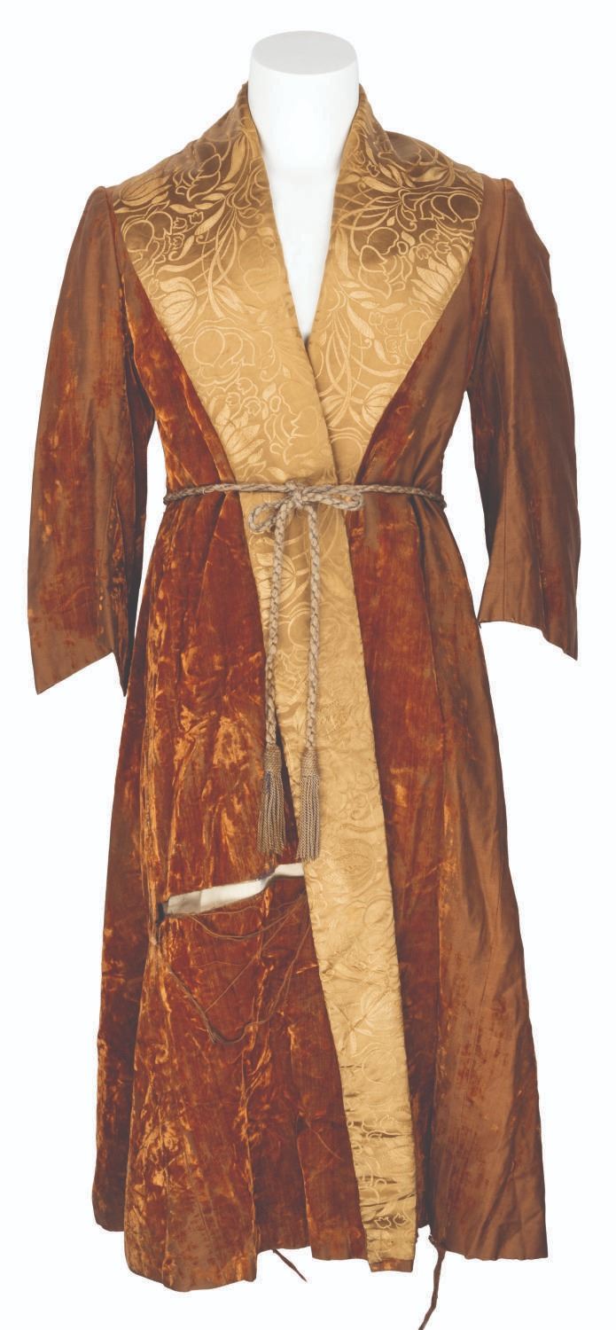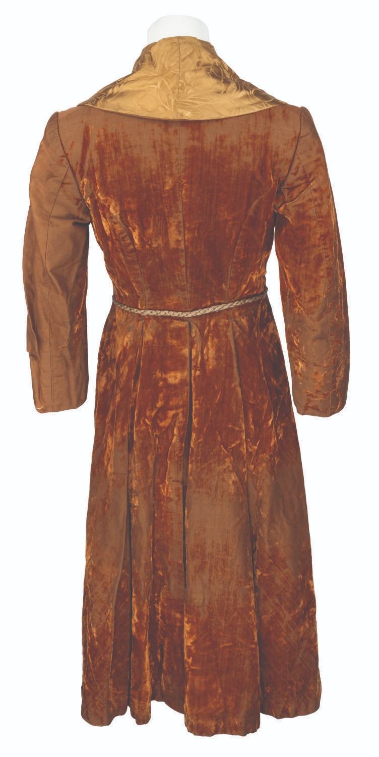 (Western Costume Co., 1950s-1970s) A robe worn by French actor Louis Jourdan. Jourdan made his American debut in Alfred Hitchcock’s “The Paradine Case,” starred in the Best Picture-winning “Gigi,” and was the villain in the James Bond film “Octopussy.” The elegant burnt orange and gold robe was worn by Jourdan most likely on set or in his dressing room. The Western Costume Co. label features the inventory number 39-2570-1, his name, and a chest size of 38. The robe is in fair condition with tears including a 13” tear on the ride side, fraying, wear, and discoloration from age.
