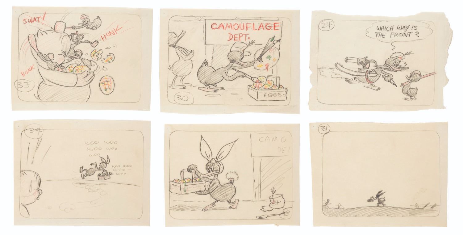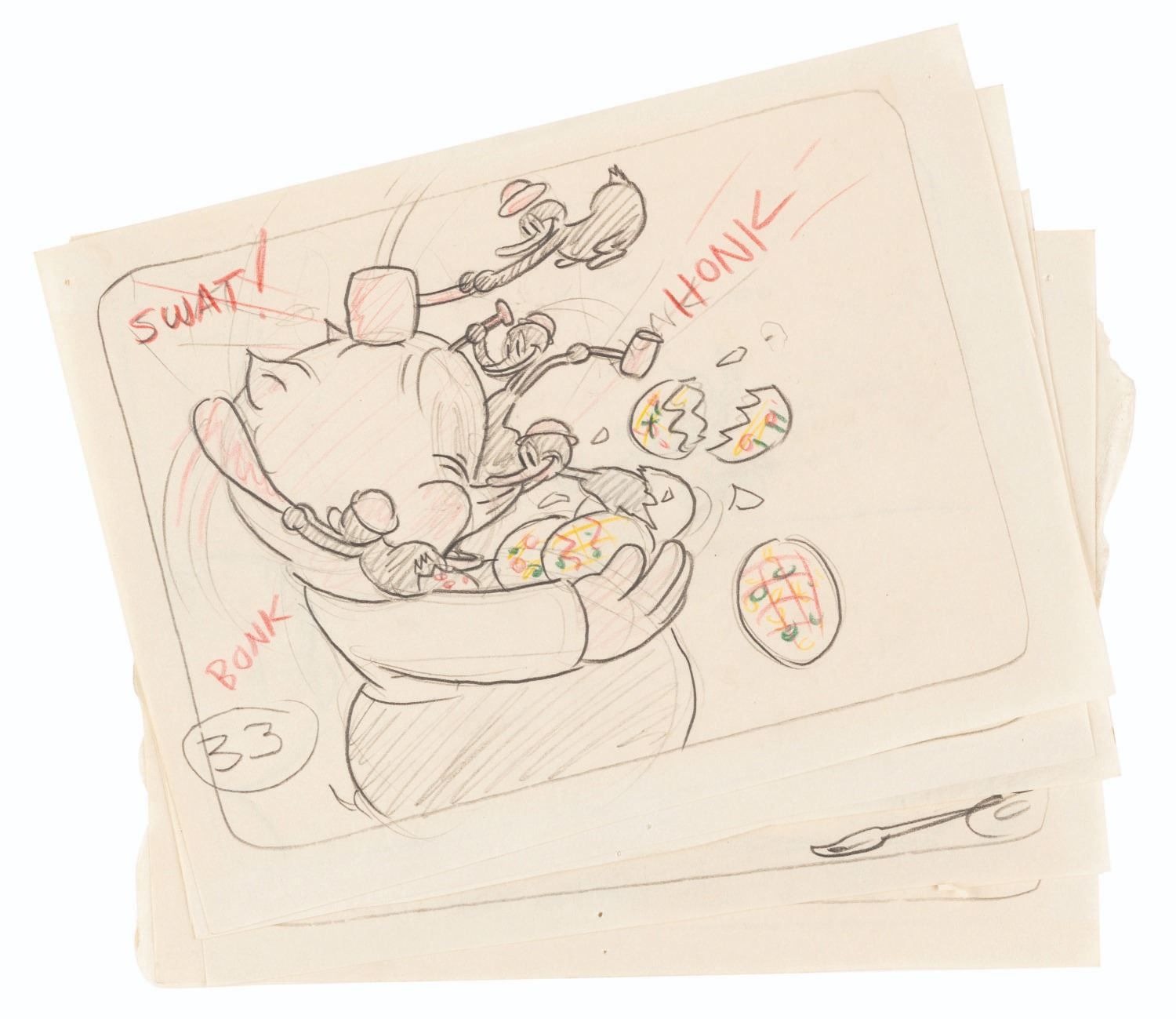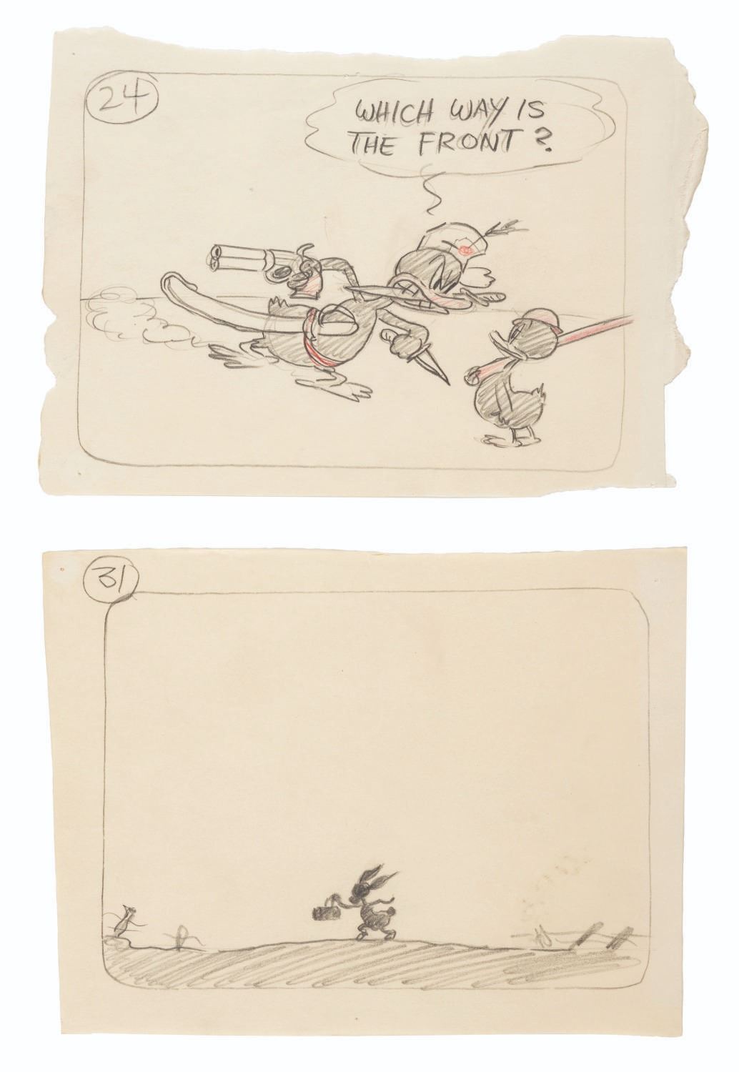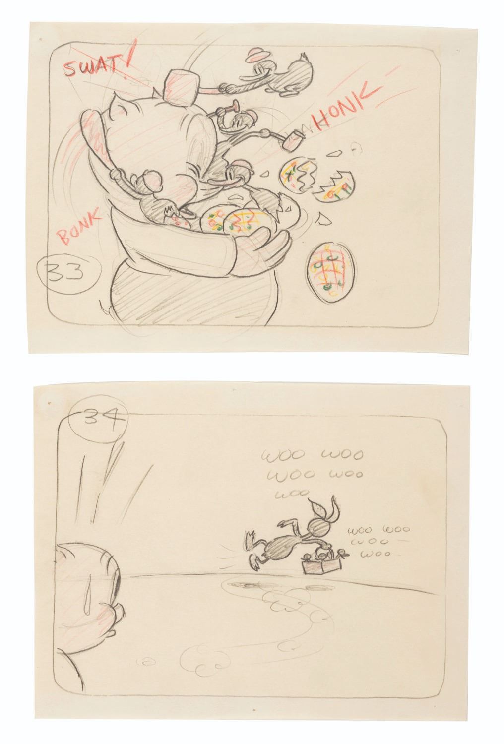 (Schlesinger, 1938) A collection of six storyboard panels featuring Porky, Daffy, and the Ducklings from the Looney Tunes short “What Price Porky,” directed by Bob Clampett. Accomplished in graphite and measuring 5.5” x 7.5” each, the panels display in very good production-used condition with creases, pinholes with some corner tears, and light discoloration from age.