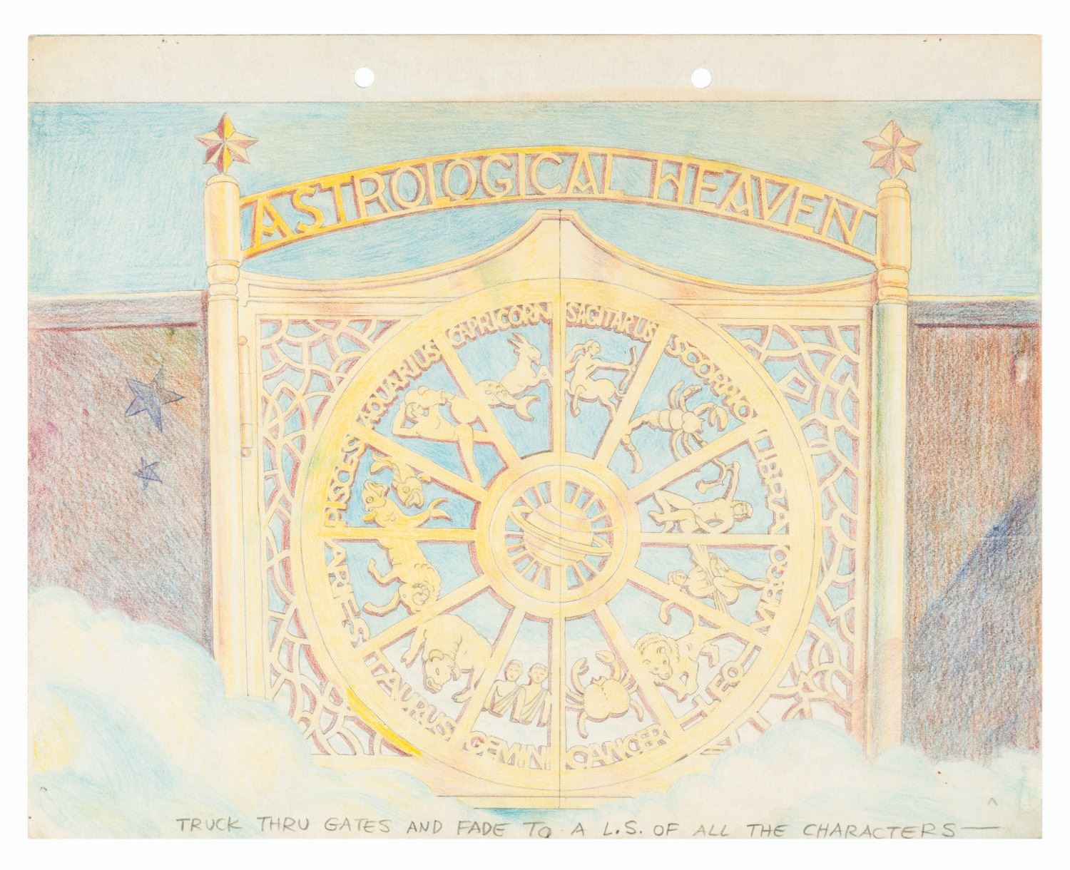 (MGM, 1936-37) An original storyboard drawing for the full-color animated opening to “When’s Your Birthday?” starring Joe E. Brown as an astrology-obsessed boxer. Bob Clampett drew this image of the gates to “Astrological Heaven” with color pencils, noting camera movement and transition on the bottom. Measuring 8.5” x 12” on 9.5” x 12” animation paper, the drawing is in very good condition, with expected light wear from production use and age.