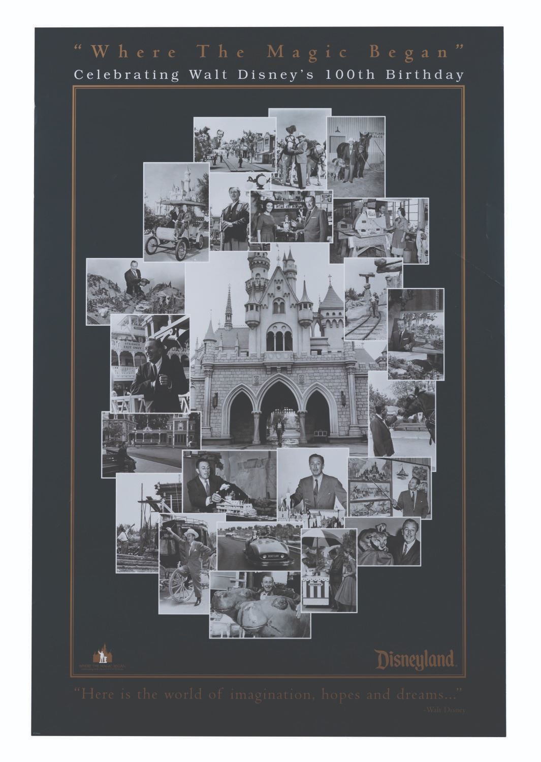 (Disneyland, 2001) A Disneyland poster celebrating Walt Disney's 100th birthday. Measuring 24" x 36", the poster is in good condition with wear from display and a 4" crease in the upper right.