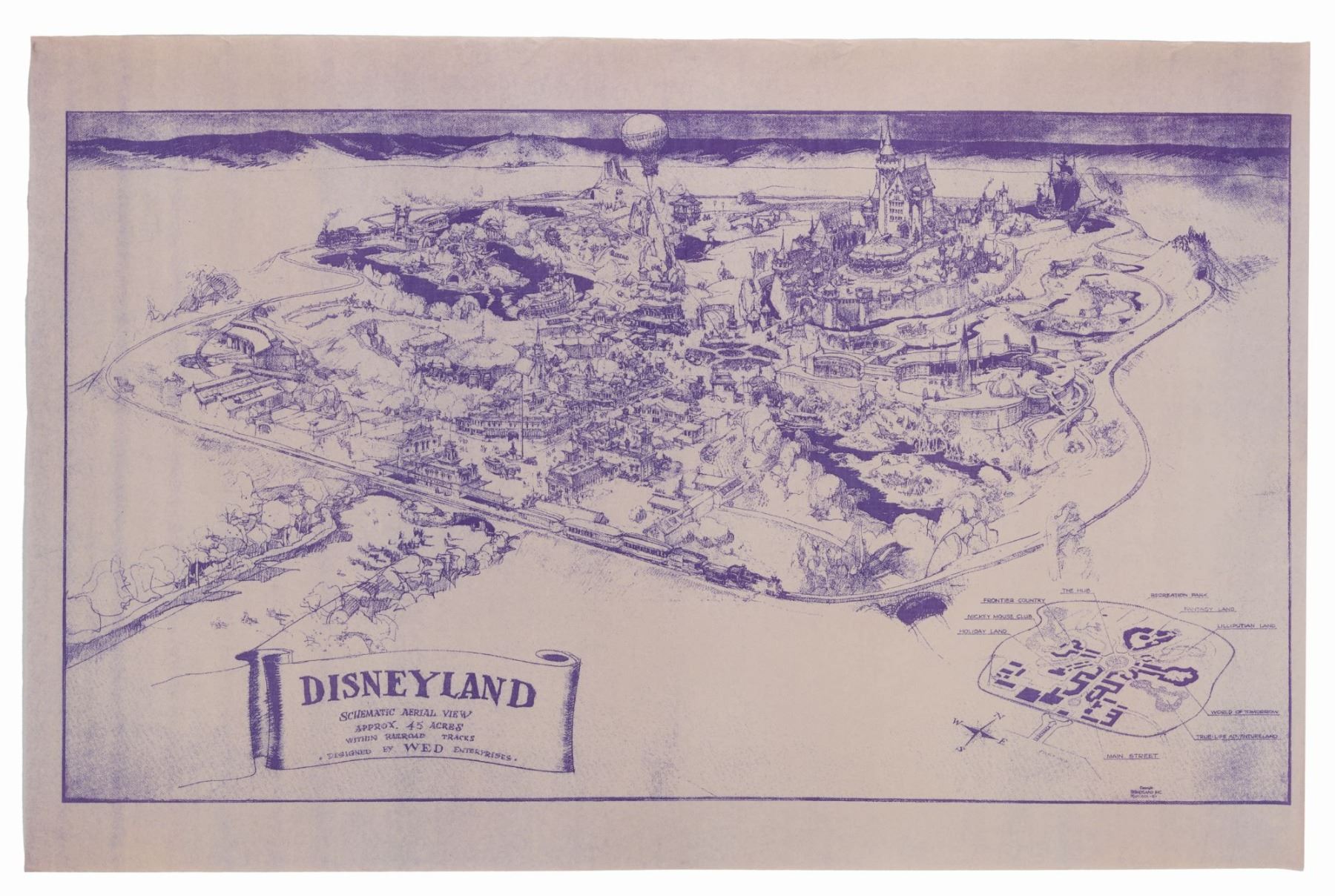 (Disney, 1970s-80s) A whiteprint copy of Herb Ryman’s original concept for the very first full depiction of Disneyland. On a Saturday morning in September 1953, Walt Disney asked artist Herb Ryman to come to the Studio right away. Without shaving or showering, Ryman arrived to find Walt with Dick Irvine, Marvin Davis, and Bill Cottrell in a room filled with concept sketches and elevations for Walt's newest dream: Disneyland. Walt excitedly outlined his vision of the Park. Roy Disney was flying to New York on Monday to secure financing with a giant sketch of the Park to represent Walt's vision to the bankers. Ryman asked to see the sketch, and Walt responded, "You're going to do it." From then until Monday morning, Walt and Herb spent a marathon 42 hours creating a 43" x 70" bird's-eye view of the proposed Park. Brownline copies were printed for the presentation book, and hand-colored by Davis and Irvine. The rest is Disney Parks history. Ryman's pencil-on-vellum original is a carefully guarded treasure of Walt Disney Imagineering. This is a studio-produced copy, printed likely in the 1970s or 1980s as a reference. Measuring 24" x 36", the whiteprint is in very good condition with light edge wear and creases.