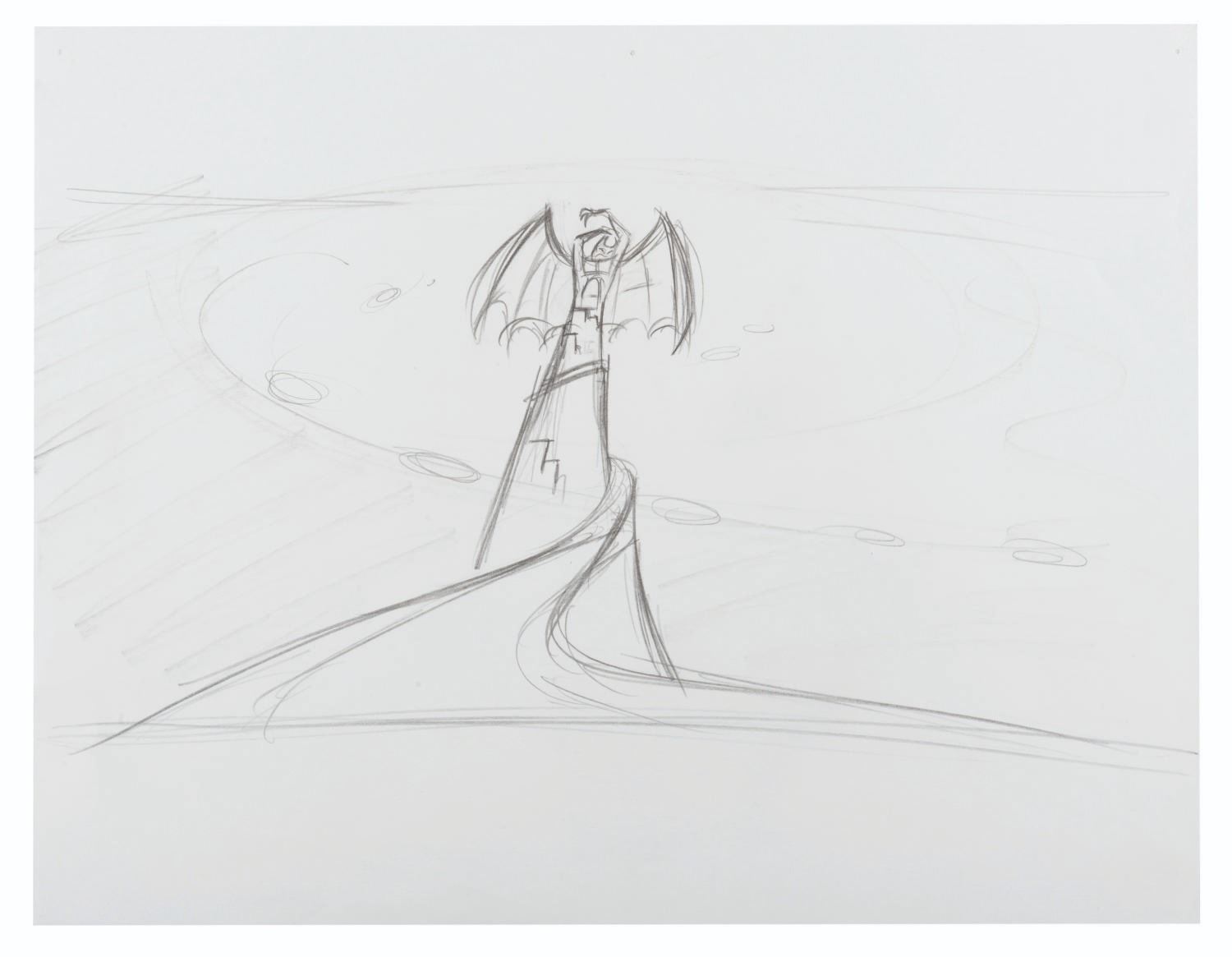 (Disney, 1988) An original "Who Framed Roger Rabbit" storyboard drawing of Chernabog. The imposing "Fantasia" villain featured in this art did not make the final cut of the film. With an image size of 5.5" x 11" on 8.5" x 11" drawing paper, the graphite drawing is in very good condition with light creases and pinholes from production use.