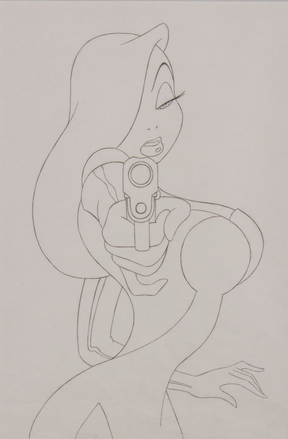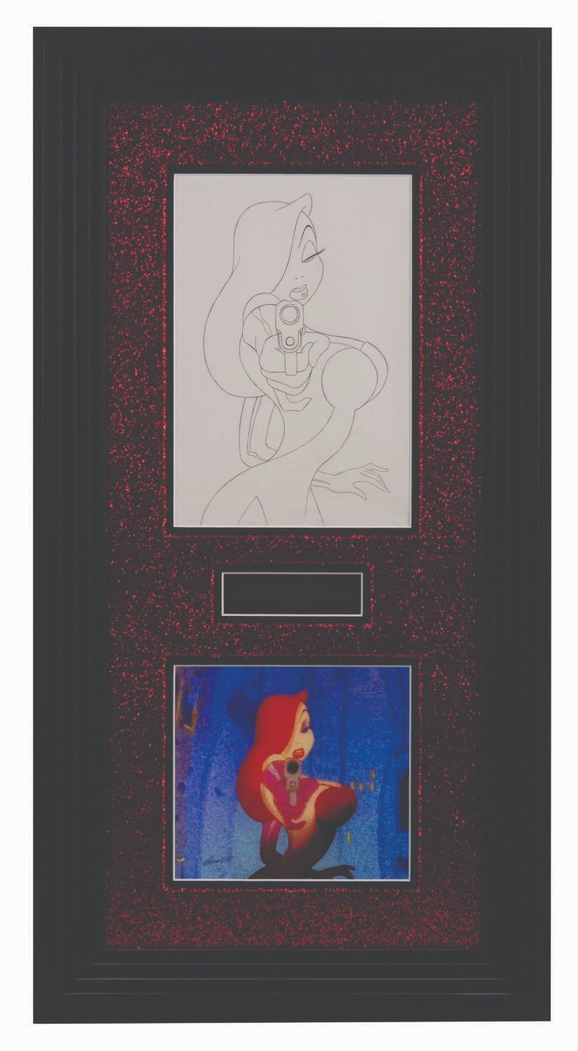(Disney, 1988) A framed original production drawing of Jessica Rabbit from "Who Framed Roger Rabbit." Jessica has an image size of 5.5" x 9.5" on trimmed animation paper. The drawing has been beautifully framed and matted with a print of the matching scene. The entire piece measures 14.75" x 28" and is in very good condition with light creases on the paper and light wear to the frame.