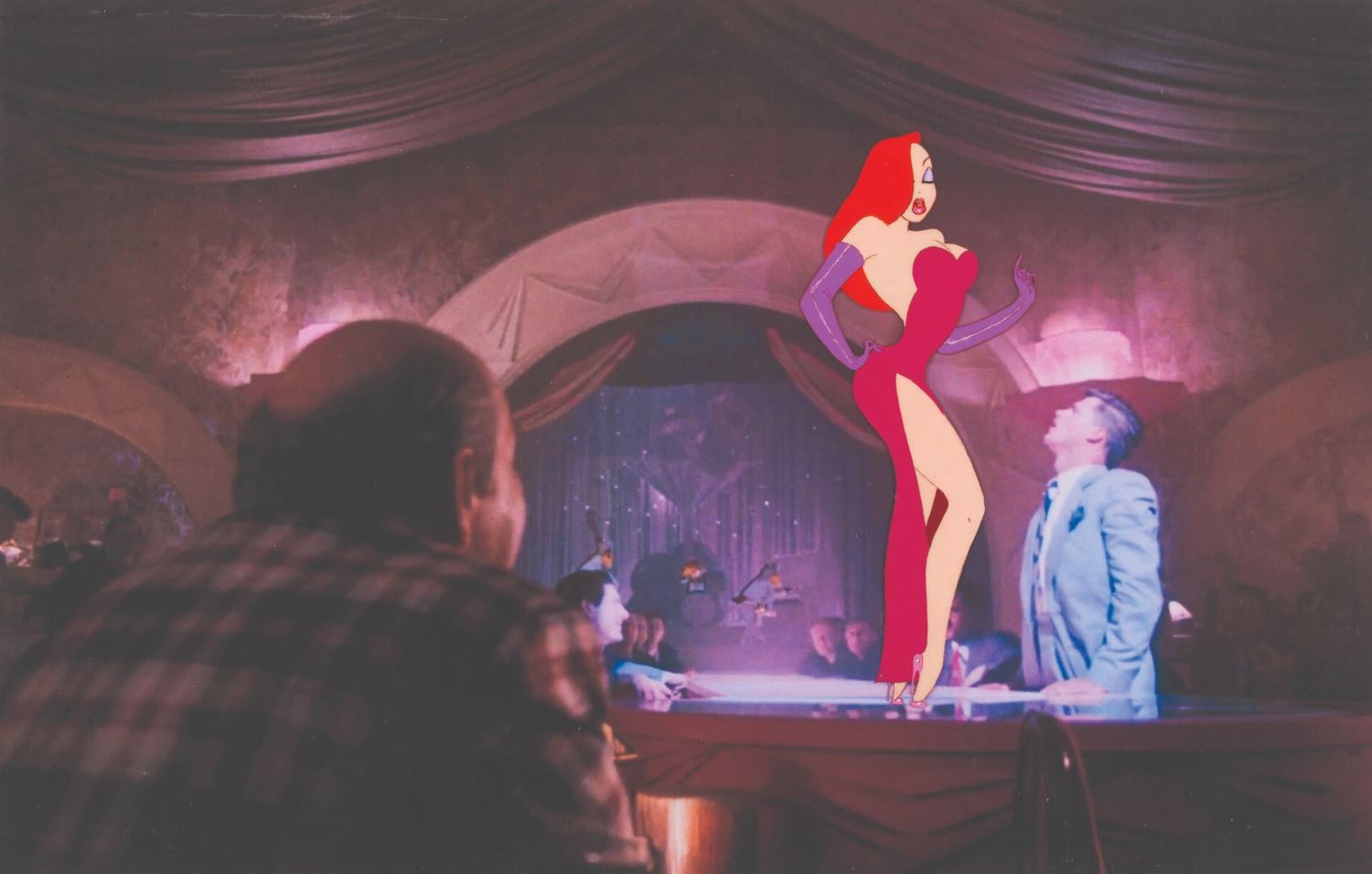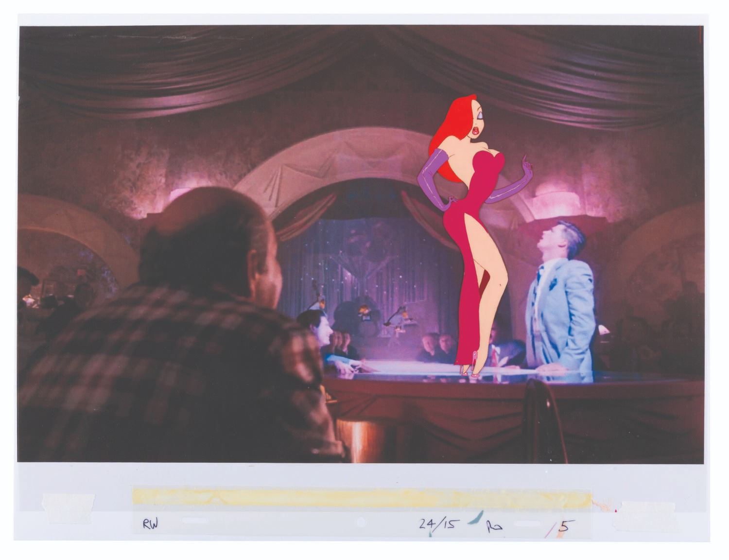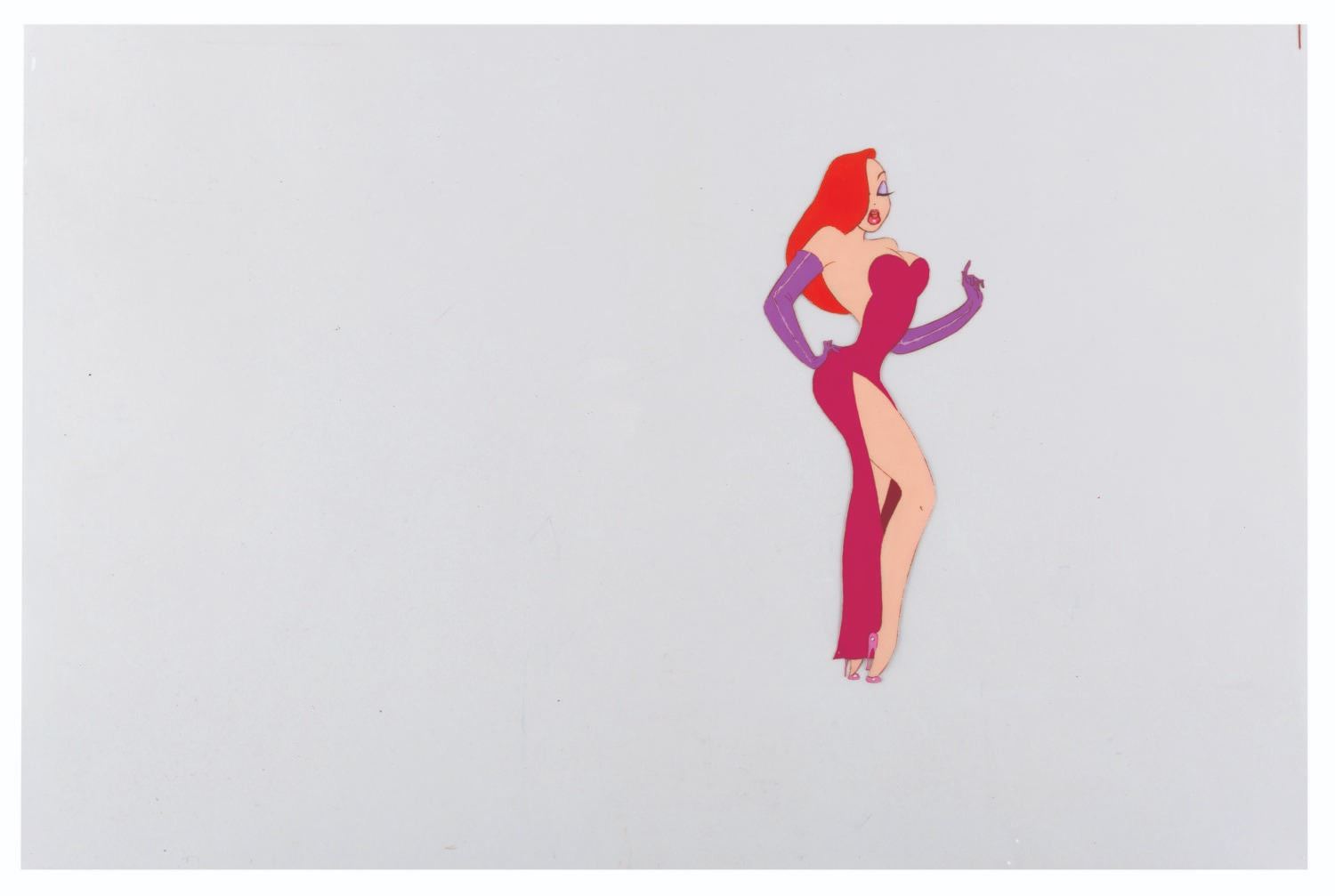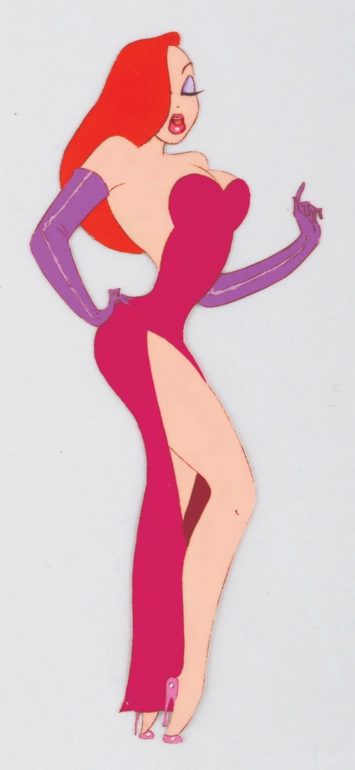(Disney, 1988) A hand-painted original production cel of Jessica Rabbit from "Who Framed Roger Rabbit," with a color copy background. This cel is from Jessica's famous performance of "Why Don't You Do Right?" at The Ink and Paint Club. Measuring 2.75" x 6.75" on a 12" x 16.5" cel, the art is in very good condition with light line loss, scratches, paper transfer on the reverse, and creases on the cel, which do not affect the image.