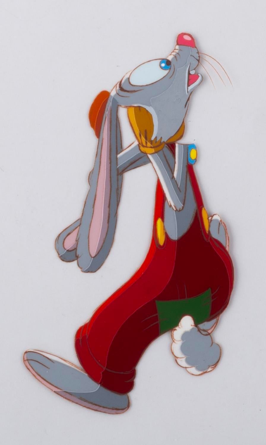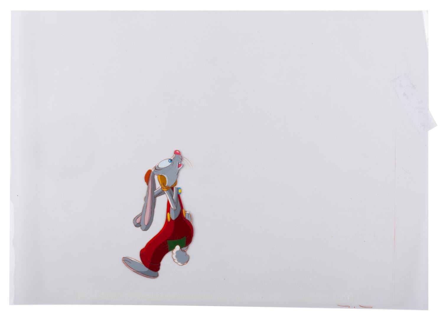 (Disney, 1986) An original production cel of Roger Rabbit from the live-action and animation composite test for “Who Framed Roger Rabbit.” With a character image size of 5.25” x 3” on a trimmed 11.75” x 16.5” cel, the piece is in very good condition with light edge wear, a crease in the upper right corner, and a 0.25” x 11” strip of adhesive residue along the bottom edge, which does not affect the image.