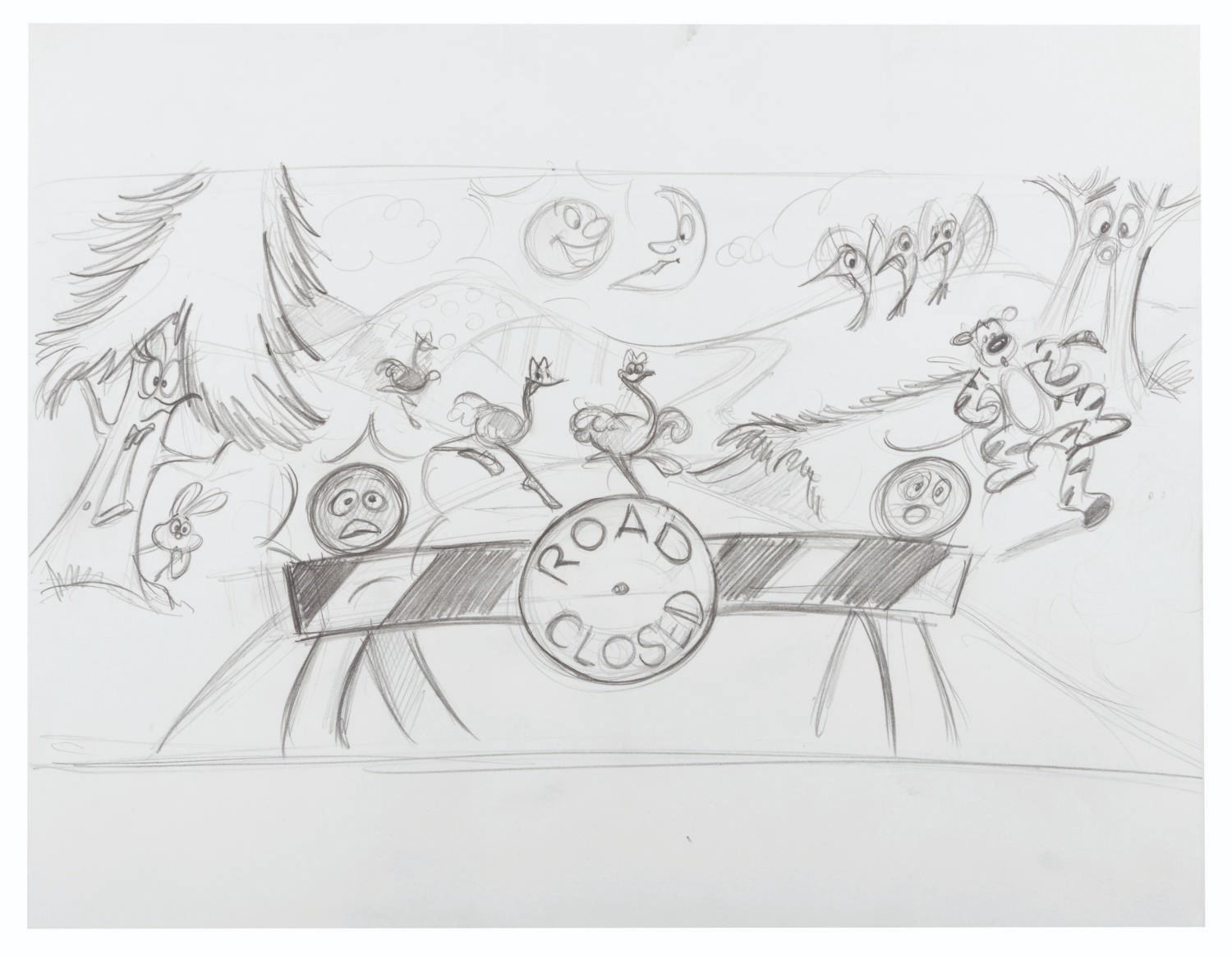 (Disney, 1988) An original hand-drawn storyboard from"Who Framed Roger Rabbit," depicting the entrance to Toontown and featuring Tigger and the dancing ostriches from "Fantasia." With an image size of 5.75" x 11" on 8.5" x 11" drawing paper, the graphite drawing is in very good condition with light creases and wear from production use.