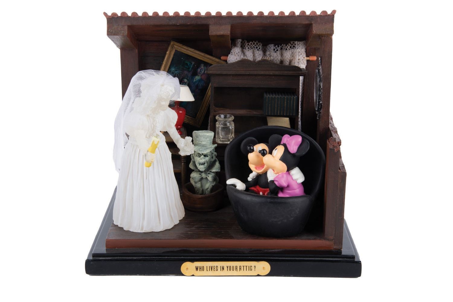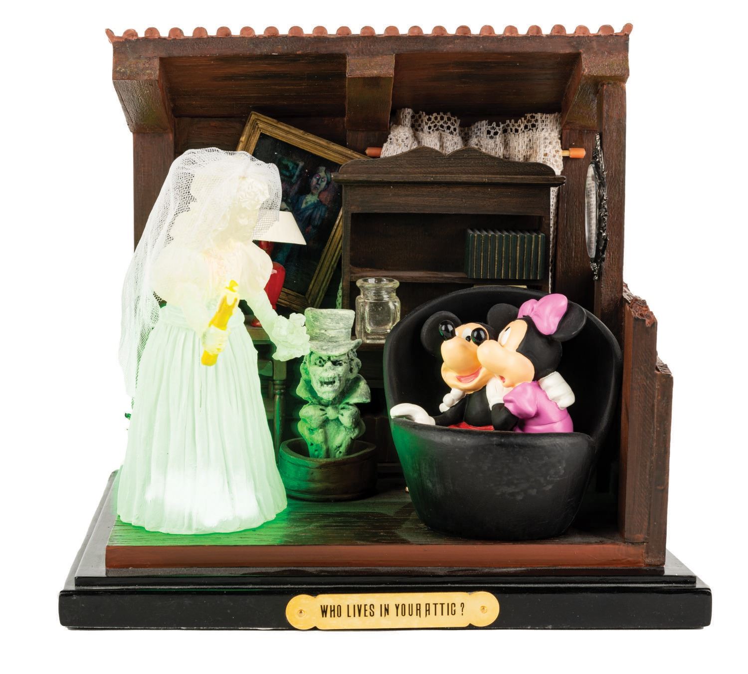 (Walt Disney World, 2003) A "Who Lives in Your Attic?" statue, produced in a Limited Edition of 500 for the Haunted Mansion "999 Happy Haunts" event on October 29, 2003. The statue depicts Minnie and Mickey Mouse in a Doombuggy meeting the Bride and Hatbox Ghost. Additionally, the piece features both illumination and the sound of the bride's ghostly heartbeat, powered by (3) AA batteries (not included). Measuring 8.75" tall and 8.5"x7.5", the diorama is in fine working condition in original box.