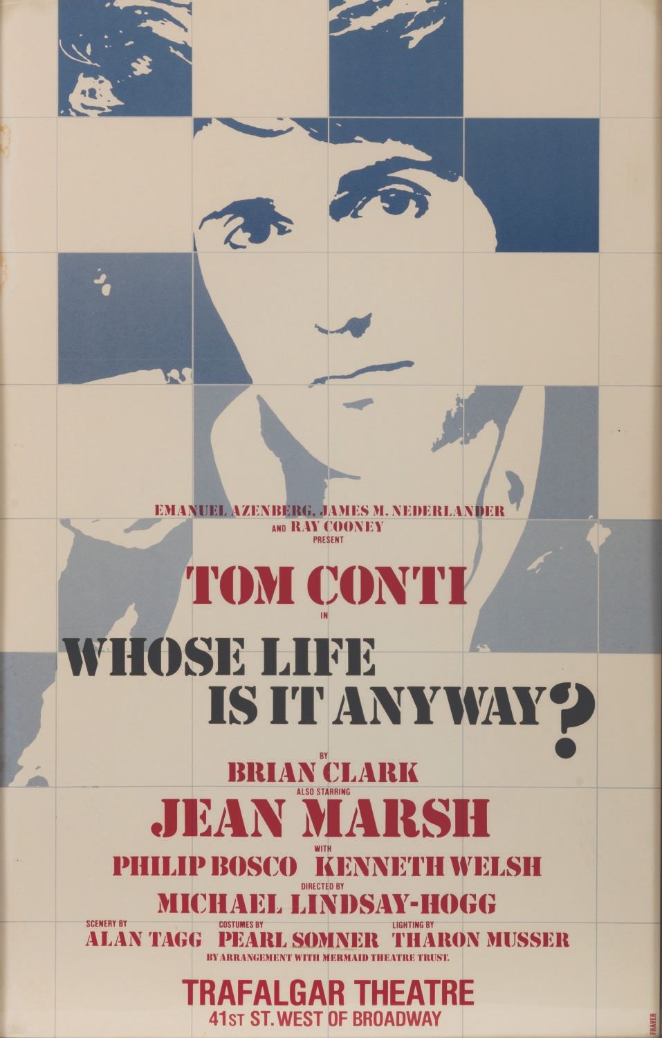 (Tom Conti, 1979) An original window card for “Whose Life is it Anyways?” Tom Conti reprised the role he originated in London for his Broadway debut. Measuring 14" x 22", the window card is in good condition, with light wear including slight staining to the left edge.