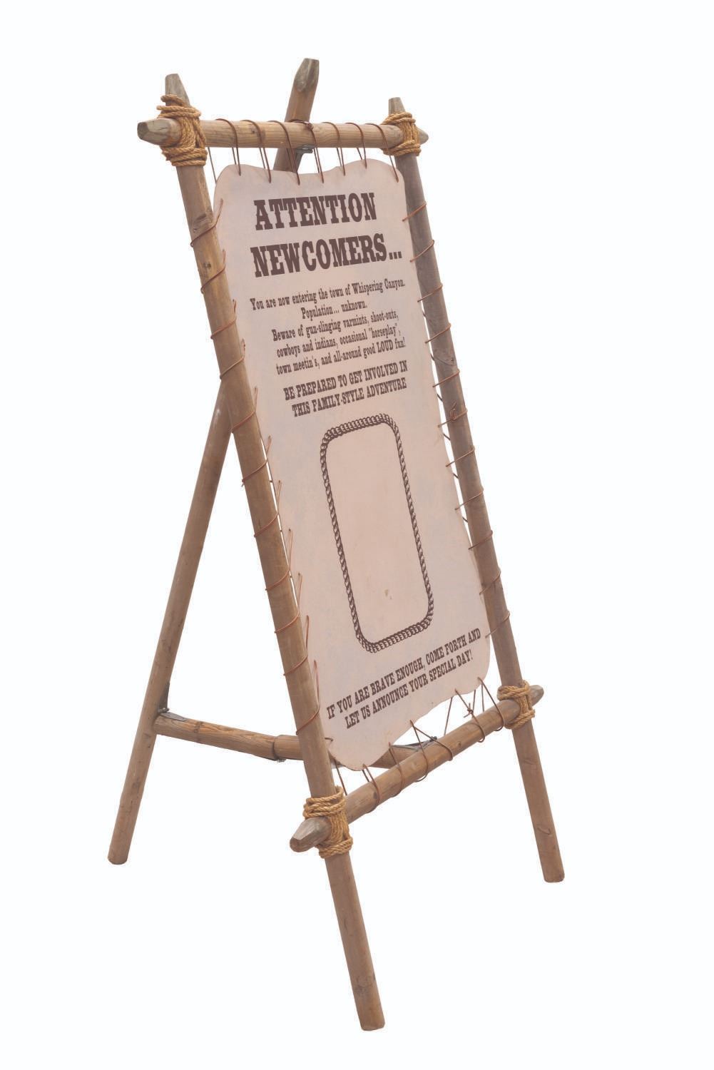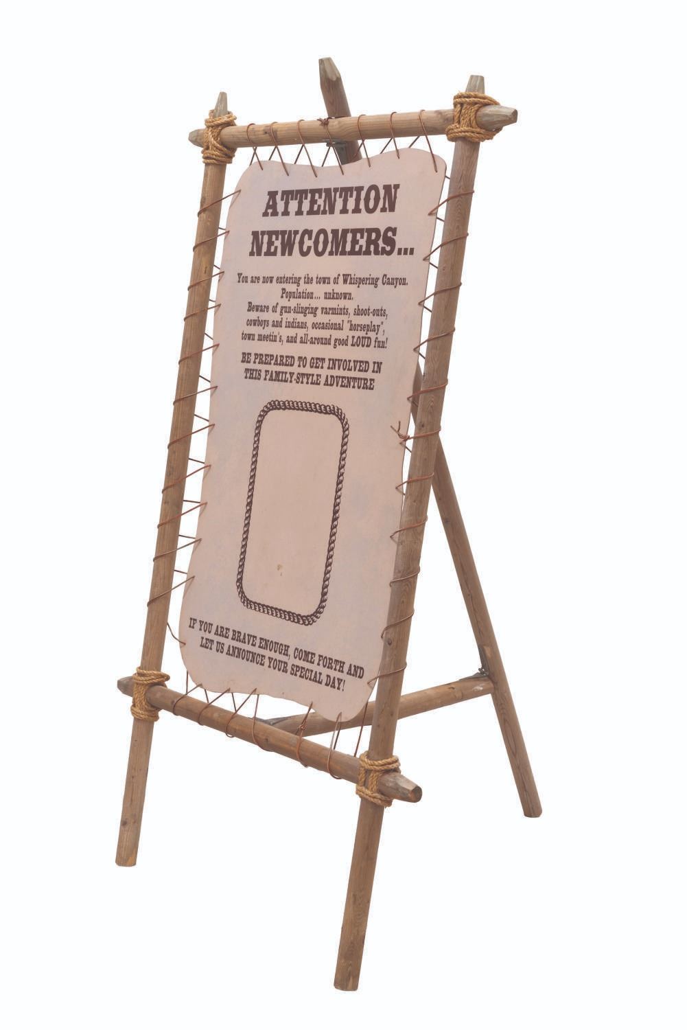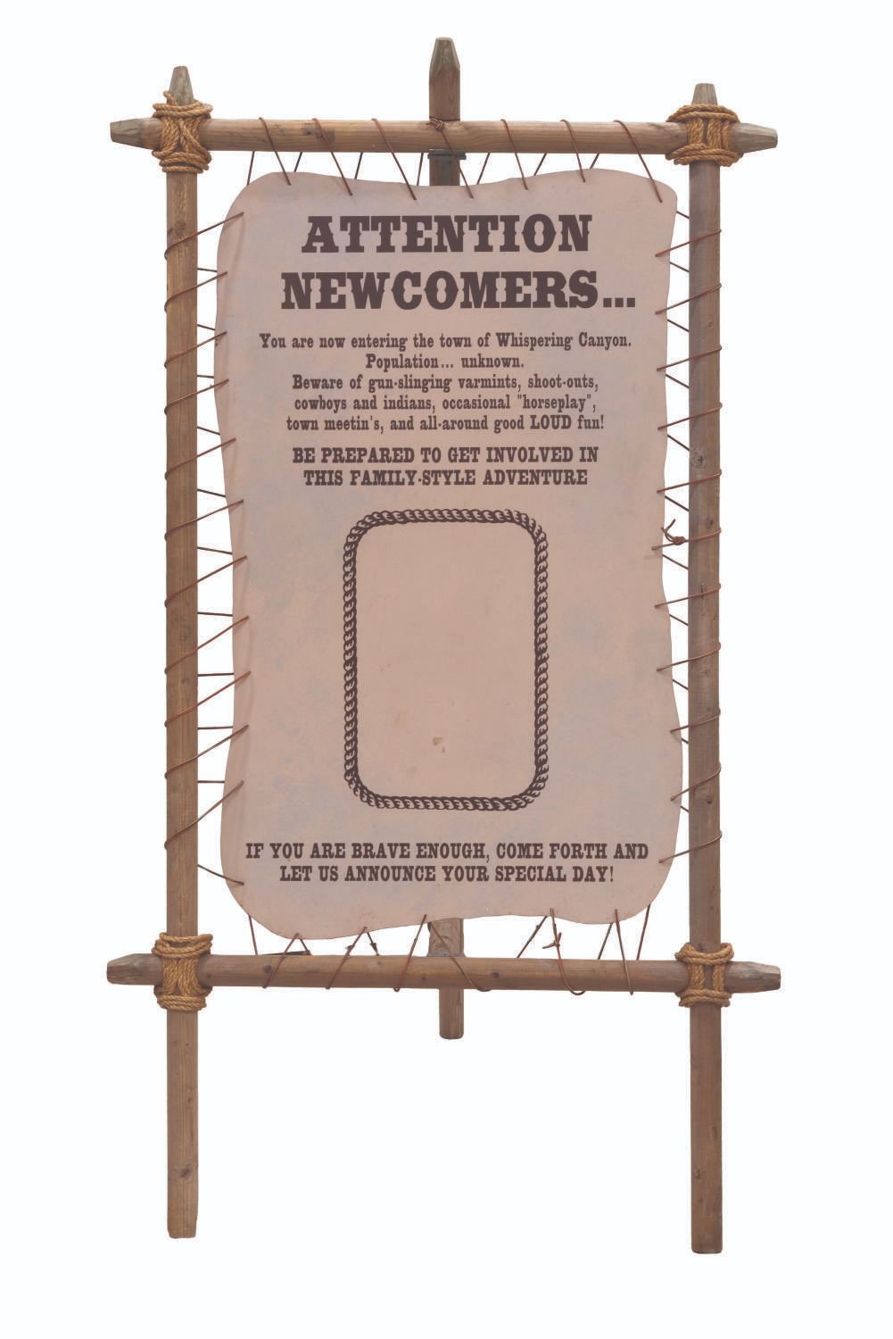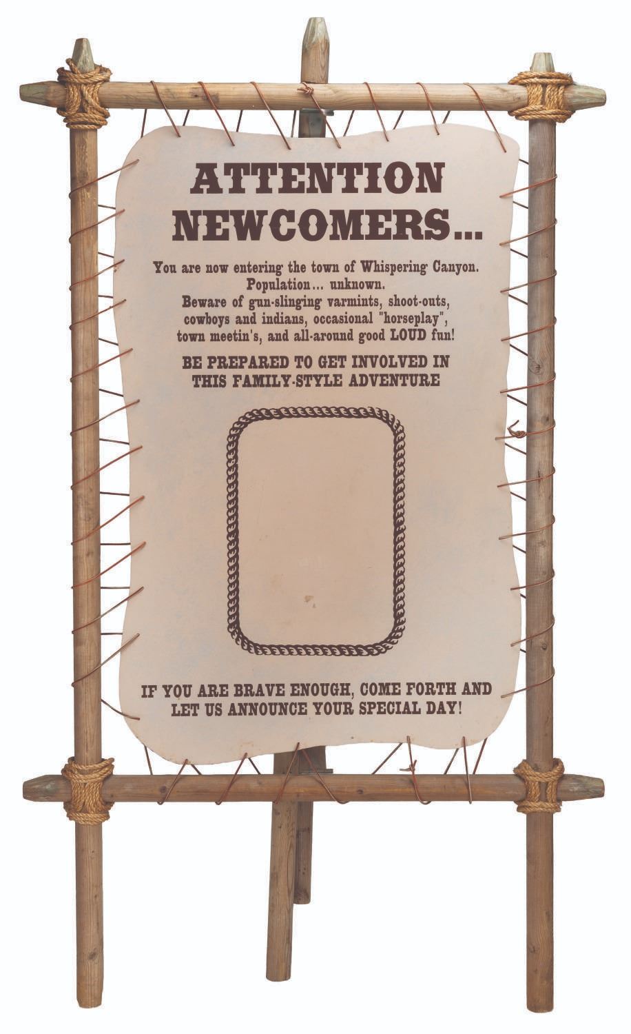 (Disney's Wilderness Lodge, 1994-2000s) A tripod welcome sign from the Whispering Canyon Cafe at Disney's Wilderness Lodge. The rowdy interactive restaurant features barbecue food, interactive experiences, and sassy servers. Measuring 33" x 40" x 72", the canvas and wood sign displays in very good condition with intentional distress, scratches, cracks, stains, adhesive residue, and wear from Resort use. This item requires special shipping arrangements. Please inquire before bidding.