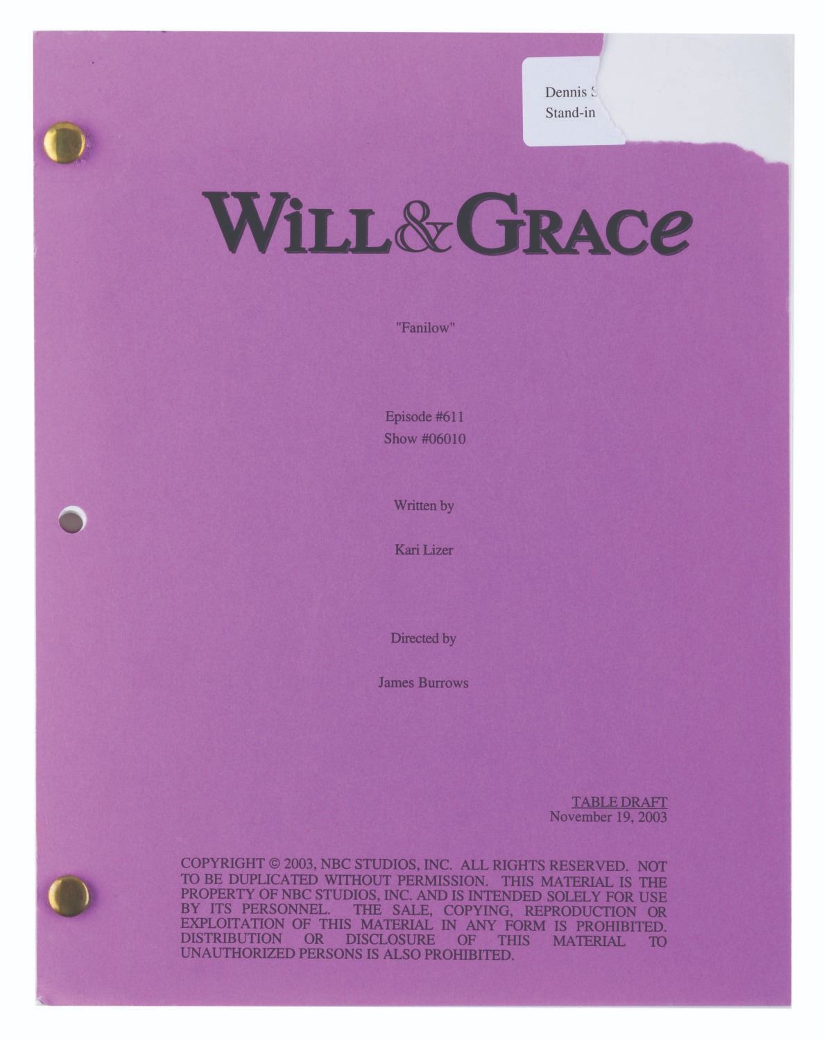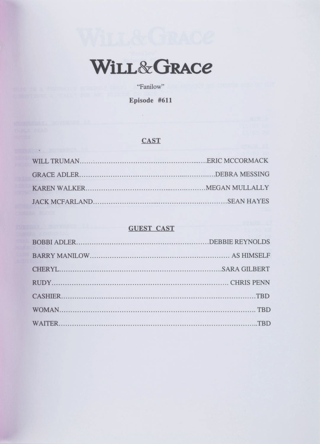 (NBC, 2003) A script for the “Will & Grace” sixth season episode “Fanilow” featuring guest star Barry Manilow as himself. This script belonged to a stand-in named Dennis, with part of the identifying sticker remaining on the cover. Measuring 8.5” x 11”, the script is in very good condition despite a 1.25” x 2.25” tear at the top right corner of the cover and light wear from production use.