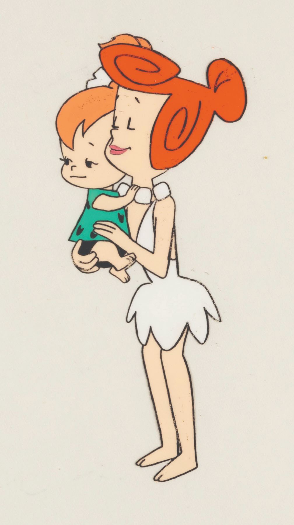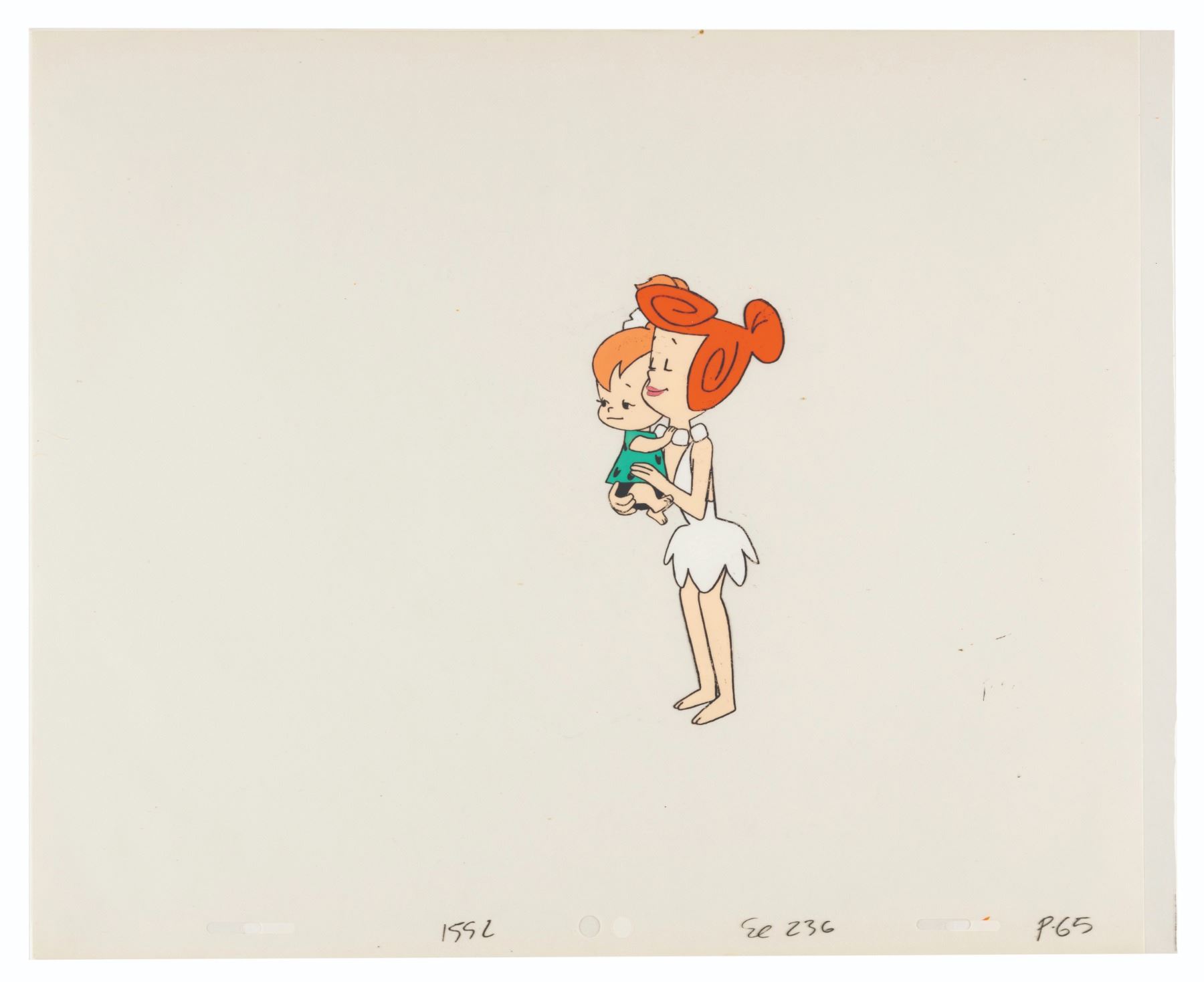 (Hanna-Barbera, 1960s-80s) An original hand-painted production cel of Wilma and Pebbles from “The Flintstones.” Measuring 10.5” x 12.5” with a character image size of 5” x 2.25”, the cel is in good condition with a 0.25” tear to the left edge, light line loss, and light paint residue from contact with another cel.