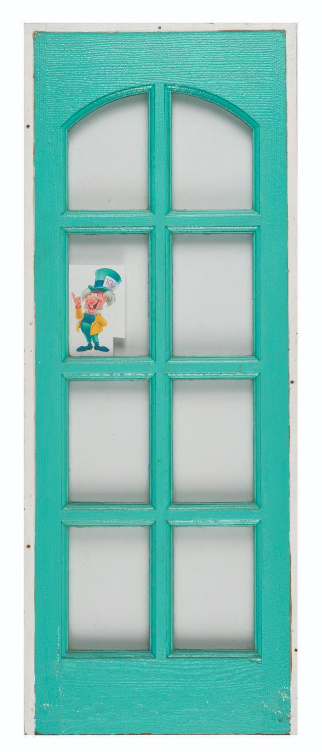 (Disneyland, 1980s) A window frame from Fantasyland's Mad Hatter Shop. The Shop was completely redesigned in 1983, with this window removed during a later refurbishment. Measuring 20" x 2" x 51.75" high with each panel of glass 6" x 9", the window is in very good condition with typical wear from Park use.