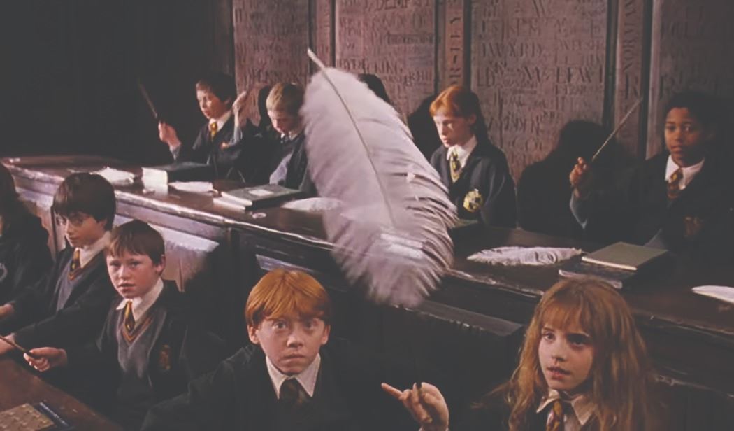 (Warner Bros., 2001) A hero prop feather from Harry Potter and the Sorcerer's Stone. When Harry and his classmates are learning the Wingardium Leviosa levitating spell, each has two of these ostrich feathers to practice on. Measuring 8.5"x12.5", the feather is in fine production-used condition.