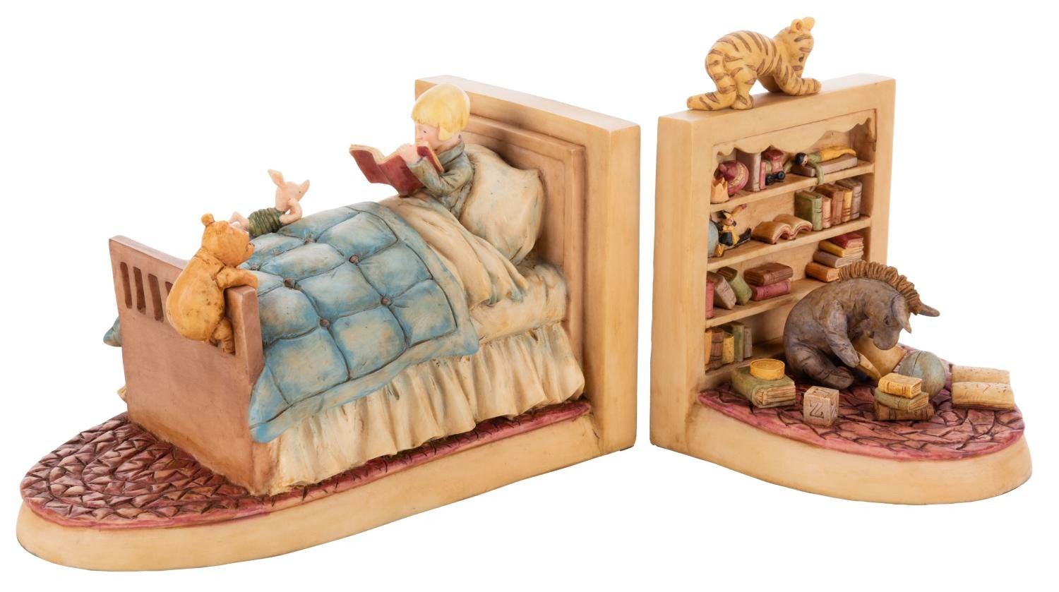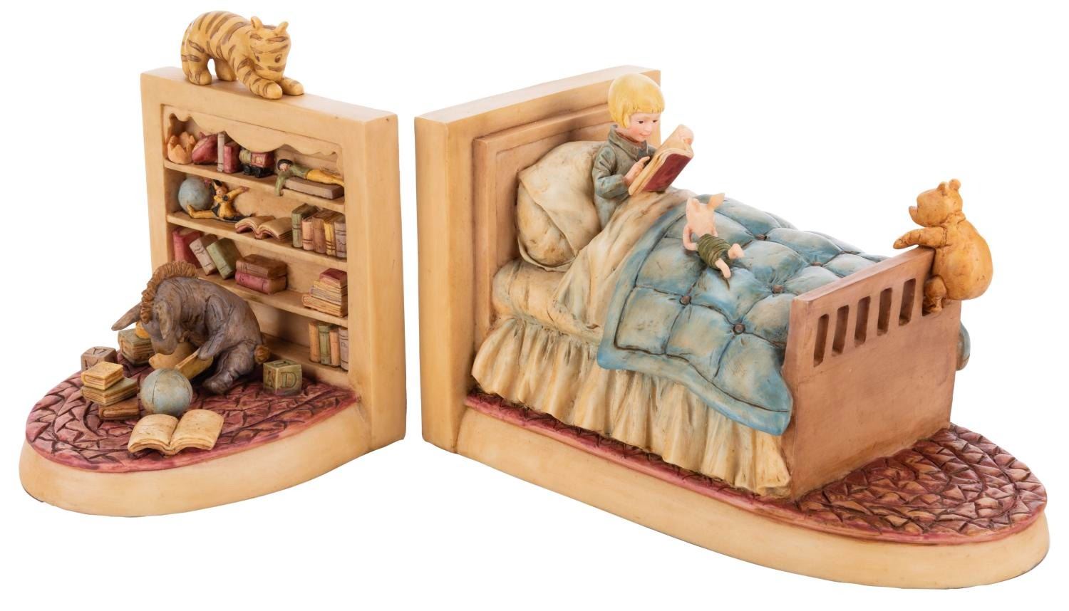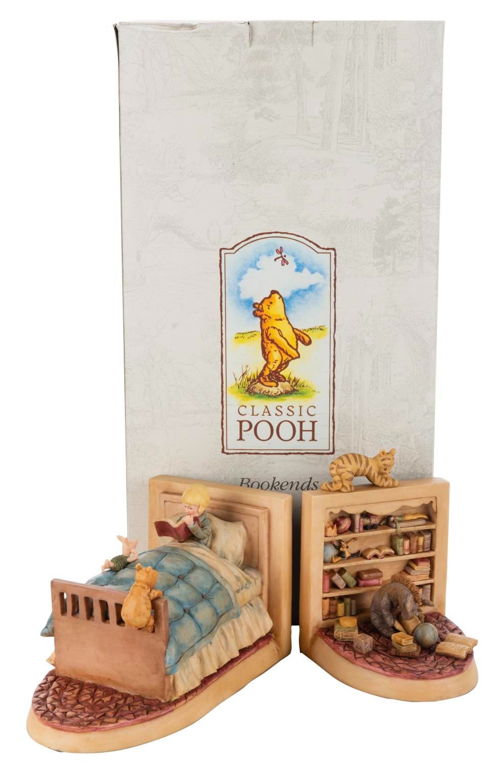 (Michel and Co., 1990s) A set of bookends inspired by the E.H Shepard illustrations for Winnie the Pooh, featuring Pooh, Piglet, Tigger, Eeyore, and Christopher Robin. Ranging in size from 5" x 5" x 6.5" to 9" x 5" x 5.25" tall in their 10.25" x 7.5" x 19.25" tall original box, the bookends are in fine condition.