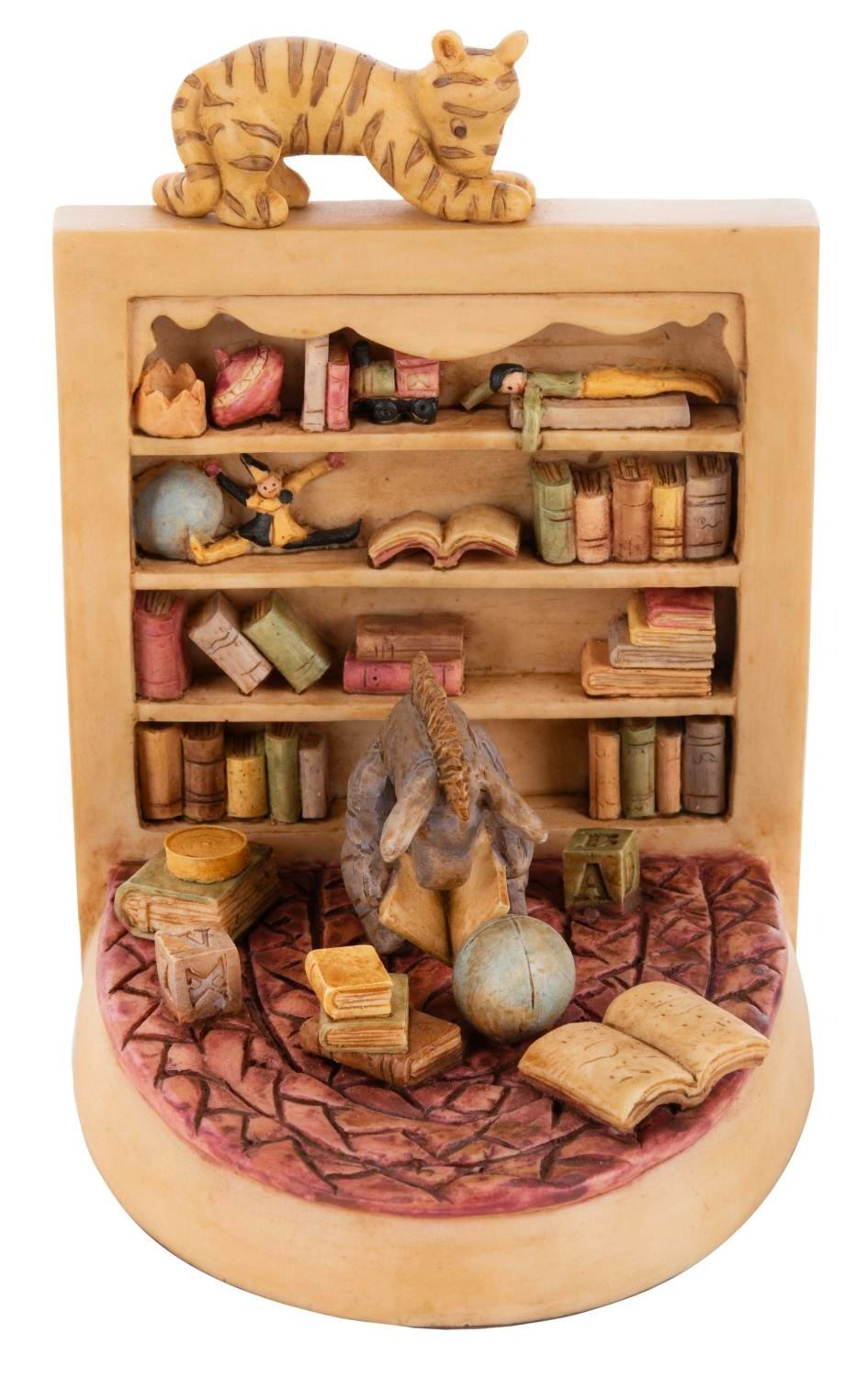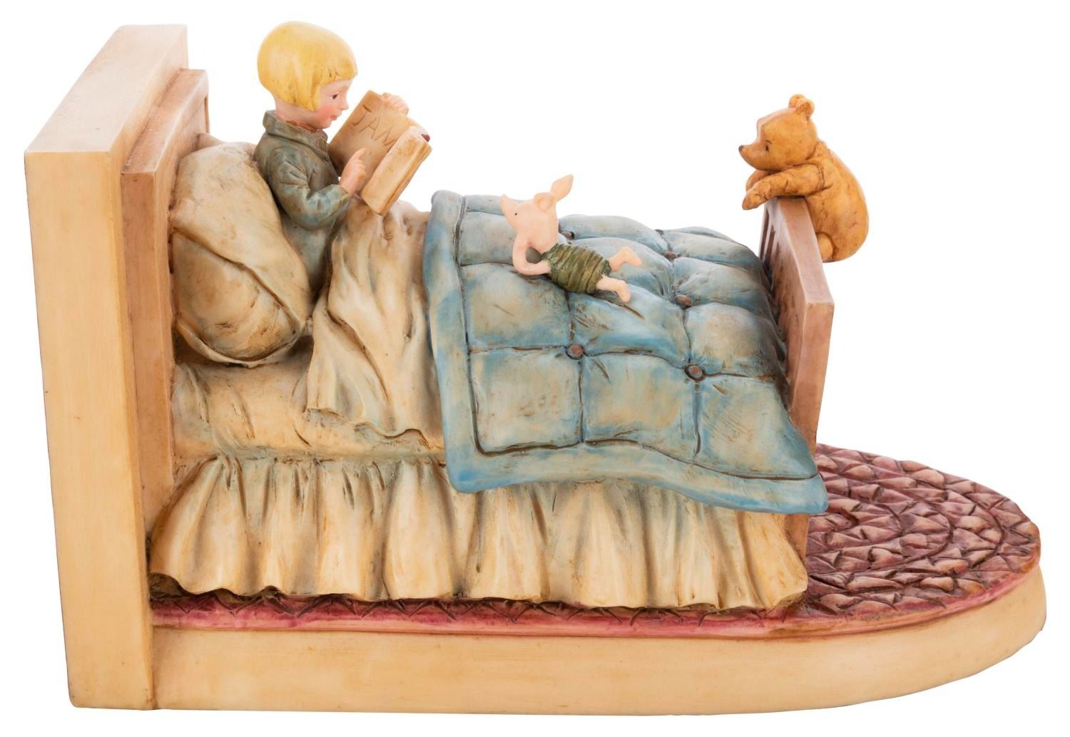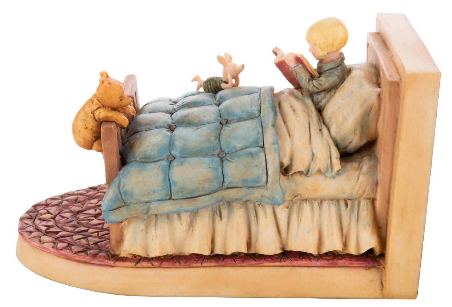 (Michel and Co., 1990s) A set of bookends inspired by the E.H Shepard illustrations for Winnie the Pooh, featuring Pooh, Piglet, Tigger, Eeyore, and Christopher Robin. Ranging in size from 5" x 5" x 6.5" to 9" x 5" x 5.25" tall in their 10.25" x 7.5" x 19.25" tall original box, the bookends are in fine condition.
