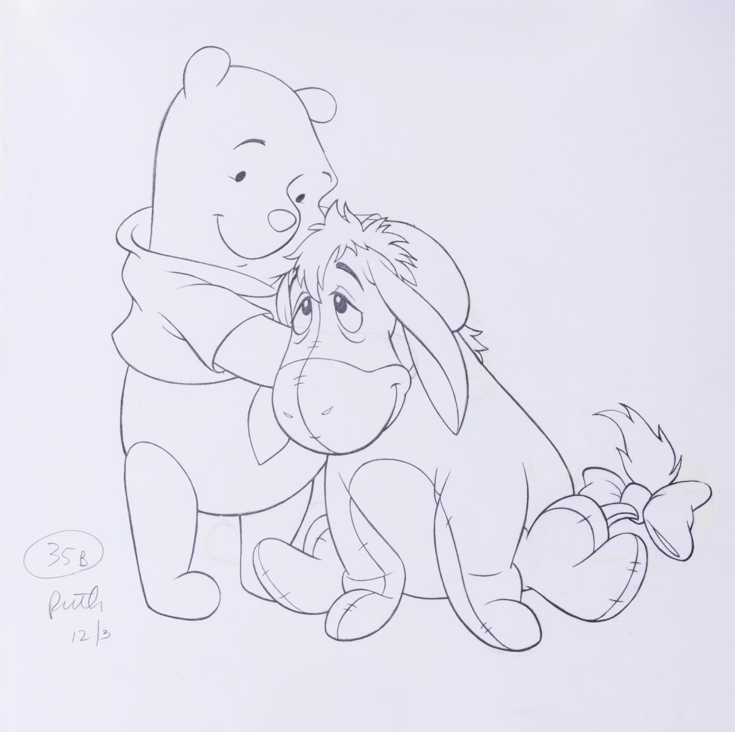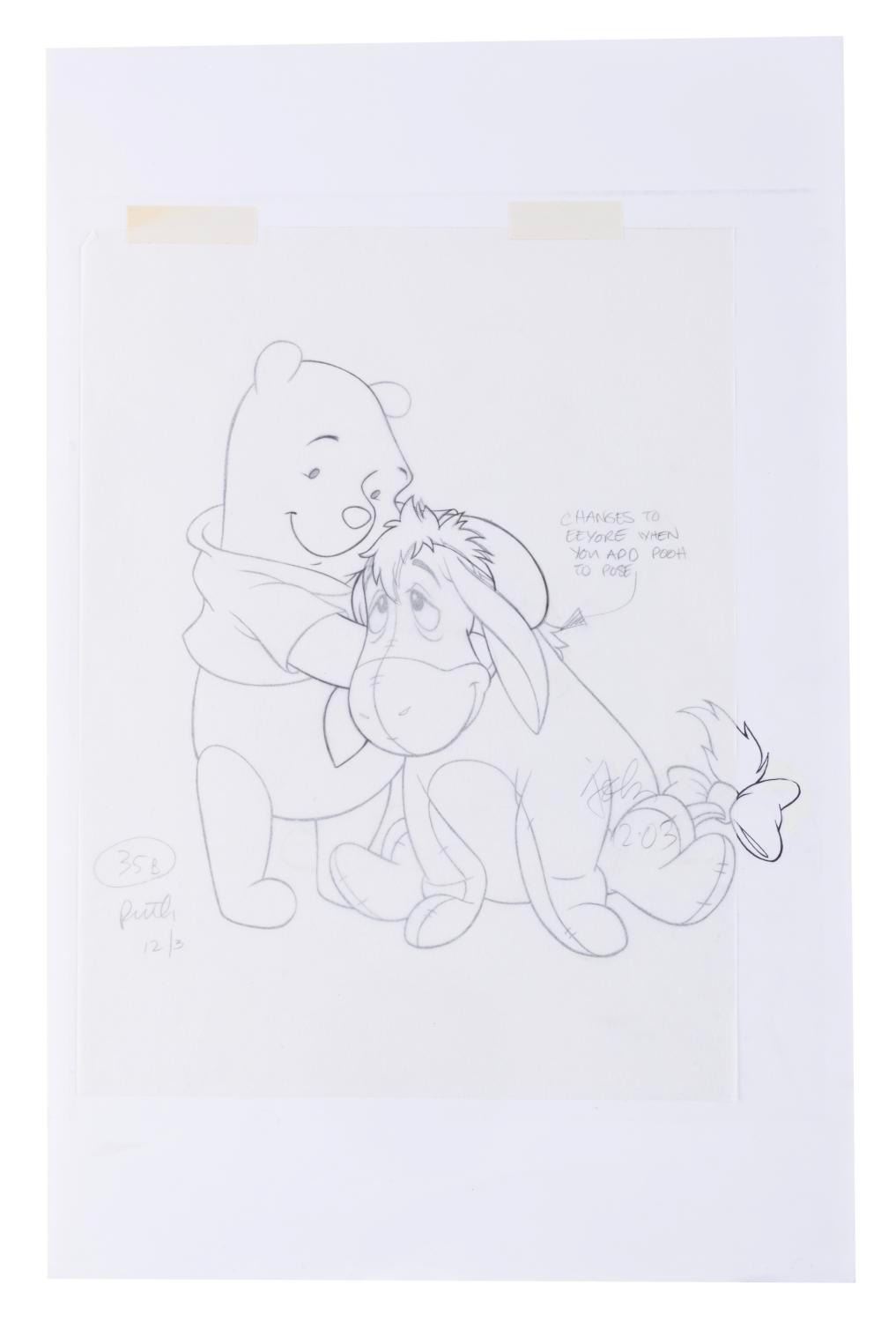 (Disney, 1990s-2000s) An original drawing of Winnie the Pooh and Eeyore, likely used for merchandising purposes. With a character image size of 8.25” x 8.75” on 11” x 17” animation paper, the graphite drawing is in very good condition with light smudging from production use.