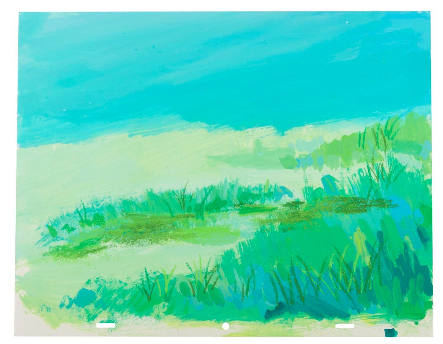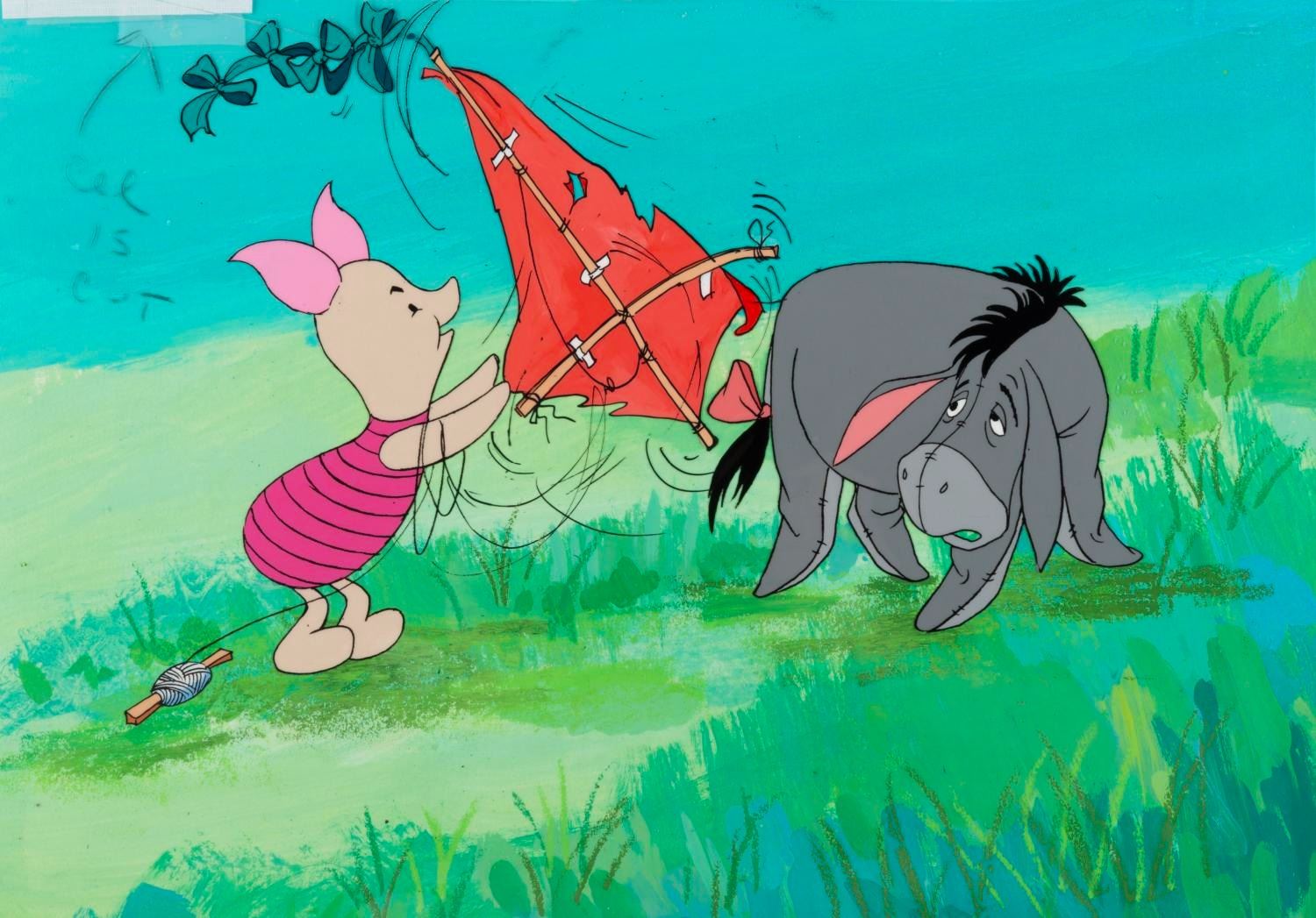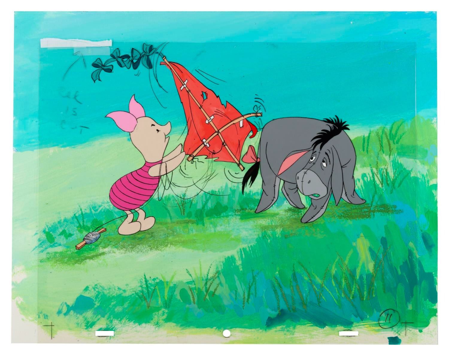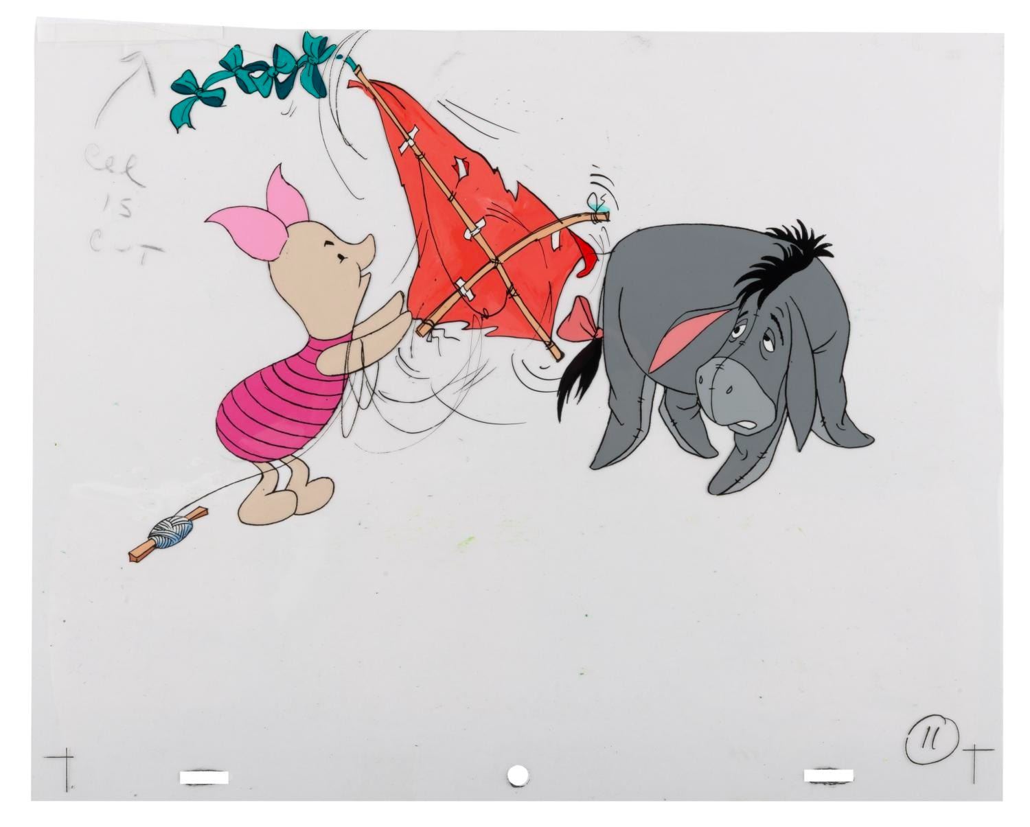 (Disney, 1970s-80s) A production cel of Piglet and Eeyore from one of Disney’s "Winnie the Pooh " adaptations, paired with a hand-painted background from an unknown production. Piglet and Eeyore measure 7 " x 9.5 " on a 10 " x 12.5 " cel. The entire piece, with background, measures 11 " x 14 " and displays in good condition with light smudges, soiling, edge wear, and adhesive tape from previous mounting.