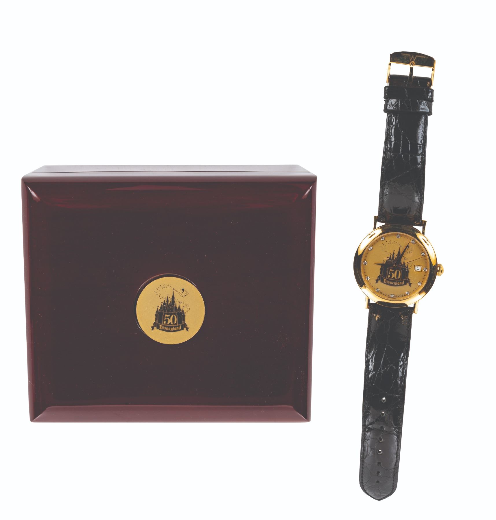 (Disneyland, 2005) A rare Wittnauer wristwatch produced exclusively for the 50th anniversary of Disneyland. Numbered "3" out of only 50 made, the men's style 18K yellow gold watch features diamond hour markers under a 28mm water-resistant and scratch-resistant sapphire crystal. The watch comes complete with an owner’s Guide, COA, and other materials enclosed inside a wooden box. The watch, accessories, and box are in fine condition.