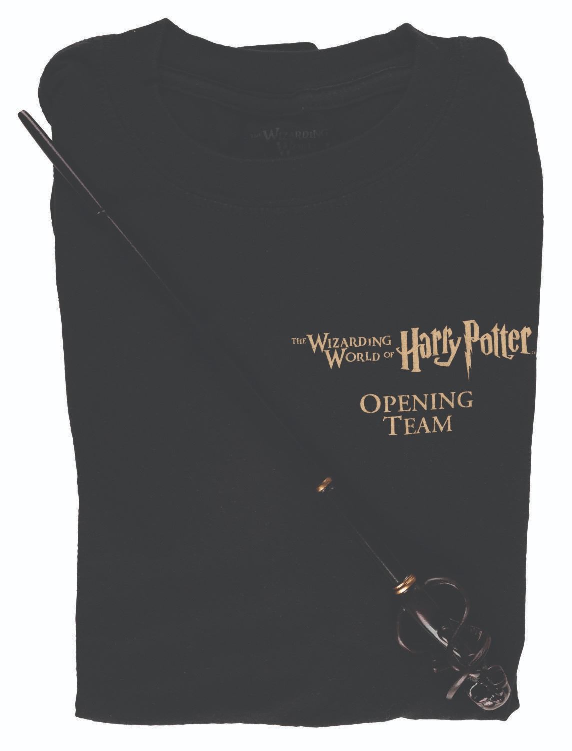 (Universal Studios Hollywood, 2016) An opening team shirt and Death Eater wand from The Wizarding World of Harry Potter. The immersive land has been well-received by guests and critics alike, transporting Muggles into the world of the Harry Potter films. The shirt is labeled a size S and the wand measures 13.5” long, in very good to fine condition with light wear.