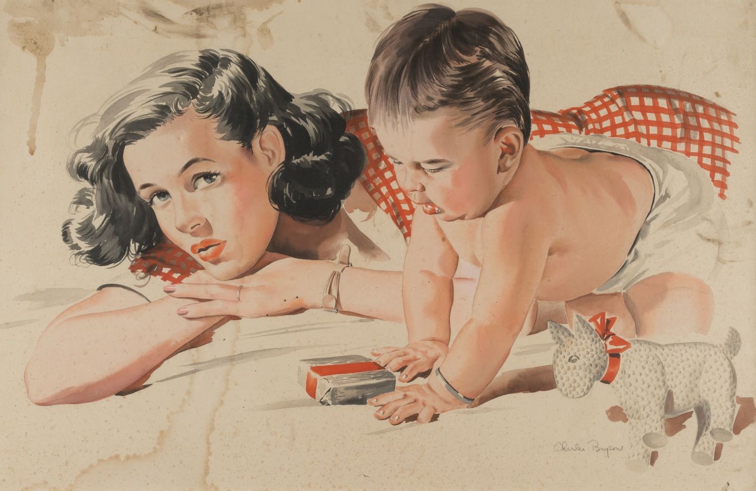 (Bryson, 1940s-50s) An original watercolor painting of a woman and baby, signed by artist Charles Bryson. This image was most likely created for a cigarette campaign, due to the carton at center. Measuring 21.5"x14", the piece is in fair condition, with spotting, staining, and light smudges.