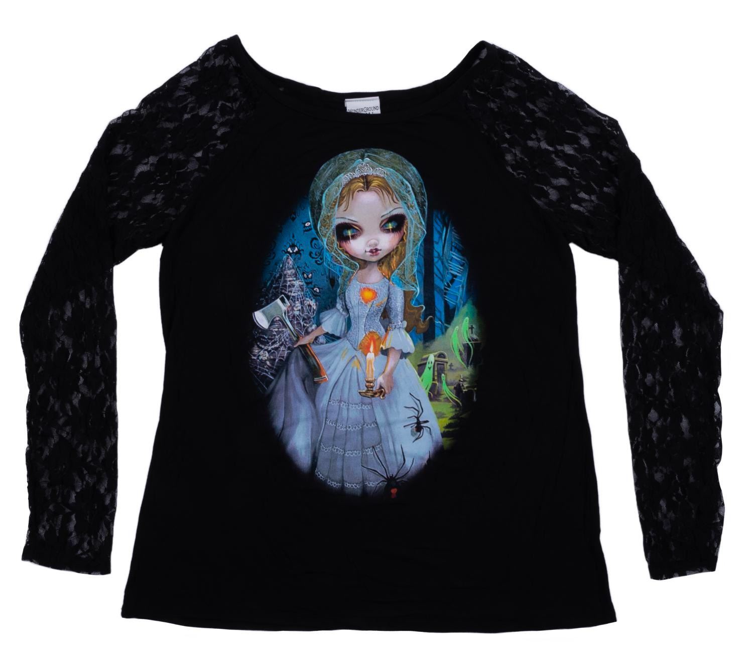 (Walt Disney World) A WonderGround Haunted Mansion Bride Blouse featuring the Axe Bride as depicted by Disney Artist Jasmine Becket-Griffith, with lace accents. Measuring size XL, the blouse is in fine condition.